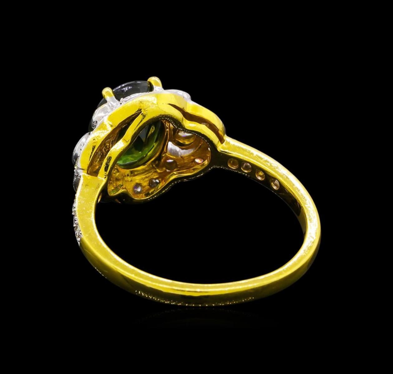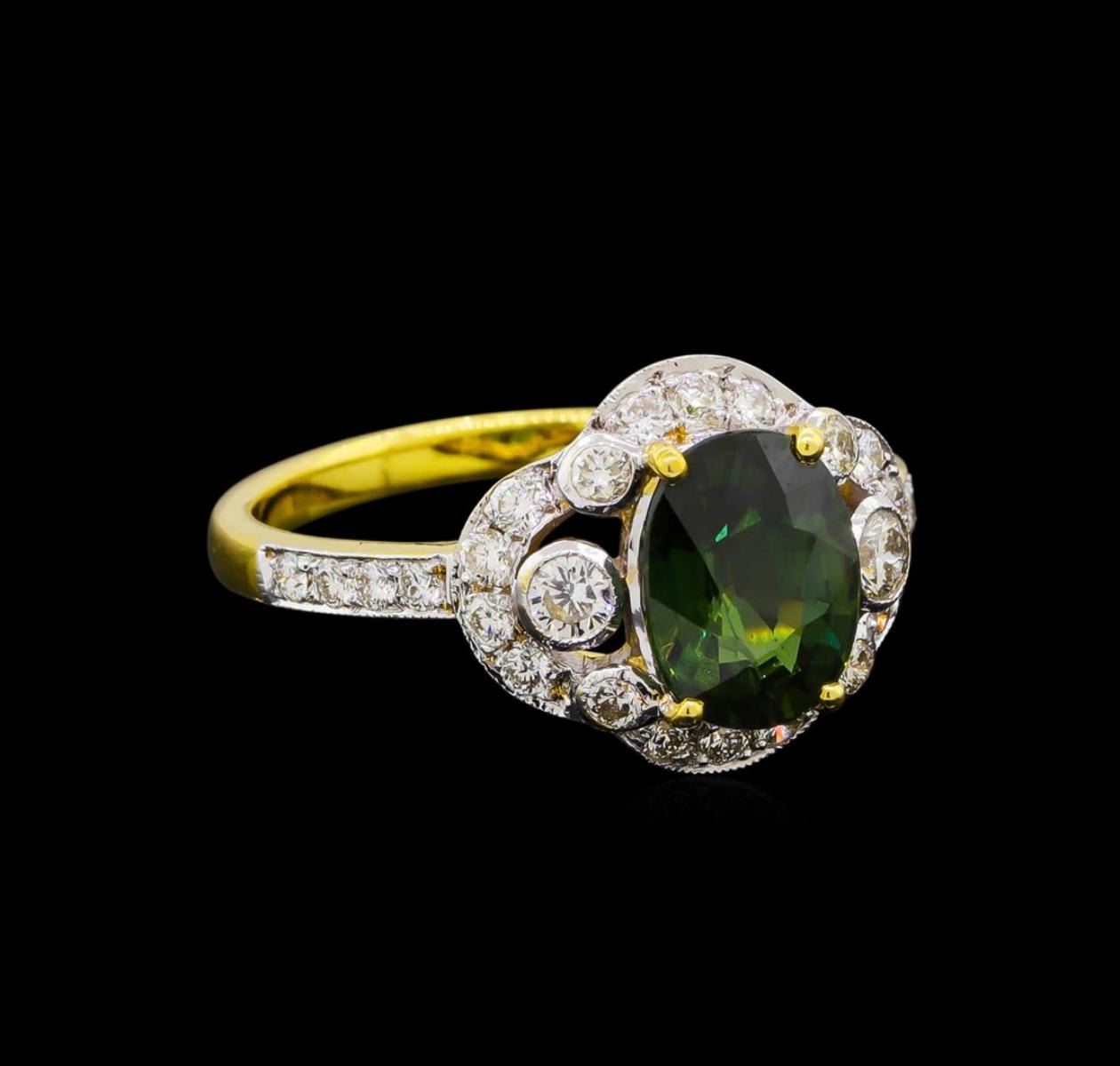 One electronically tested 18KT yellow gold ladies cast green sapphire and diamond ring. The featured green sapphire is set within a stylized diamond bezel supported by diamond set shoulders, completed by a two millimeter wide band. Bright polish finish with rhodium accents. Condition is good. Containing: One prong set oval mixed cut natural green sapphire, measuring 9.10 x 7.00. x 4.50mm, approximate weight of 2.45ct., clarity is slightly included, type II, dark, very slightly grayish, green color, (GIA G 7/3), cut is good. Transmitting light with a minimum of distortion, transparent. Naturally occurring internal & external characteristics are present. Graded in the setting. Two bezel set round brilliant cut diamonds, measuring 2.20 - 2.20 x 1.32mm (depth est.) approximate total weight of 2 Stones = 0.08ct. Graded in the setting. Clarity: VS-2 to SI-1 . Color: H - I Four bezel set round brilliant cut diamonds, measuring 2.00. - 1.90 x 1.17mm (depth est.) approximate total weight of 4 Stones = 0.11ct. Graded in the setting. Clarity: VS-2 to SI-1 . Color: I - J Fourteen prong set round brilliant cut diamonds, measuring 2.80 - 1.70 x 1.35mm (depth est.) approximate total weight of 14 Stones = 0.58ct. Graded in the setting. Clarity: VS-2 to SI-2 . Color: G - I Eight prong set round brilliant cut diamonds, measuring 1.60 - 1.50 x 0.93mm (depth est.) approximate total weight of 8 Stones = 0.12ct. Graded in the setting. Clarity: VS-2 to SI-2 . Color: G - I. Total Weight of Colored Stones 2.45ct.. Total Weight of Diamonds 0.89ct.. Total Weight of Ring 5.11gm. AIG Appraised.