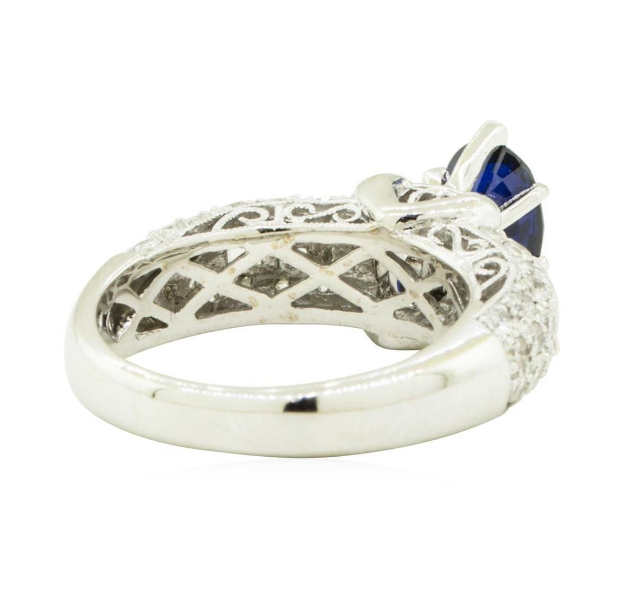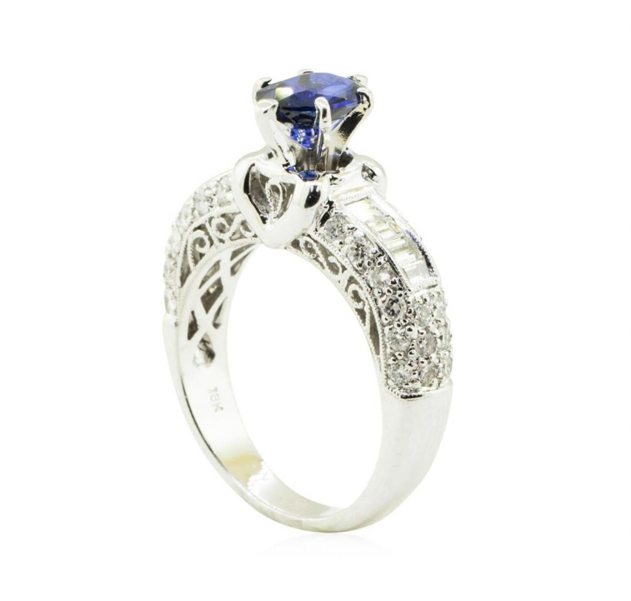 One electronically tested 18KT white gold lady's combination cast & assembled fashion vintage straight line ring with a cathedral shoulders on shank with a bright polish with milgrain detailing finish. The featured lady's ring has a shank measuring 3.50 millimeters in width. Identified with markings of '18K'. Condition is new, good workmanship. Containing: One prong set oval modified mixed cut natural blue sapphire, measuring 7.70 x 5.90 x 3.35mm, (depth est.) 5%. bulge factor, approximate weight of 1.38ct., clarity is eye clean, medium dark, strong, violetish blue color, (GIA vB 6/5), cut is very good. Transmitting light with a minimum of distortion, transparent. Colored gemstones are presumed to have been subjected to commonly used enhancement processes. Graded in the setting. Eight channel set baguette cut diamonds, measuring from 2.30 x 1.60 x 1.36mm (depth est.) to 2.60 x 1.80 x 1.53mm (depth est.) approximate total weight of 8 Stones = 0.44ct. Graded in the setting. Color G - H Clarity SI-1 to SI-2 Cut Good Thirty-Six prong set round brilliant cut diamonds, measuring 1.70 - 1.65 x 1.02mm (depth est.) approximate total weight of 36 Stones = 0.63ct. Graded in the setting. Color H - I Clarity SI-1 to I-1 Cut Good. Total Weight of Colored Stones 1.38ct.. Total Weight of Diamonds 1.07ct.. Total Weight of Straight Line Ring 9.70gm GAS Appraised at $7550.00. GAS Appraised.