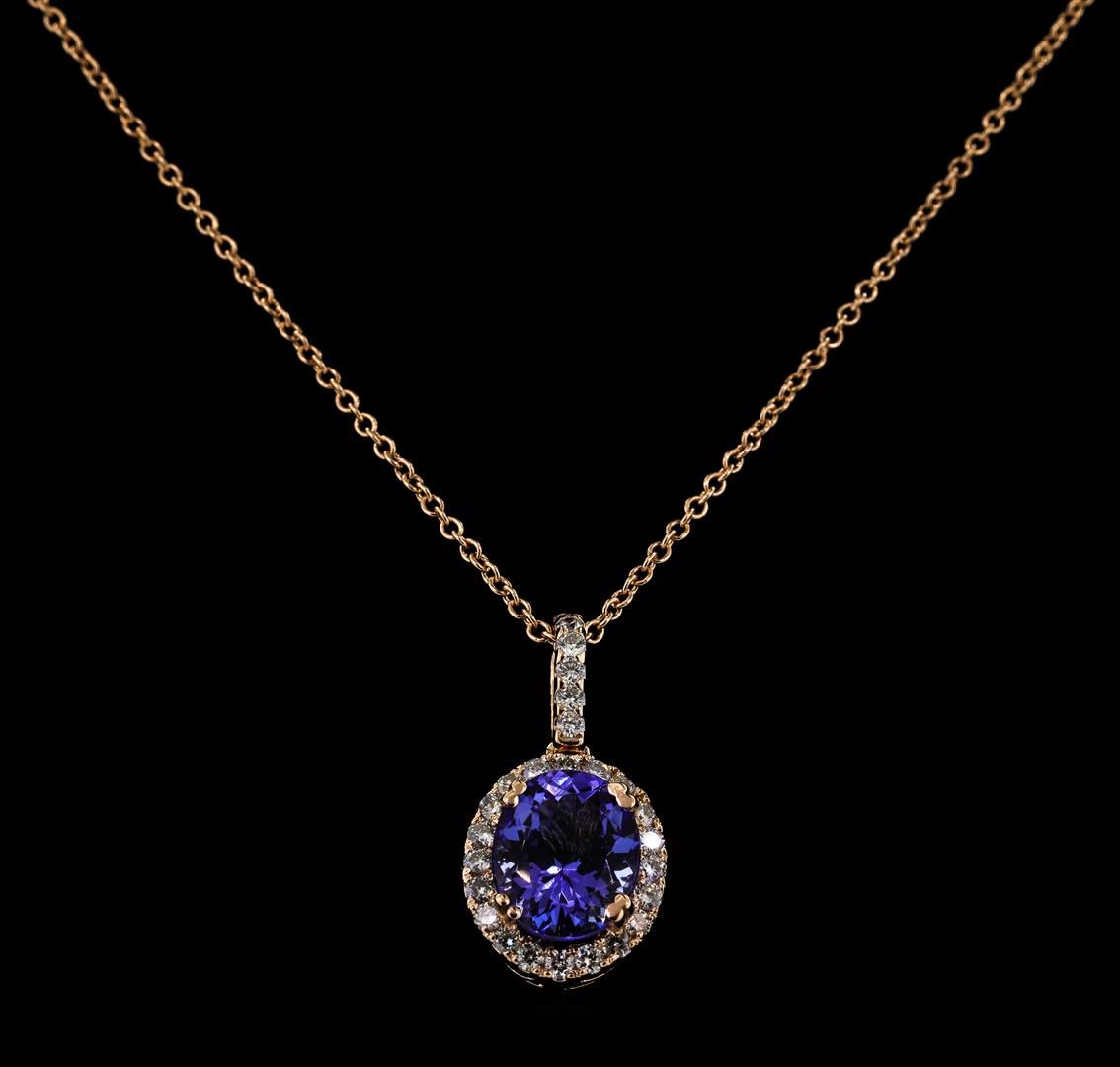 One Tanzanite and Diamond Pendant with Chain including: 14KT Rose Gold weighing a total of 2.00 grams, Tanzanite weighing a total of 2.46ct, and 26 Diamonds weighing a total of 0.35ctw.