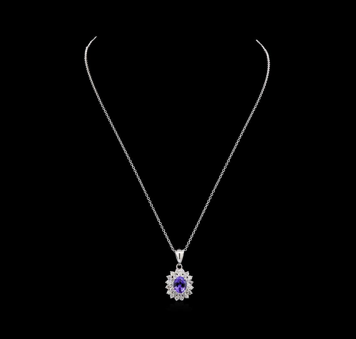 One electronically tested 14KT white gold lady's combination cast & assembled fashion pendant & chain 18.0" long, 1.5 round cable link with a lobster claw clasp with a double halo with a bright polish finish. Identified with markings of "14K". Condition is new, good workmanship. Containing: One diamond(depth est.) approximate weight of 0.00ct. One prong set oval modified brilliant cut natural tanzanite, measuring 9.42 x 7.50 x 5.19mm, (depth est.) approximate weight of 2.48ct., clarity is eye clean, medium dark, moderately strong, bluish violet color, (GIA bV 6/4), cut is very good. Transmitting light with no distortion, transparent. Colored gemstones are presumed to have been subjected to commonly used enhancement processes. Graded in the setting. Twenty-Eight prong set round brilliant cut diamonds, measuring 2.40 - 2.30 x 1.46mm (depth est.) approximate total weight of 28 Stones = 1.35ct. Graded in the setting. Clarity: SI-1 to SI-2. Color: H - I. Cut Good. Total Weight of Colored Stones 2.48ct. Total Weight of Diamonds 1.35ct. Total Weight of Pendant & Chain 7.60gm. GAS Appraised.