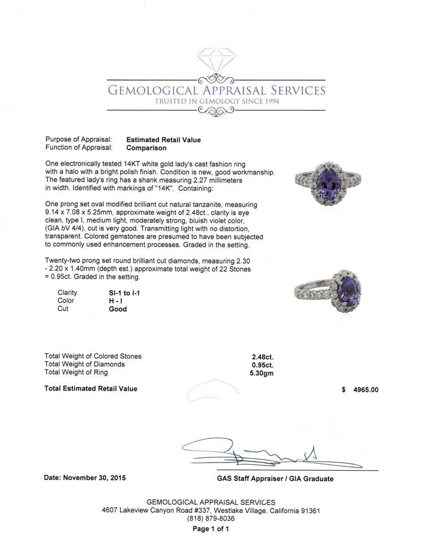 One electronically tested 14KT white gold lady's cast fashion ring with a halo with a bright polish finish. The featured lady's ring has a shank measuring 2.27 millimeters in width. Identified with markings of "14K". Condition is new, good workmanship. Containing: One prong set oval modified brilliant cut natural tanzanite, measuring 9.14 x 7.08 x 5.25mm, approximate weight of 2.48ct., clarity is eye clean, type I, medium light, moderately strong, bluish violet color, (GIA bV 4/4), cut is very good. Transmitting light with no distortion, transparent. Colored gemstones are presumed to have been subjected to commonly used enhancement processes. Graded in the setting. Twenty-Two prong set round brilliant cut diamonds, measuring 2.30 - 2.20 x 1.40mm (depth est.) approximate total weight of 22 Stones = 0.95ct. Graded in the setting. Clarity: SI-1 to I-1 . Color: H - I. Cut Good. Total Weight of Colored Stones 2.48ct.. Total Weight of Diamonds 0.95ct.. Total Weight of Ring 5.30gm at $ 4965.00