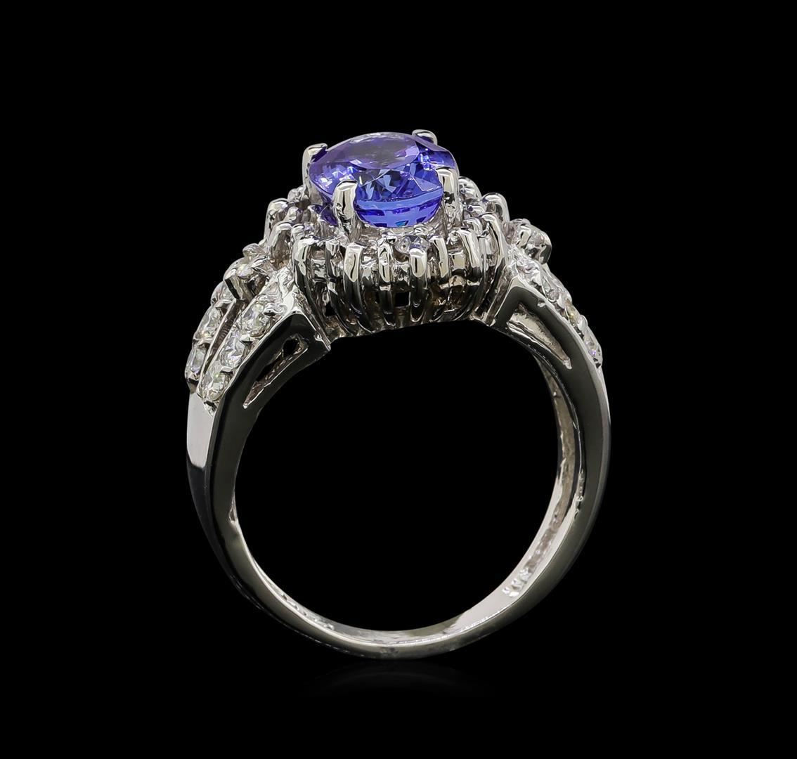 One electronically tested 14KT white gold lady's cast fashion ring with a split shank basket halo with a bright polish finish. The featured lady's ring has a shank measuring 2.23 millimeters wide. Identified with markings of '14K'. Condition is new, good workmanship. Containing: One prong set oval modified brilliant cut natural tanzanite, measuring 9.16 x 7.28 x 5.29mm, (depth est.) approximate weight of 2.48ct., clarity is eye clean, medium, moderately strong, violetish blue color, (GIA vB 5/4), cut is very good. Transmitting light with no distortion, transparent. Colored gemstones are presumed to have been subjected to commonly used enhancement processes. Graded in the setting. Twelve prong set round brilliant cut diamonds, measuring 2.10 - 2.00 x 1.27mm (depth est.) approximate total weight of 12 Stones = 0.40ct. Graded in the setting. Clarity SI-1 to SI-2. Color: H - I Cut Good Fourteen prong set round brilliant cut diamonds, measuring 1.80 - 1.70 x 1.09mm (depth est.) approximate total weight of 14 Stones = 0.28ct. Graded in the setting. Clarity SI-1 to I-1. Color: H - I Cut Good. Total Weight of Colored Stones 2.48ct.. Total Weight of Diamonds 0.68ct.. Total Weight of Ring 7.00gm GAS Appraised.