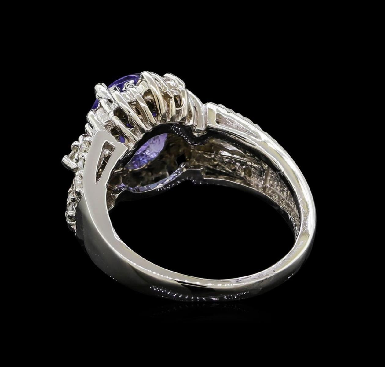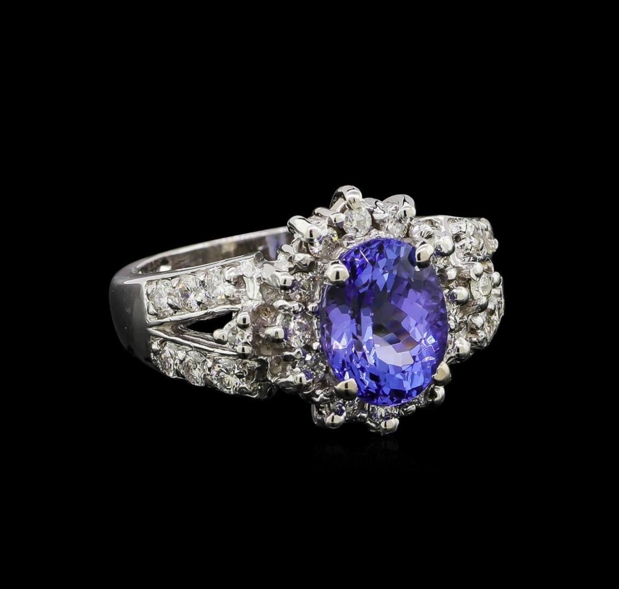One electronically tested 14KT white gold lady's cast fashion ring with a split shank basket halo with a bright polish finish. The featured lady's ring has a shank measuring 2.23 millimeters wide. Identified with markings of '14K'. Condition is new, good workmanship. Containing: One prong set oval modified brilliant cut natural tanzanite, measuring 9.16 x 7.28 x 5.29mm, (depth est.) approximate weight of 2.48ct., clarity is eye clean, medium, moderately strong, violetish blue color, (GIA vB 5/4), cut is very good. Transmitting light with no distortion, transparent. Colored gemstones are presumed to have been subjected to commonly used enhancement processes. Graded in the setting. Twelve prong set round brilliant cut diamonds, measuring 2.10 - 2.00 x 1.27mm (depth est.) approximate total weight of 12 Stones = 0.40ct. Graded in the setting. Clarity SI-1 to SI-2. Color: H - I Cut Good Fourteen prong set round brilliant cut diamonds, measuring 1.80 - 1.70 x 1.09mm (depth est.) approximate total weight of 14 Stones = 0.28ct. Graded in the setting. Clarity SI-1 to I-1. Color: H - I Cut Good. Total Weight of Colored Stones 2.48ct.. Total Weight of Diamonds 0.68ct.. Total Weight of Ring 7.00gm GAS Appraised.