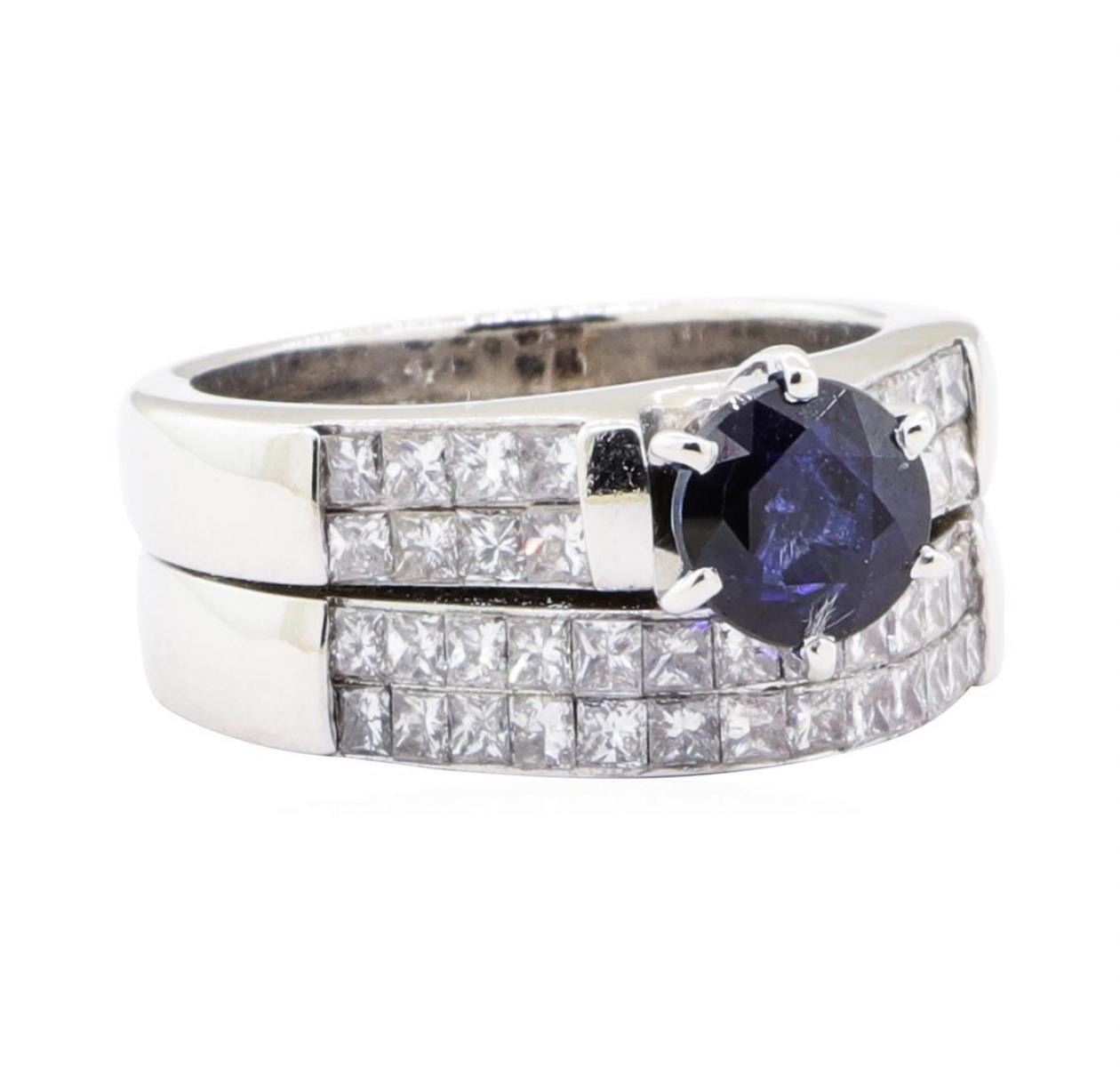 One set electronically tested 18KT white gold lady's combination cast & assembled fashion ring and attached band with a cathedral shank with a bright polish finish. The featured lady's ring has a double shank measuring 6.00 millimeters wide. Identified with markings of '18K'. Condition is Good. Containing: One prong set round modified mixed cut natural blue sapphire, measuring 5.95 - 5.85 x 3.84 mm, (depth est.) 8%. bulge factor, approximate weight of 1.19ct., clarity is eye clean, dark, moderately strong, blue color, (GIA B 7/4), cut is good. Transmitting light with no distortion, transparent. Colored gemstones are presumed to have been subjected to commonly used enhancement processes. Graded in the setting. Forty-Two invisible set princess cut diamonds, measuring 1.70 x 1.65 x 1.24mm (depth est.) approximate total weight of 42 Stones = 1.30ct. Graded in the setting. Color H - I Clarity SI-1 to SI-2 Cut Good. Total Weight of Colored Stones 1.19ct.. Total Weight of Diamonds 1.30ct.. Total Weight of Ring And Attached Band 10.30gm GAS Appraised at $5520.00. GAS Appraised.