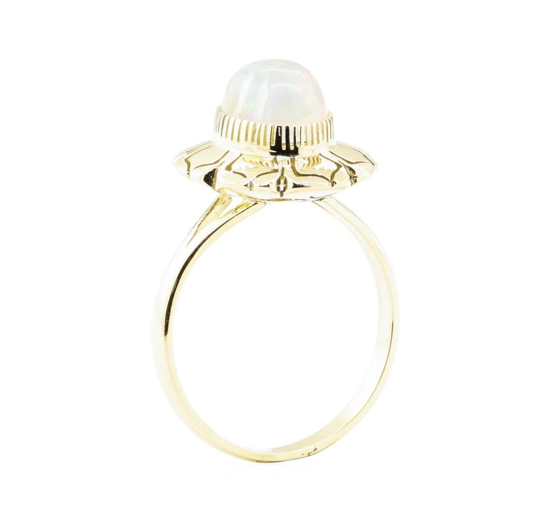 One ring featuring: 14KT yellow gold weighing 6.0 grams containing one oval cabochon crystal opal weighing 2.50 ct.