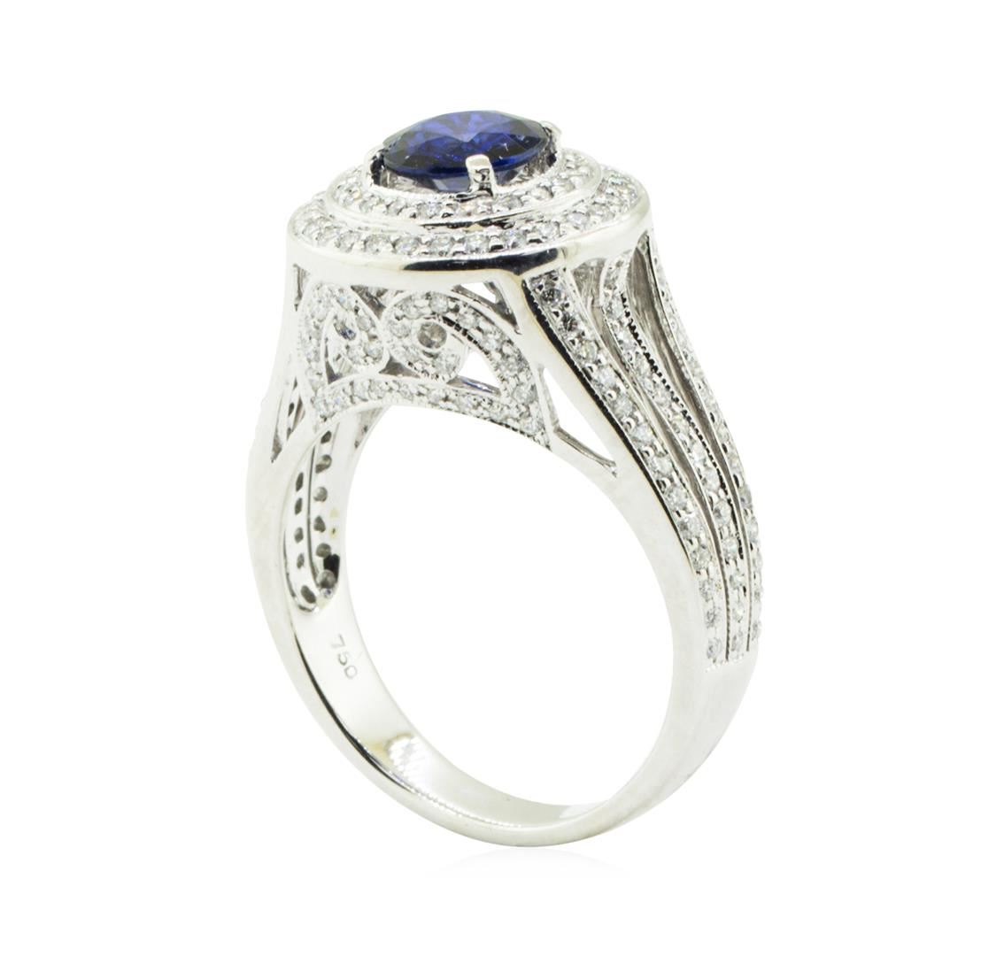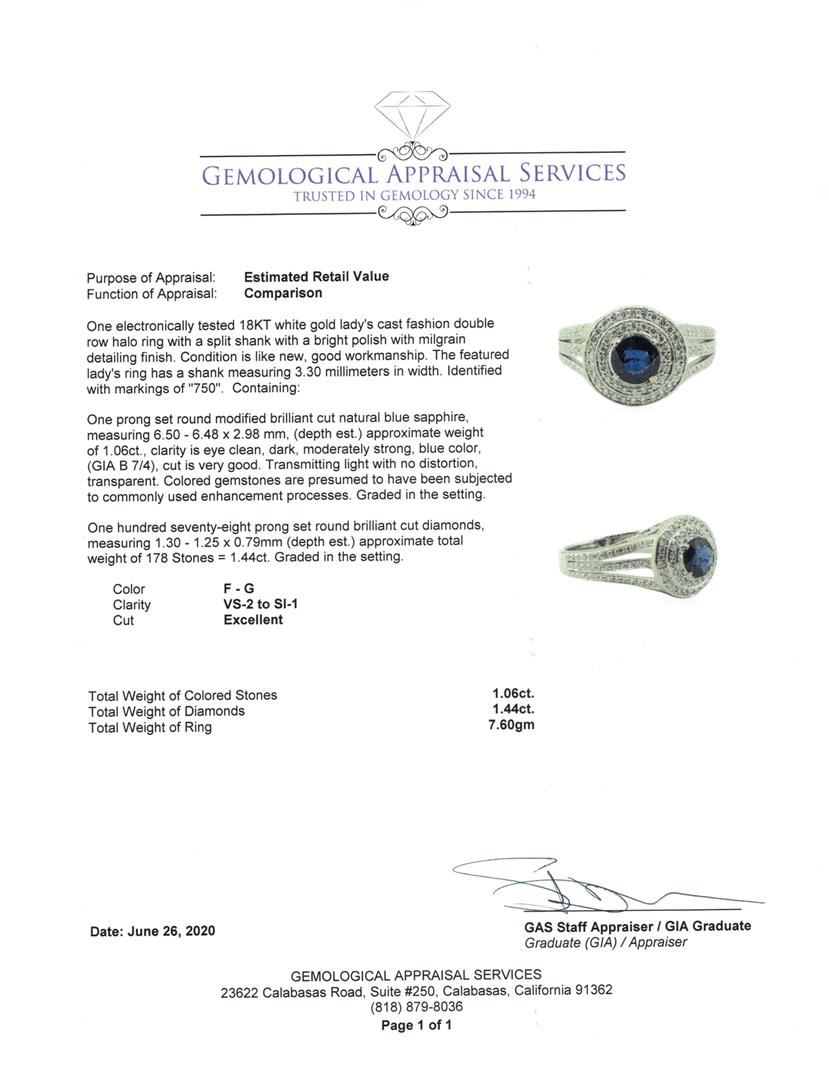 One electronically tested 18KT white gold lady's cast fashion double row halo ring with a split shank with a bright polish with milgrain detailing finish. The featured lady's ring has a shank measuring 3.30 millimeters in width. Identified with markings of '750'. Condition is like new, good workmanship. Containing: One prong set round modified brilliant cut natural blue sapphire, measuring 6.50 - 6.48 x 2.98 mm, (depth est.) approximate weight of 1.06ct., clarity is eye clean, dark, moderately strong, blue color, (GIA B 7/4), cut is very good. Transmitting light with no distortion, transparent. Colored gemstones are presumed to have been subjected to commonly used enhancement processes. Graded in the setting. One Hundred Seventy-Eight prong set round brilliant cut diamonds, measuring 1.30 - 1.25 x 0.79mm (depth est.) approximate total weight of 178 Stones = 1.44ct. Graded in the setting. Color F - G Clarity VS-2 to SI-1 Cut Excellent. Total Weight of Colored Stones 1.06ct.. Total Weight of Diamonds 1.44ct.. Total Weight of Ring 7.60gm GAS Appraised at $8895.00. GAS Appraised.