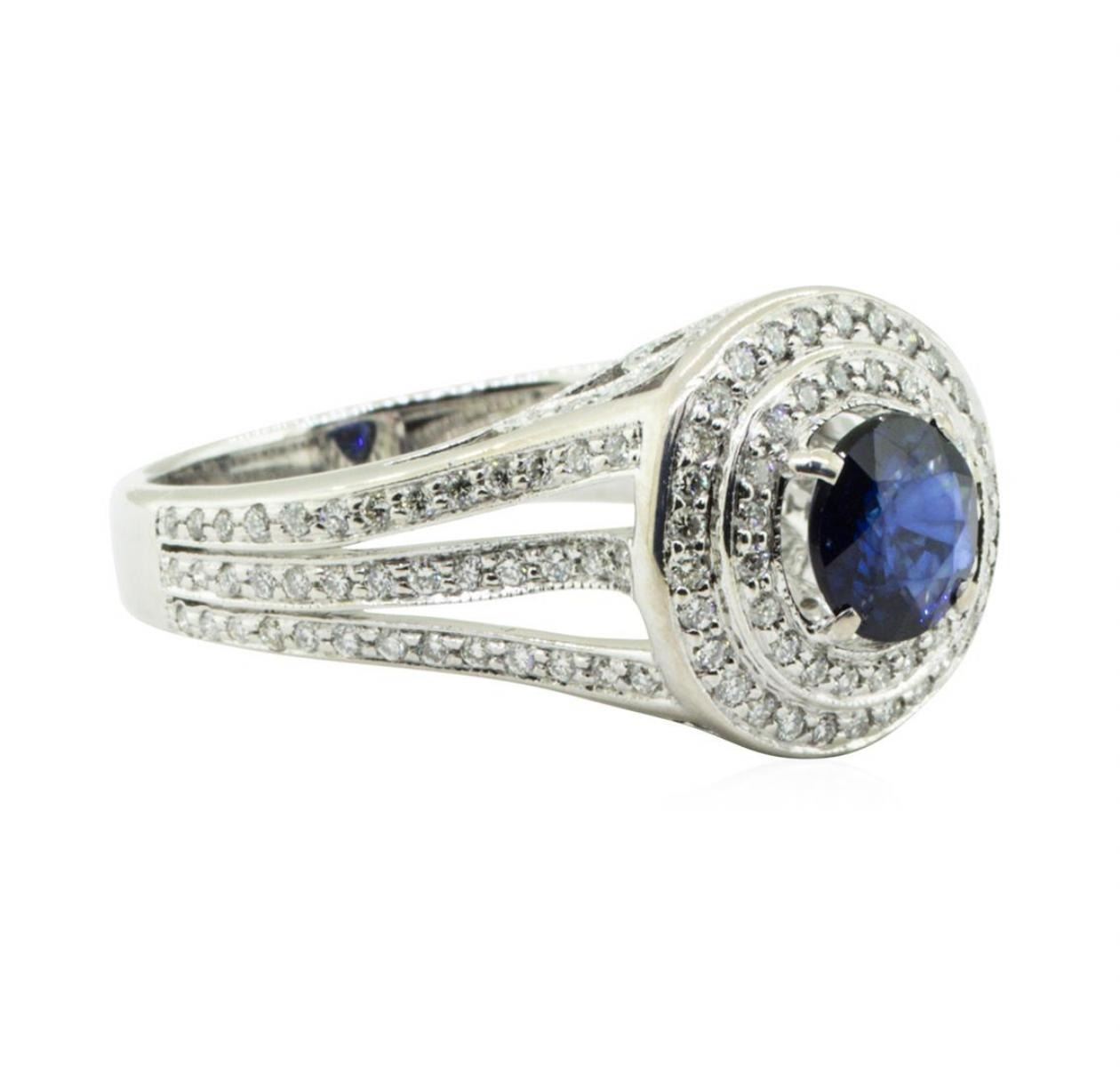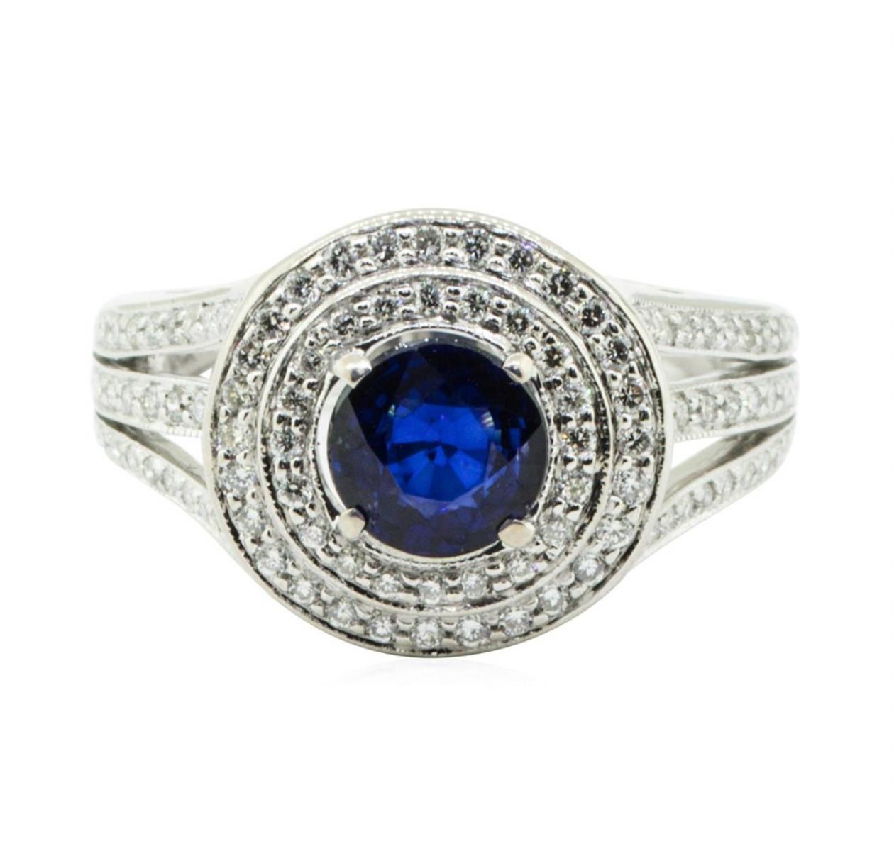 One electronically tested 18KT white gold lady's cast fashion double row halo ring with a split shank with a bright polish with milgrain detailing finish. The featured lady's ring has a shank measuring 3.30 millimeters in width. Identified with markings of '750'. Condition is like new, good workmanship. Containing: One prong set round modified brilliant cut natural blue sapphire, measuring 6.50 - 6.48 x 2.98 mm, (depth est.) approximate weight of 1.06ct., clarity is eye clean, dark, moderately strong, blue color, (GIA B 7/4), cut is very good. Transmitting light with no distortion, transparent. Colored gemstones are presumed to have been subjected to commonly used enhancement processes. Graded in the setting. One Hundred Seventy-Eight prong set round brilliant cut diamonds, measuring 1.30 - 1.25 x 0.79mm (depth est.) approximate total weight of 178 Stones = 1.44ct. Graded in the setting. Color F - G Clarity VS-2 to SI-1 Cut Excellent. Total Weight of Colored Stones 1.06ct.. Total Weight of Diamonds 1.44ct.. Total Weight of Ring 7.60gm GAS Appraised at $8895.00. GAS Appraised.