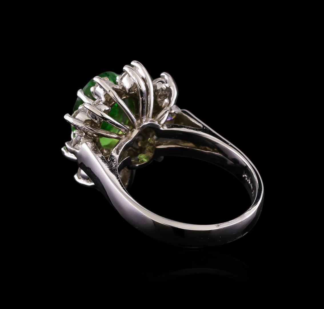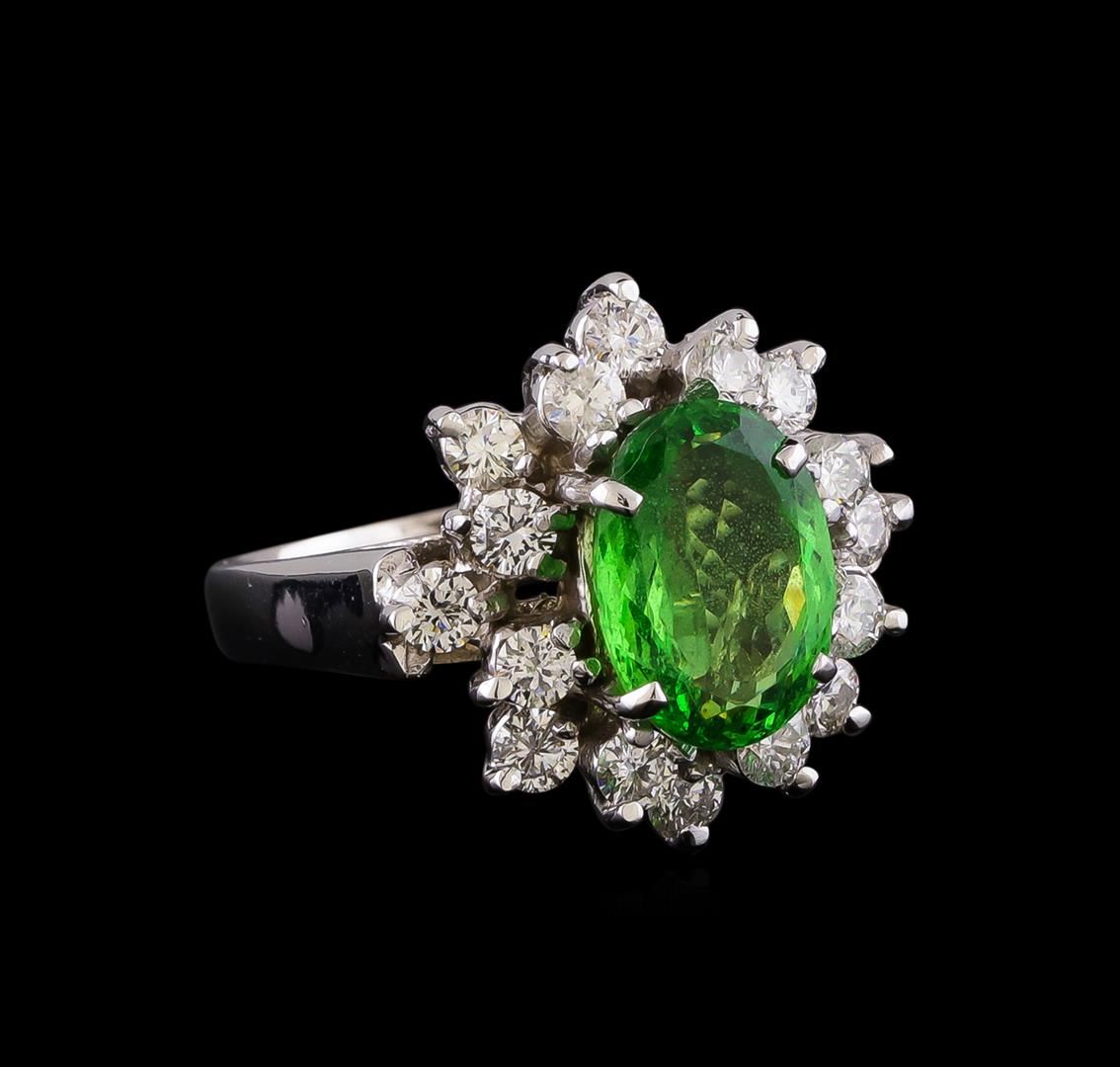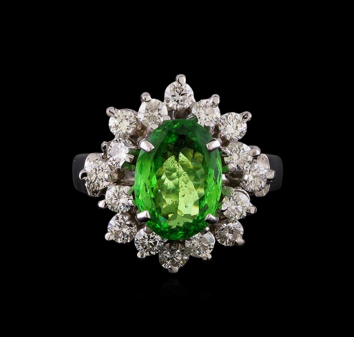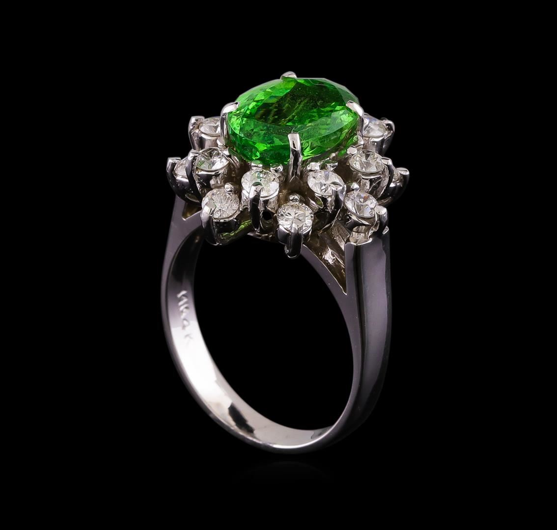 One electronically tested 14KT white gold lady's cast fashion ring with a basket halo with a bright polish finish. The featured lady's ring has a shank measuring 2.77 millimeters wide. Identified with markings of "14K". Condition is new, good workmanship. Containing: One prong set oval modified brilliant cut natural tsavorite garnet, measuring 9.69 x 7.00 x 3.89mm, (depth est.) 5%. bulge factor, approximate weight of 2.51ct., clarity is slightly included, medium, moderately strong, slightly yellowish green color, (GIA slyG 5/4), cut is good. Transmitting light with a minimum of distortion, transparent. Colored gemstones are presumed to have been subjected to commonly used enhancement processes. Graded in the setting. Sixteen prong set round brilliant cut diamonds, measuring 2.40 - 2.30 x 1.46mm (depth est.) approximate total weight of 16 Stones = 0.80ct. Graded in the setting. Clarity: SI-1 to I-1. Color: G - Good. Total Weight of Colored Stones 2.51ct. Total Weight of Diamonds 0.80ct. Total Weight of Ring 5.30gm. GAS Appraised.