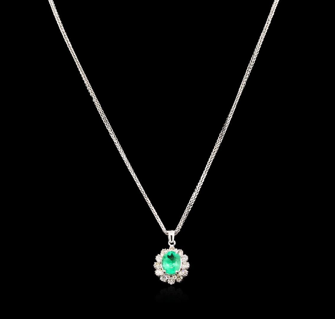 One electronically tested 14KT white gold ladies cast emerald and diamond pendant & chain 18.0" long, with a lobster claw clasp with a bright polish finish. Identified with markings of "14K". Condition is new. Containing: One prong set oval modified brilliant cut natural emerald, measuring 10.28 x 8.13 x 5.28mm, approximate weight of 2.52ct., clarity is heavily included, type III, medium, moderately strong, green color, (GIA G 5/4), cut is good. Twelve prong set round brilliant cut diamonds, measuring 2.50 - 2.50 x 1.50mm (depth est.) approximate. Total Weight of 12 Stones = 0.69ct. Clarity: SI-2 to I-1. Color: J - K, Cut is Good. Twelve prong set round brilliant cut diamonds, measuring 1.30 - 1.30 x 0.78mm (depth est.) approximate. Total Weight of 12 Stones = 0.10ct. Clarity: SI-2 to I-1. Color: I - J, Cut is Good. Colored gemstones are presumed to have been subjected to commonly used enhancement processes. All diamonds and colored gemstones are graded in the mounting, unless otherwise stated. Total Weight of Colored Stones 2.52ct. Total Weight of Diamonds 0.78ct. Total Weight of Pendant & Chain 6.60 grams. GGL Appraised.