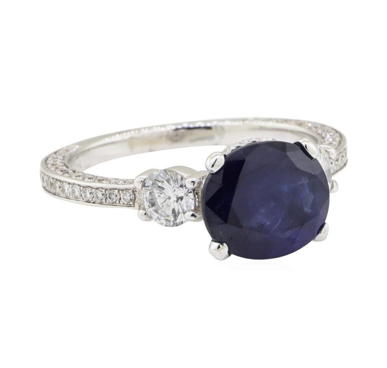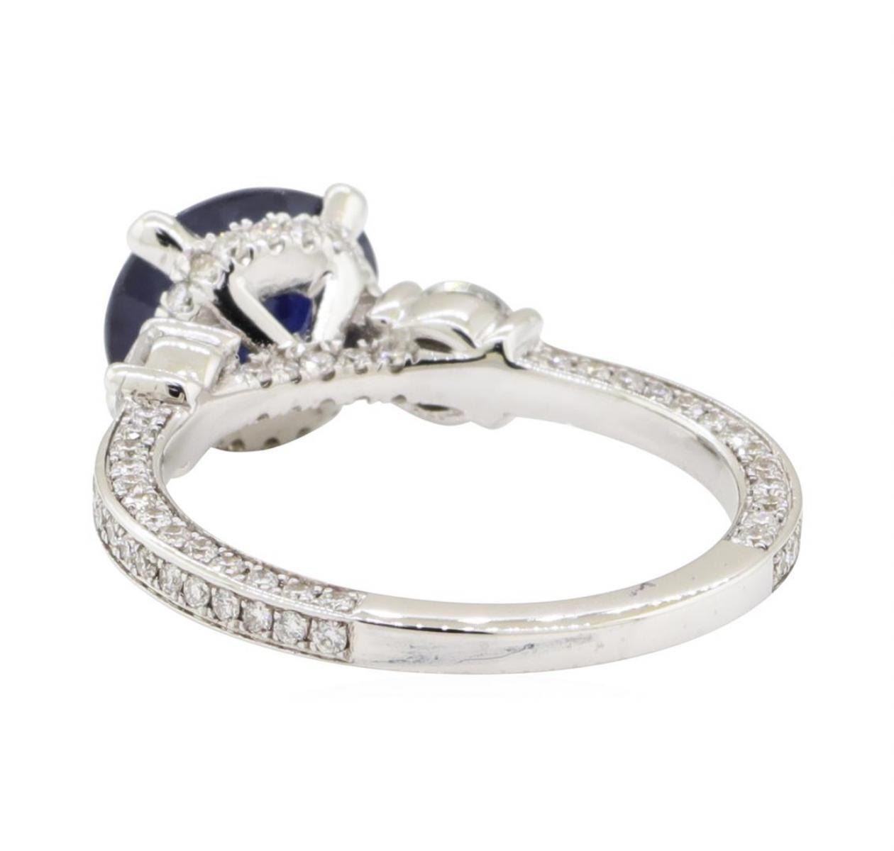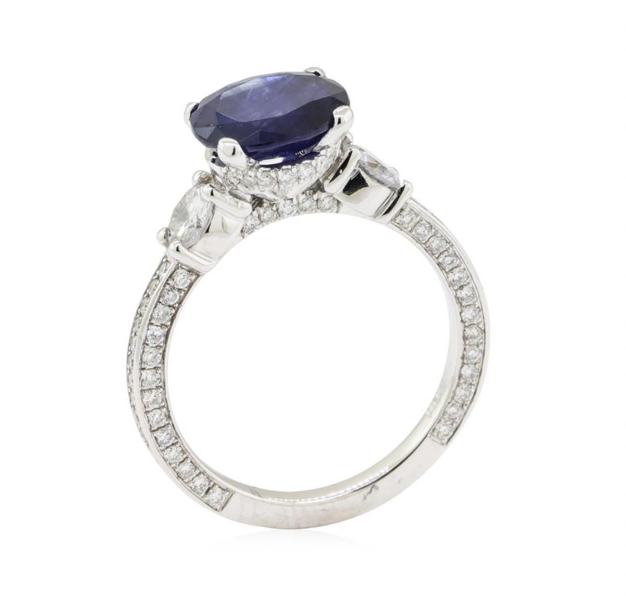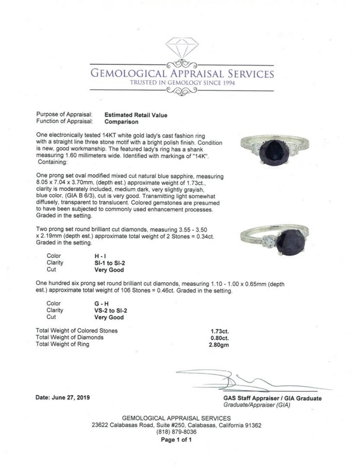 One electronically tested 14KT white gold lady's cast fashion ring with a straight line three stone motif with a bright polish finish. The featured lady's ring has a shank measuring 1.60 millimeters wide. Identified with markings of '14K'. Condition is new, good workmanship. Containing: One prong set oval modified mixed cut natural blue sapphire, measuring 8.05 x 7.04 x 3.70mm, (depth est.) approximate weight of 1.73ct., clarity is moderately included, medium dark, very slightly grayish, blue color, (GIA B 6/3), cut is very good. Transmitting light somewhat diffusely, transparent to translucent. Colored gemstones are presumed to have been subjected to commonly used enhancement processes. Graded in the setting. Two prong set round brilliant cut diamonds, measuring 3.55 - 3.50 x 2.19mm (depth est.) approximate total weight of 2 Stones = 0.34ct. Graded in the setting. Color H - I Clarity SI-1 to SI-2 Cut Very Good One Hundred Six prong set round brilliant cut diamonds, measuring 1.10 - 1.00 x 0.65mm (depth est.) approximate total weight of 106 Stones = 0.46ct. Graded in the setting. Color G - H Clarity VS-2 to SI-2 Cut Very Good. Total Weight of Colored Stones 1.73ct.. Total Weight of Diamonds 0.80ct.. Total Weight of Ring 2.80gm GAS Appraised at $4755.00. GAS Appraised.