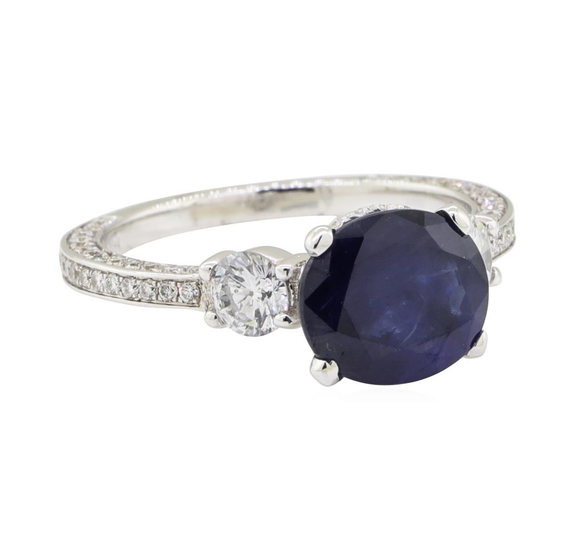 One electronically tested 14KT white gold lady's cast fashion ring with a straight line three stone motif with a bright polish finish. The featured lady's ring has a shank measuring 1.60 millimeters wide. Identified with markings of '14K'. Condition is new, good workmanship. Containing: One prong set oval modified mixed cut natural blue sapphire, measuring 8.05 x 7.04 x 3.70mm, (depth est.) approximate weight of 1.73ct., clarity is moderately included, medium dark, very slightly grayish, blue color, (GIA B 6/3), cut is very good. Transmitting light somewhat diffusely, transparent to translucent. Colored gemstones are presumed to have been subjected to commonly used enhancement processes. Graded in the setting. Two prong set round brilliant cut diamonds, measuring 3.55 - 3.50 x 2.19mm (depth est.) approximate total weight of 2 Stones = 0.34ct. Graded in the setting. Color H - I Clarity SI-1 to SI-2 Cut Very Good One Hundred Six prong set round brilliant cut diamonds, measuring 1.10 - 1.00 x 0.65mm (depth est.) approximate total weight of 106 Stones = 0.46ct. Graded in the setting. Color G - H Clarity VS-2 to SI-2 Cut Very Good. Total Weight of Colored Stones 1.73ct.. Total Weight of Diamonds 0.80 ct.. Total Weight of Ring 2.80gm GAS Appraised at $4755.00. GAS Appraised.