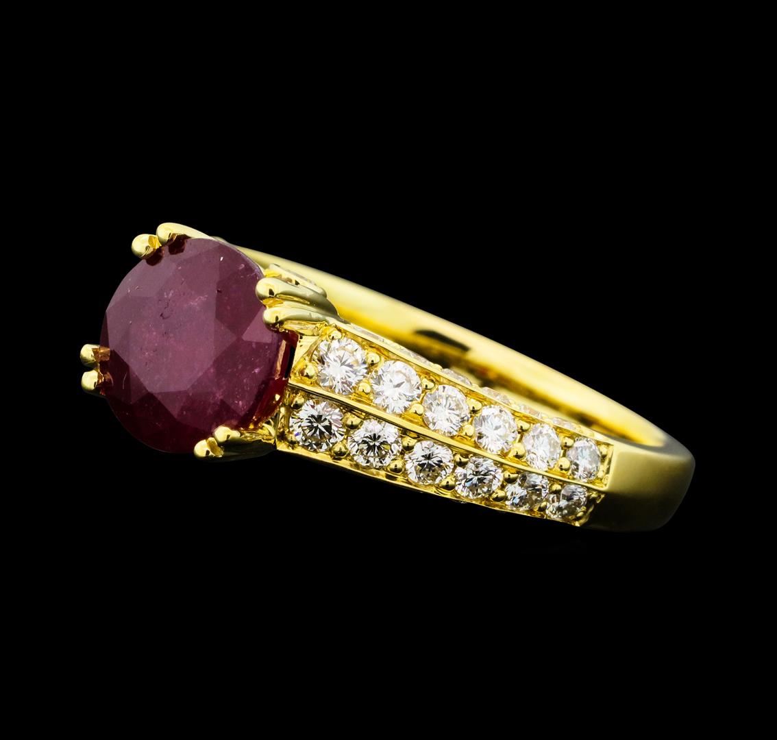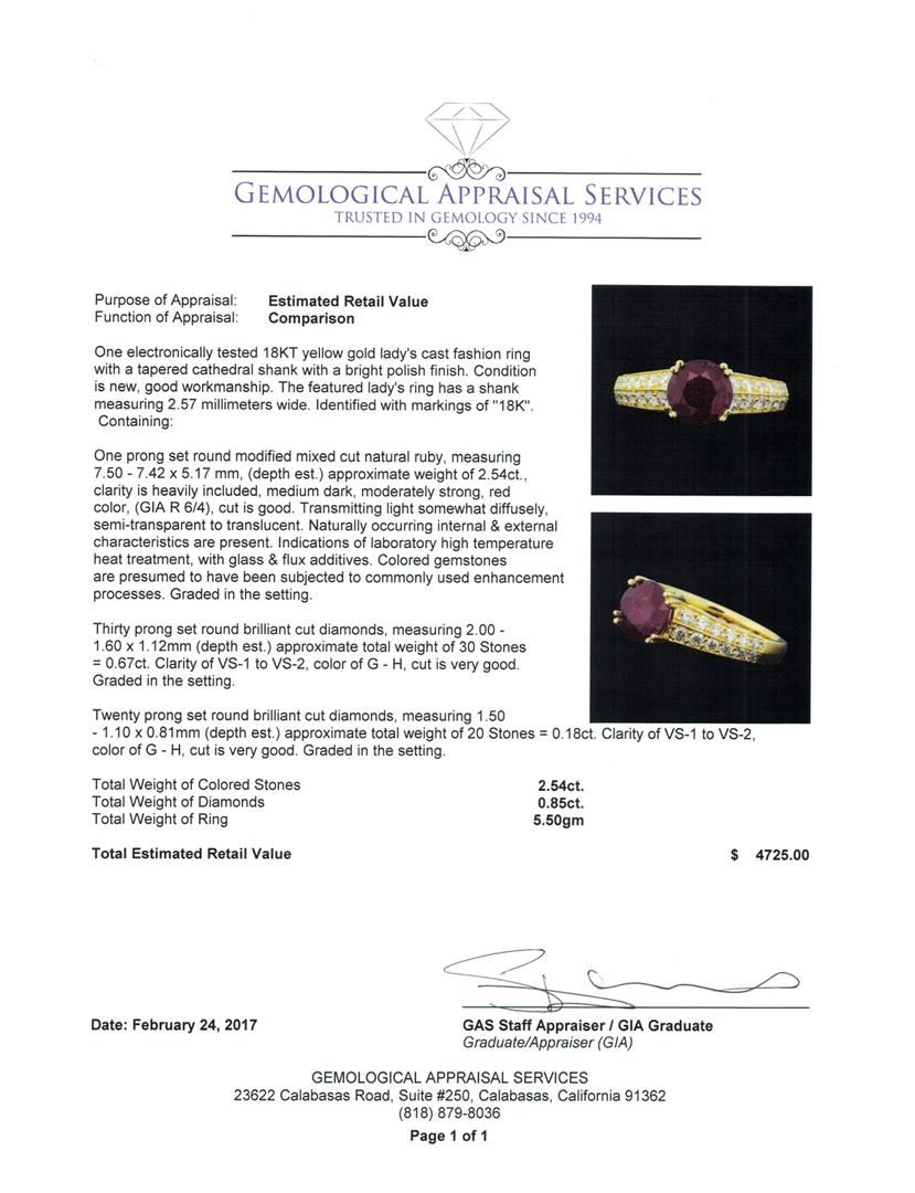 One electronically tested 18KT yellow gold lady's cast fashion ring with a tapered cathedral shank with a bright polish finish. The featured lady's ring has a shank measuring 2.57 millimeters wide. Identified with markings of '18K'. Condition is new, good workmanship. Containing: One prong set round modified mixed cut natural ruby, measuring 7.50 - 7.42 x 5.17 mm, (depth est.) approximate weight of 2.54ct., clarity is heavily included, medium dark, moderately strong, red color, (GIA R 6/4), cut is good. Transmitting light somewhat diffusely, semi-transparent to translucent. Naturally occurring internal & external characteristics are present. Indications of laboratory high temperature heat treatment, with glass & flux additives. Colored gemstones are presumed to have been subjected to commonly used enhancement processes. Graded in the setting. Thirty prong set round brilliant cut diamonds, measuring 2.00 - 1.60 x 1.12mm (depth est.) approximate total weight of 30 Stones = 0.67ct. Graded in the setting. Color G - H Clarity VS-1 to VS-2 Cut Very Good Twenty prong set round brilliant cut diamonds, measuring 1.50 - 1.10 x 0.81mm (depth est.) approximate total weight of 20 Stones = 0.18ct. Graded in the setting. Color G - H Clarity VS-1 to VS-2 Cut Very Good. Total Weight of Colored Stones 2.54ct.. Total Weight of Diamonds 0.85ct.. Total Weight of Ring 5.50gm. GAS Appraised.