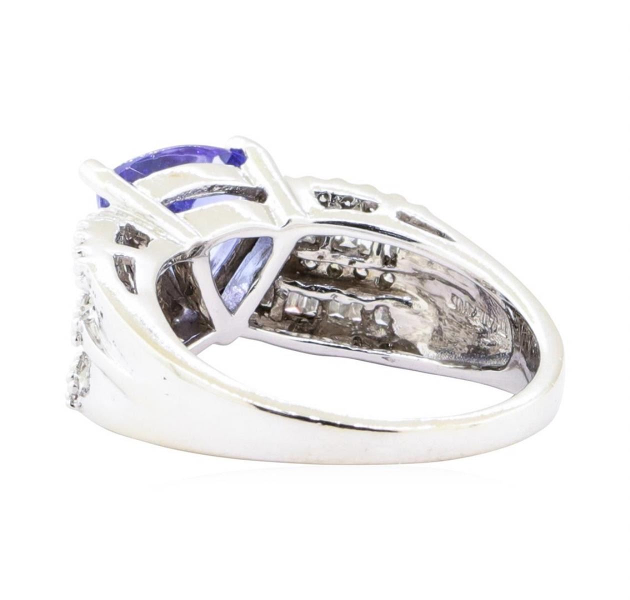One electronically tested 14KT white gold lady's cast fashion five row wide band with a cathedral shank with a bright polish finish. The featured lady's ring has a shank measuring 2.20 millimeters in width. Identified with markings of '14K'. Condition is Good. Containing: One prong set triangle modified brilliant cut natural tanzanite, measuring 8.05 x 7.90 x 4.70mm, (depth est.) 5%. bulge factor, approximate weight of 2.00 ct., clarity is eye clean, medium dark, very slightly grayish, bluish violet color, (GIA bV 6/3), cut is very good. Graded in the setting. Colored gemstones are presumed to have been subjected to commonly used enhancement processes. Transmitting light with no distortion, transparent. Twenty-Six channel set baguette cut (tapered) diamonds, measuring from 1.45 x 1.00 x 0.85mm (depth est.) to 1.60 x 1.20 x 1.02mm (depth est.) approximate total weight of 26 Stones = 0.36ct. Graded in the setting. Color H - I Clarity VS-2 to SI-2 Cut Good Thirty-Six prong set round brilliant cut diamonds, measuring 1.20 - 1.00 x 0.68mm (depth est.) approximate total weight of 36 Stones = 0.18ct. Graded in the setting. Color H - I Clarity VS-2 to SI-2 Cut Very Good. Total Weight of Colored Stones 2.00 ct.. Total Weight of Diamonds 0.54ct.. Total Weight of Wide Band 7.30gm GAS Appraised at $6270.00. GAS Appraised.