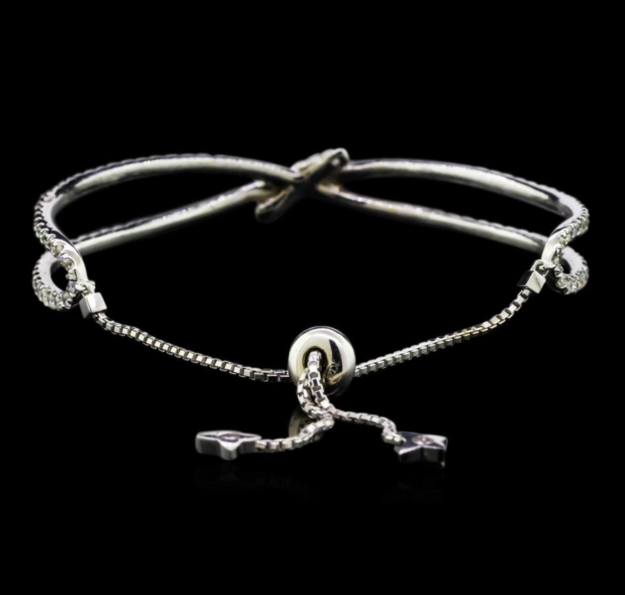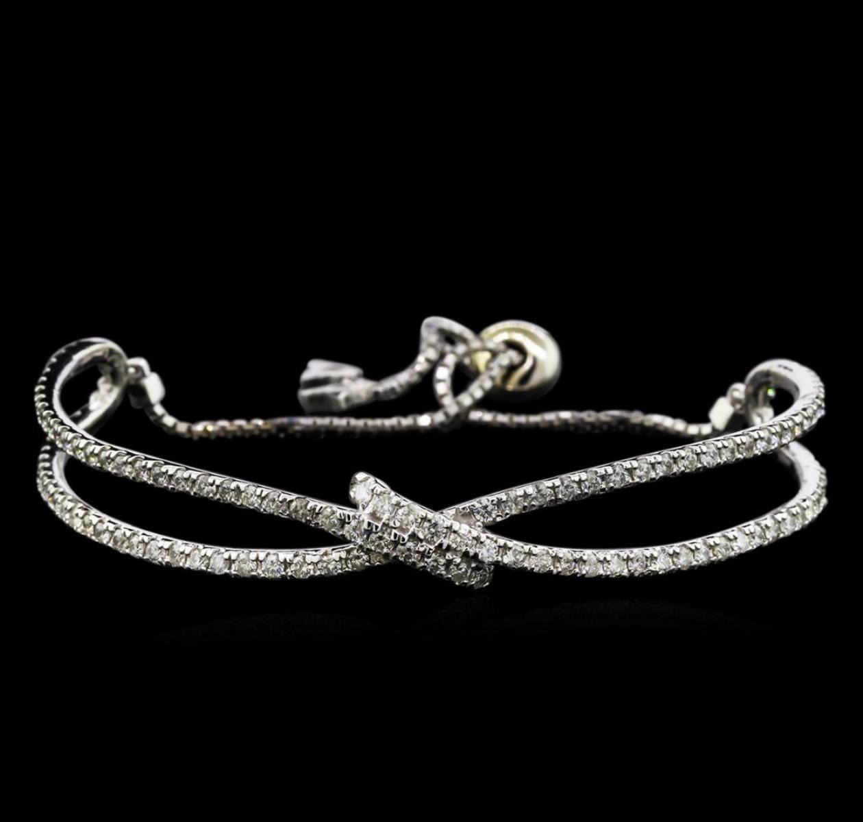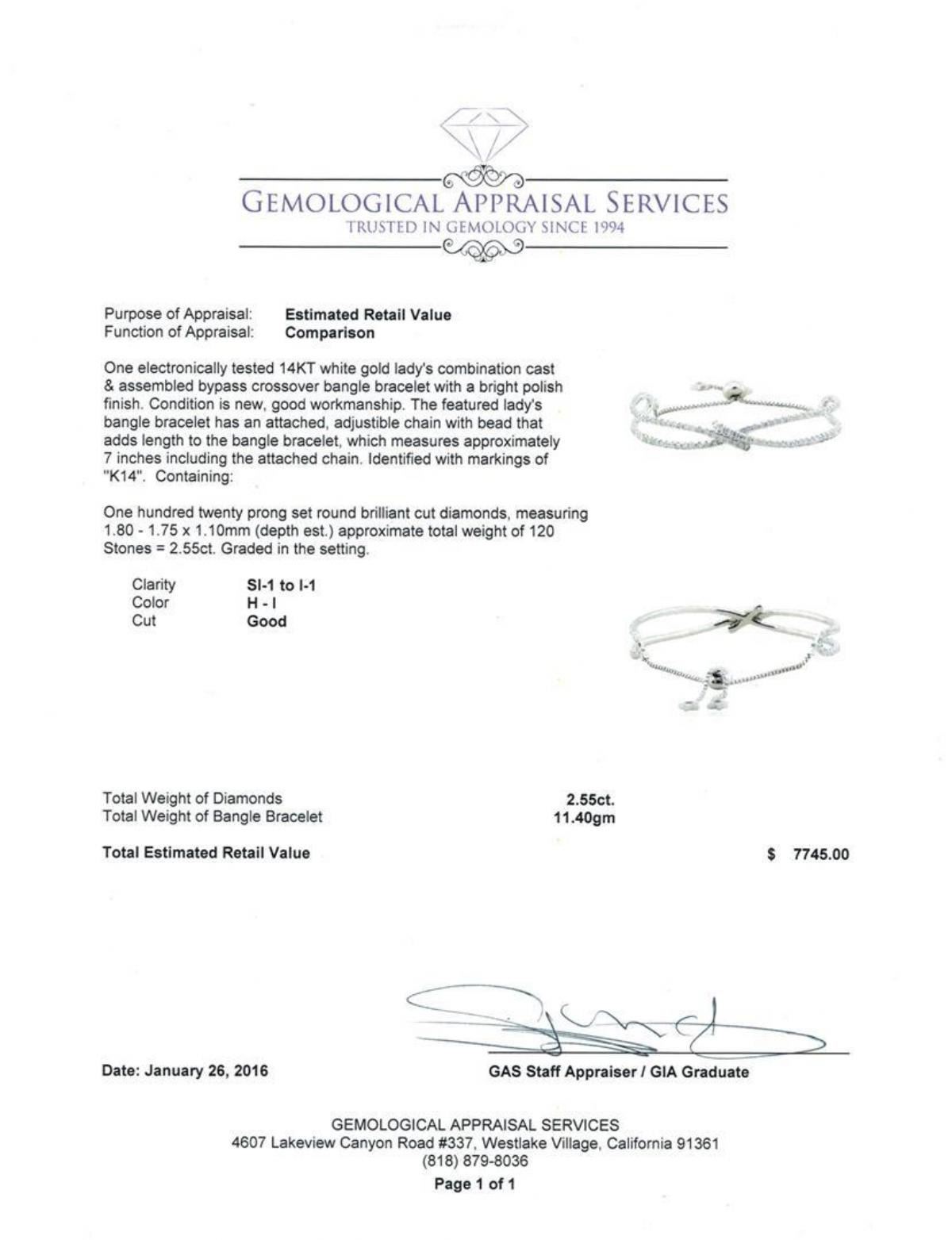 One electronically tested 14KT white gold lady's combination cast & assembled bypass crossover bangle bracelet with a bright polish finish. The featured lady's bangle bracelet has an attached, adjustable chain with bead that adds length to the bangle bracelet, which measures approximately 7 inches including the attached chain. Identified with markings of "K14". Condition is new, good workmanship. Containing: One Hundred Twenty prong set round brilliant cut diamonds, measuring 1.80 - 1.75 x 1.10mm (depth est.) approximate total weight of 120 Stones = 2.55ct. Graded in the setting. Clarity: SI-1 to I-1. Color: H - I. Cut Good. Total Weight of Diamonds 2.55ct. Total Weight of Bangle Bracelet 11.40gm. GAS Appraised.