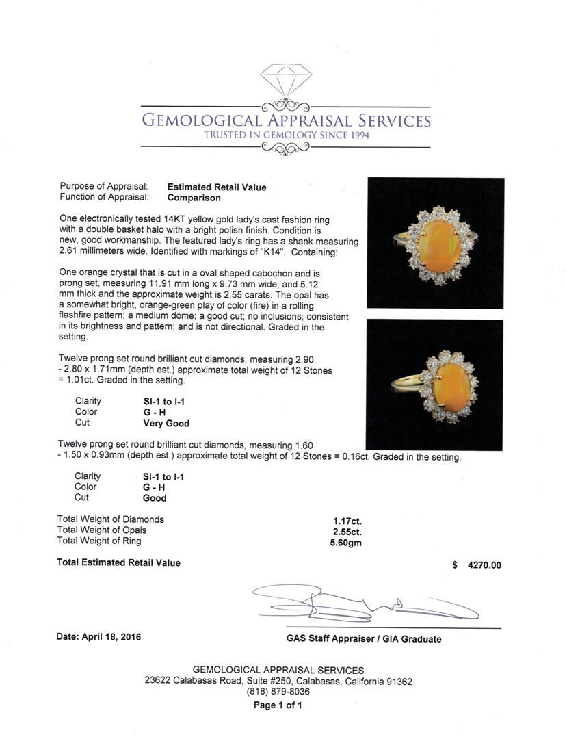 One electronically tested 14KT yellow gold lady's cast fashion ring with a double basket halo with a bright polish finish. The featured lady's ring has a shank measuring 2.61 millimeters wide. Identified with markings of "K14". Condition is new, good workmanship. Containing: One orange crystal that is cut in a oval shaped cabochon and is prong set, measuring 11.91 mm long x 9.73 mm wide, and 5.12 mm thick and the approximate weight is 2.55 carats. The opal has a somewhat bright, orange-green play of color (fire) in a rolling flashfire pattern; a medium dome; a good cut; no inclusions; consistent in its brightness and pattern; and is not directional. Graded in the setting. Twelve prong set round brilliant cut diamonds, measuring 2.90 - 2.80 x 1.71mm (depth est.) approximate total weight of 12 Stones = 1.01ct. Graded in the setting. Clarity: SI-1 to I-1. Color: G - Very Good Twelve prong set round brilliant cut diamonds, measuring 1.60 - 1.50 x 0.93mm (depth est.) approximate total weight of 12 Stones = 0.16ct. Graded in the setting. Clarity: SI-1 to I-1. Color: G - Good. Total Weight of Diamonds 1.17ct. Total Weight of Opals 2.55ct. Total Weight of Ring 5.60gm. GAS Appraised.
