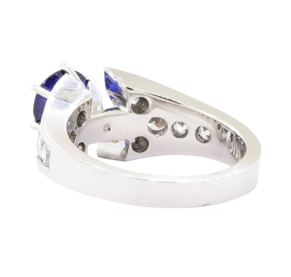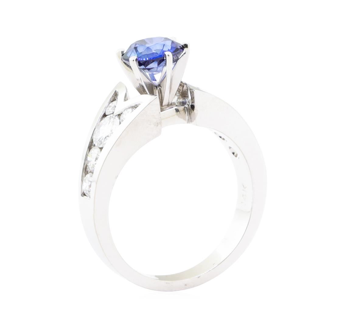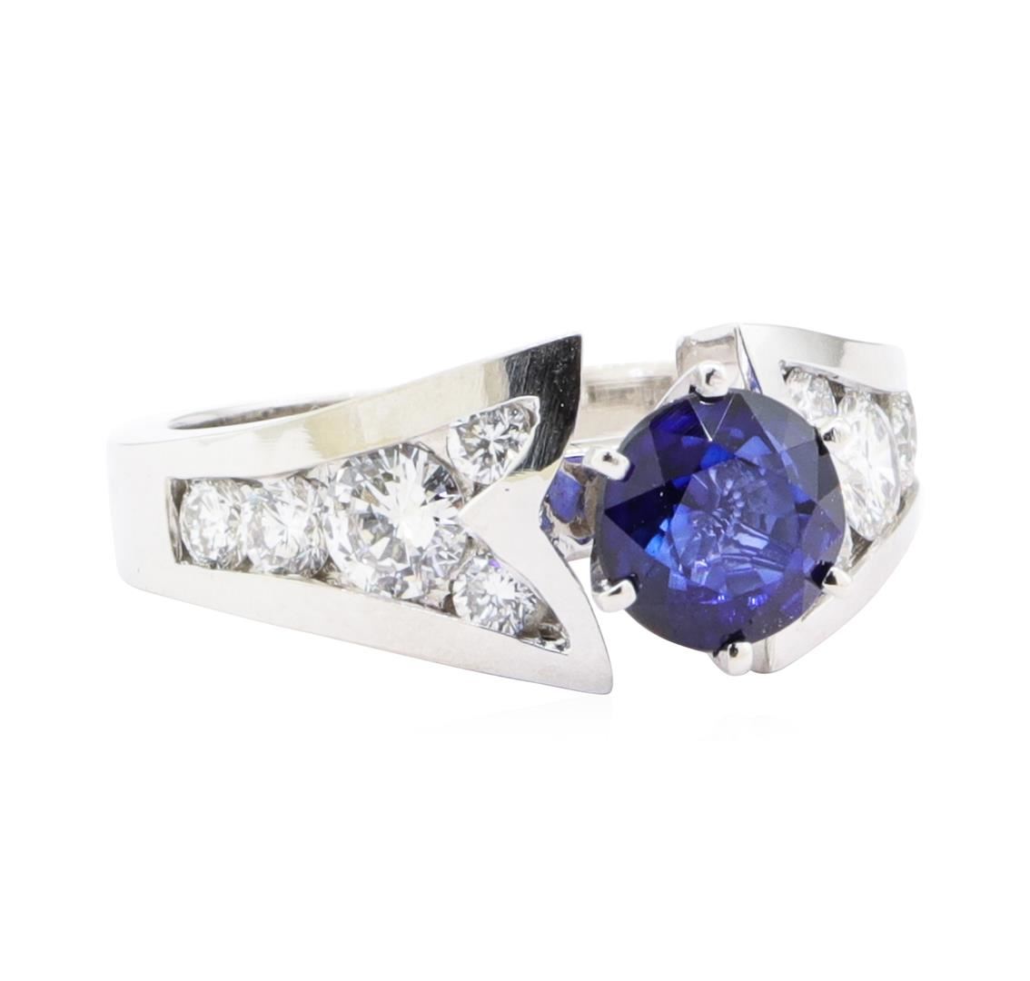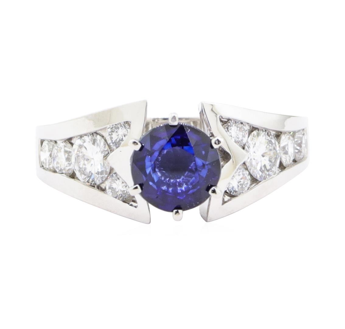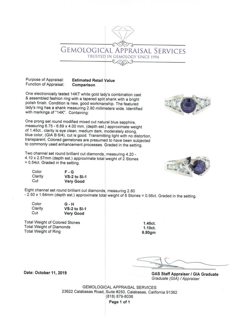 One electronically tested 14KT white gold lady's combination cast & assembled fashion ring with a tapered split shank with a bright polish finish. The featured lady's ring has a shank measuring 2.90 millimeters wide. Identified with markings of '14K'. Condition is new, good workmanship. Containing: One prong set round modified mixed cut natural blue sapphire, measuring 6.75 - 6.69 x 4.00 mm, (depth est.) approximate weight of 1.45ct., clarity is eye clean, medium dark, moderately strong, blue color, (GIA B 6/4), cut is good. Transmitting light with no distortion, transparent. Colored gemstones are presumed to have been subjected to commonly used enhancement processes. Graded in the setting. Two channel set round brilliant cut diamonds, measuring 4.20 - 4.10 x 2.57mm (depth est.) approximate total weight of 2 Stones = 0.54ct. Graded in the setting. Color F - G Clarity VS-2 to SI-1 Cut Very Good Eight channel set round brilliant cut diamonds, measuring 2.80 - 2.50 x 1.64mm (depth est.) approximate total weight of 8 Stones = 0.56ct. Graded in the setting. Color G - H Clarity VS-2 to SI-1 Cut Very Good. Total Weight of Colored Stones 1.45ct.. Total Weight of Diamonds 1.10ct.. Total Weight of Ring 6.80gm GAS Appraised at $7030.00. GAS Appraised.