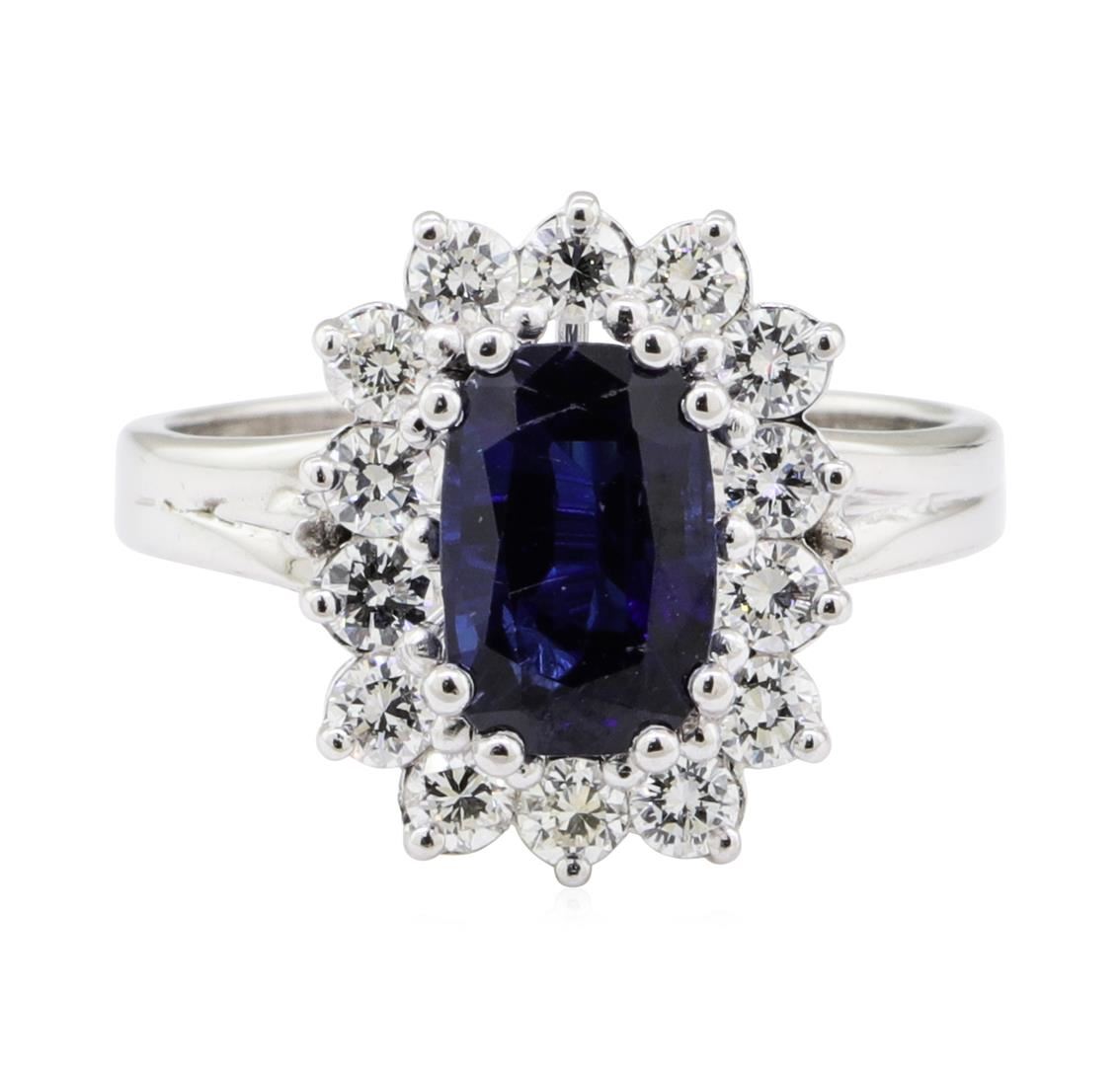 One electronically tested 14KT white gold lady's cast fashion ring with a wire basket halo with a bright polish finish. The featured lady's ring has a double shank measuring 2.60 millimeters wide. Identified with markings of '14K'. Condition is new, good workmanship. Containing: One prong set rectangular cushion modified mixed cut natural blue sapphire, measuring 8.36 x 5.62 x 3.95mm, (depth est.) 5%. bulge factor, approximate weight of 1.85ct., clarity is eye clean, medium dark, strong, very slightly greenish blue color, (GIA vslgB 6/5), cut is good. Transmitting light with no distortion, transparent. Colored gemstones are presumed to have been subjected to commonly used enhancement processes. Graded in the setting. Fourteen prong set round brilliant cut diamonds, measuring 2.40 - 2.30 x 1.46mm (depth est.) approximate total weight of 14 Stones = 0.70ct. Graded in the setting. Color G - H Clarity VS-1 to VS-2 Cut Very Good. Total Weight of Colored Stones 1.85ct.. Total Weight of Diamonds 0.70ct.. Total Weight of Ring 4.80gm GAS Appraised at $6685.00. GAS Appraised.