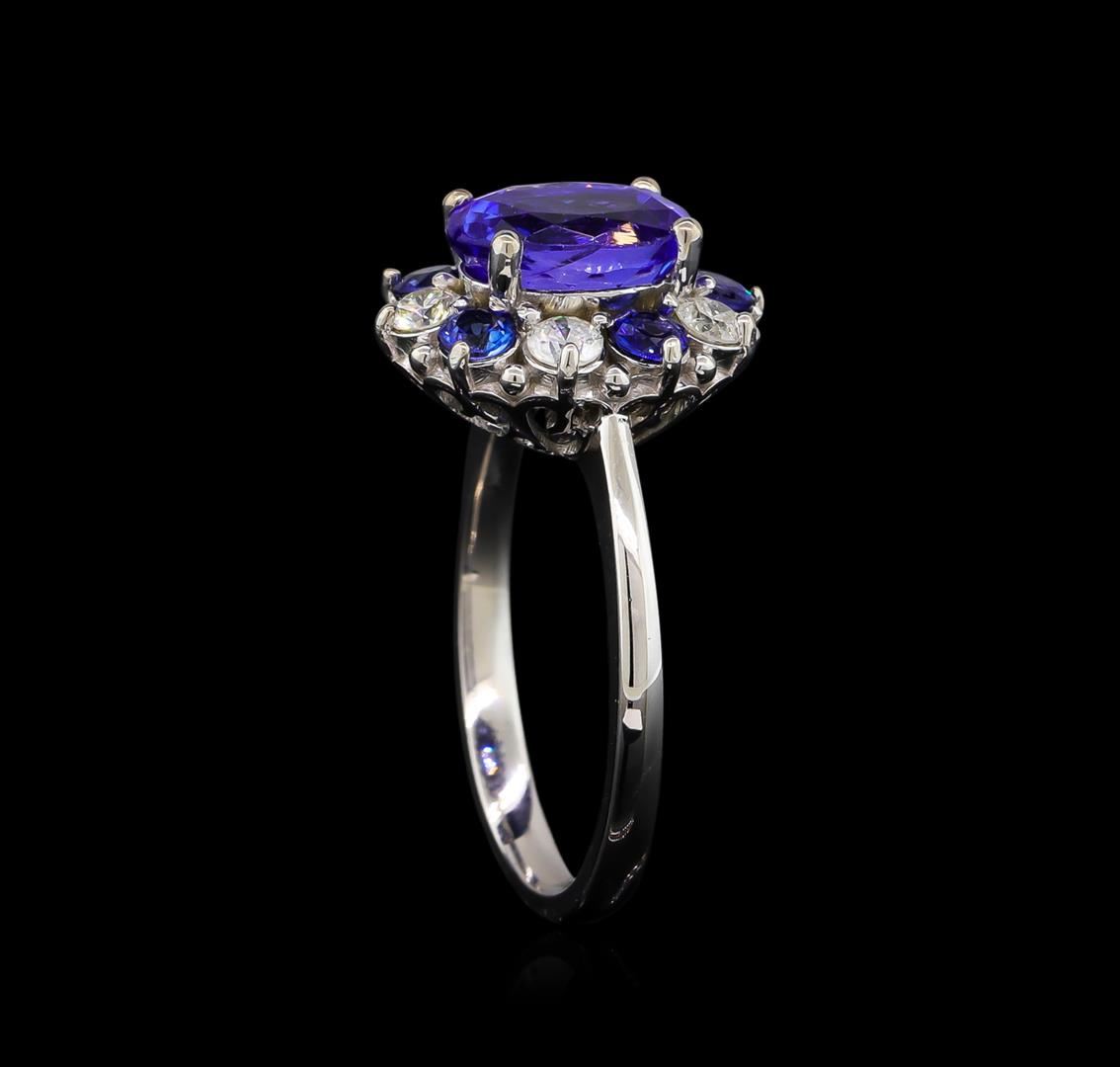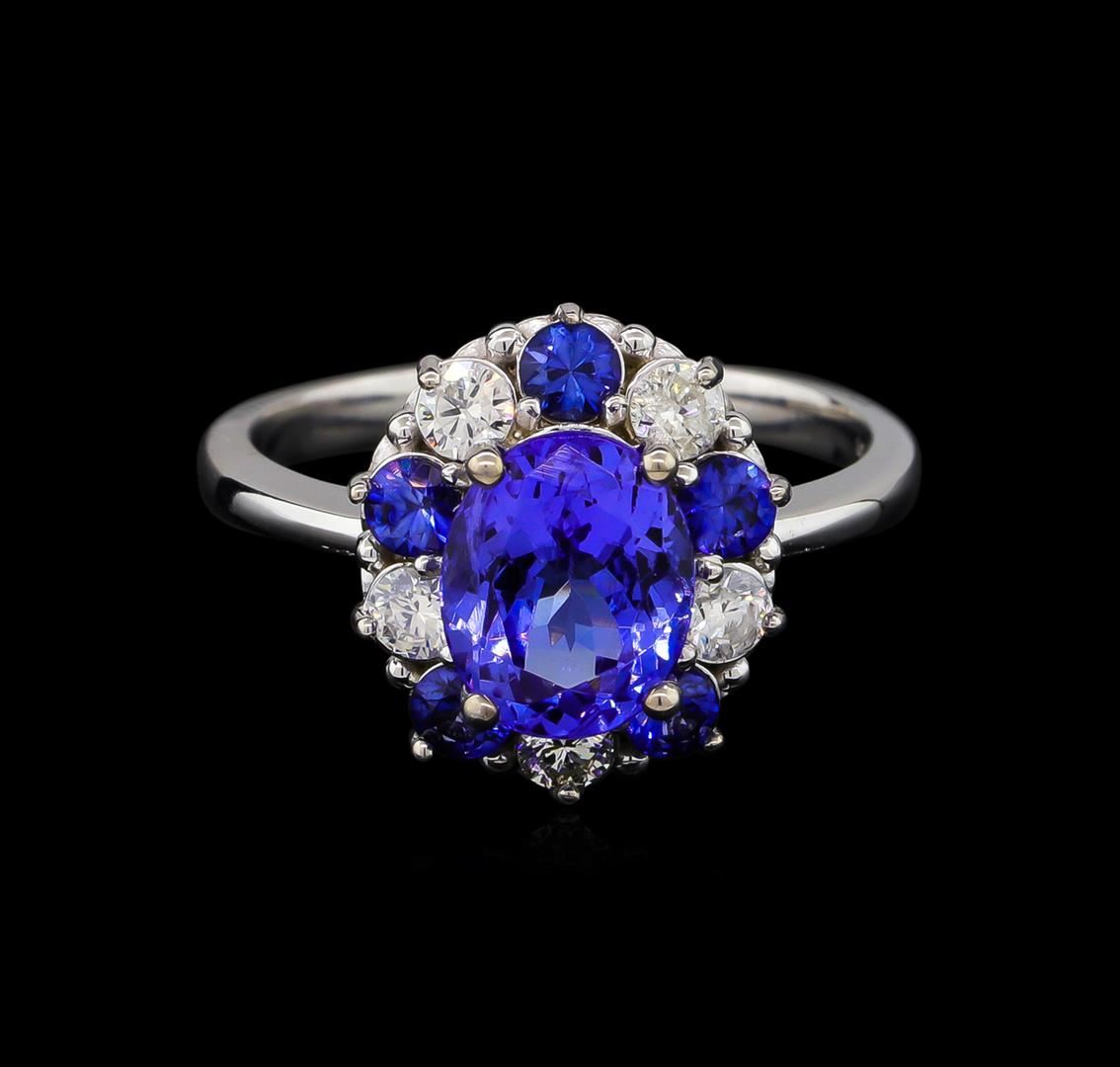 One ring featuring: 14KT white gold weighing 3.80 grams containing one tanzanite with a total weight of 2.55ct and 5 blue sapphires with a total weight of 0.55ct and side diamonds with a total weight of 0.38ct.