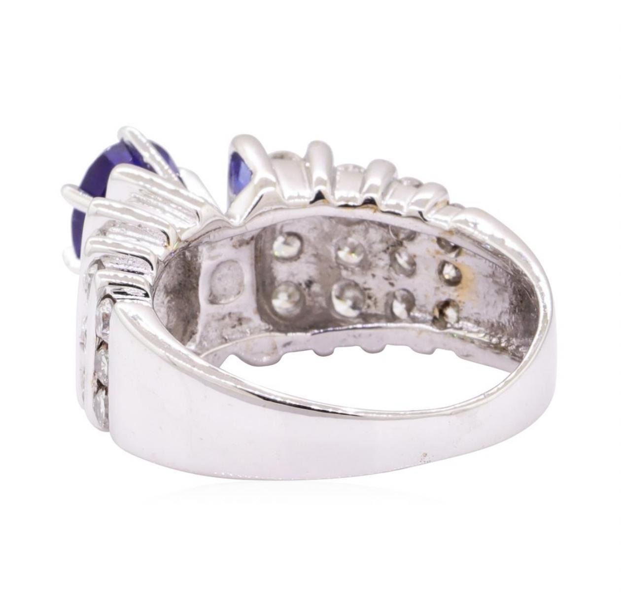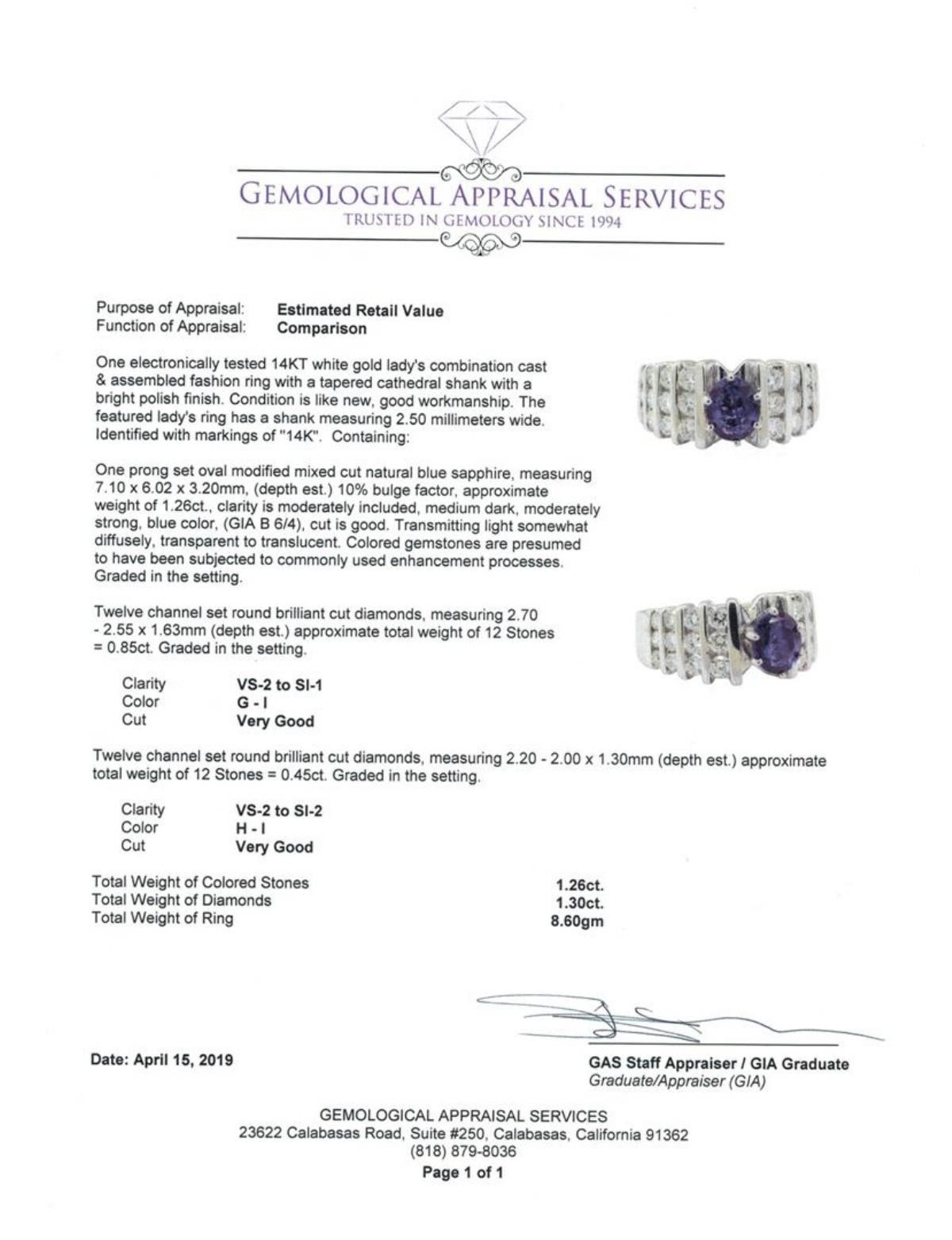 One electronically tested 14KT white gold lady's combination cast & assembled fashion ring with a tapered cathedral shank with a bright polish finish. The featured lady's ring has a shank measuring 2.50 millimeters wide. Identified with markings of '14K'. Condition is like new, good workmanship. Containing: One prong set oval modified mixed cut natural blue sapphire, measuring 7.10 x 6.02 x 3.20mm, (depth est.) 10%. bulge factor, approximate weight of 1.26ct., clarity is moderately included, medium dark, moderately strong, blue color, (GIA B 6/4), cut is good. Transmitting light somewhat diffusely, transparent to translucent. Colored gemstones are presumed to have been subjected to commonly used enhancement processes. Graded in the setting. Twelve channel set round brilliant cut diamonds, measuring 2.70 - 2.55 x 1.63mm (depth est.) approximate total weight of 12 Stones = 0.85ct. Graded in the setting. Color G - I Clarity VS-2 to SI-1 Cut Very Good Twelve channel set round brilliant cut diamonds, measuring 2.20 - 2.00 x 1.30mm (depth est.) approximate total weight of 12 Stones = 0.45ct. Graded in the setting. Color H - I Clarity VS-2 to SI-2 Cut Very Good. Total Weight of Colored Stones 1.26ct.. Total Weight of Diamonds 1.30ct.. Total Weight of Ring 8.60gm GAS Appraised at $5600.00. GAS Appraised.