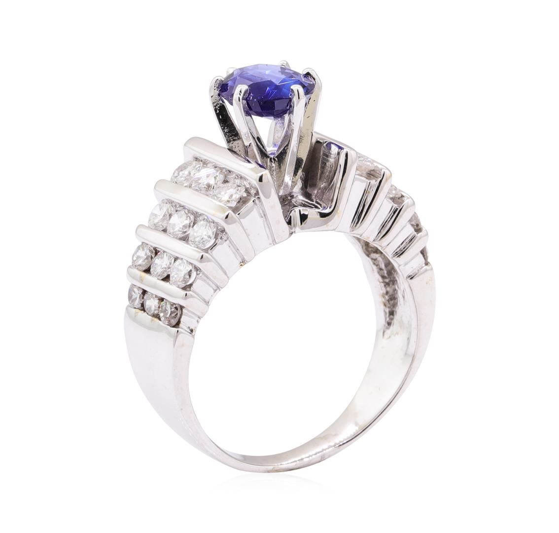 One electronically tested 14KT white gold lady's combination cast & assembled fashion ring with a tapered cathedral shank with a bright polish finish. The featured lady's ring has a shank measuring 2.50 millimeters wide. Identified with markings of '14K'. Condition is like new, good workmanship. Containing: One prong set oval modified mixed cut natural blue sapphire, measuring 7.10 x 6.02 x 3.20mm, (depth est.) 10%. bulge factor, approximate weight of 1.26ct., clarity is moderately included, medium dark, moderately strong, blue color, (GIA B 6/4), cut is good. Transmitting light somewhat diffusely, transparent to translucent. Colored gemstones are presumed to have been subjected to commonly used enhancement processes. Graded in the setting. Twelve channel set round brilliant cut diamonds, measuring 2.70 - 2.55 x 1.63mm (depth est.) approximate total weight of 12 Stones = 0.85ct. Graded in the setting. Color G - I Clarity VS-2 to SI-1 Cut Very Good Twelve channel set round brilliant cut diamonds, measuring 2.20 - 2.00 x 1.30mm (depth est.) approximate total weight of 12 Stones = 0.45ct. Graded in the setting. Color H - I Clarity VS-2 to SI-2 Cut Very Good. Total Weight of Colored Stones 1.26ct.. Total Weight of Diamonds 1.30ct.. Total Weight of Ring 8.60gm GAS Appraised at $5600.00. GAS Appraised.