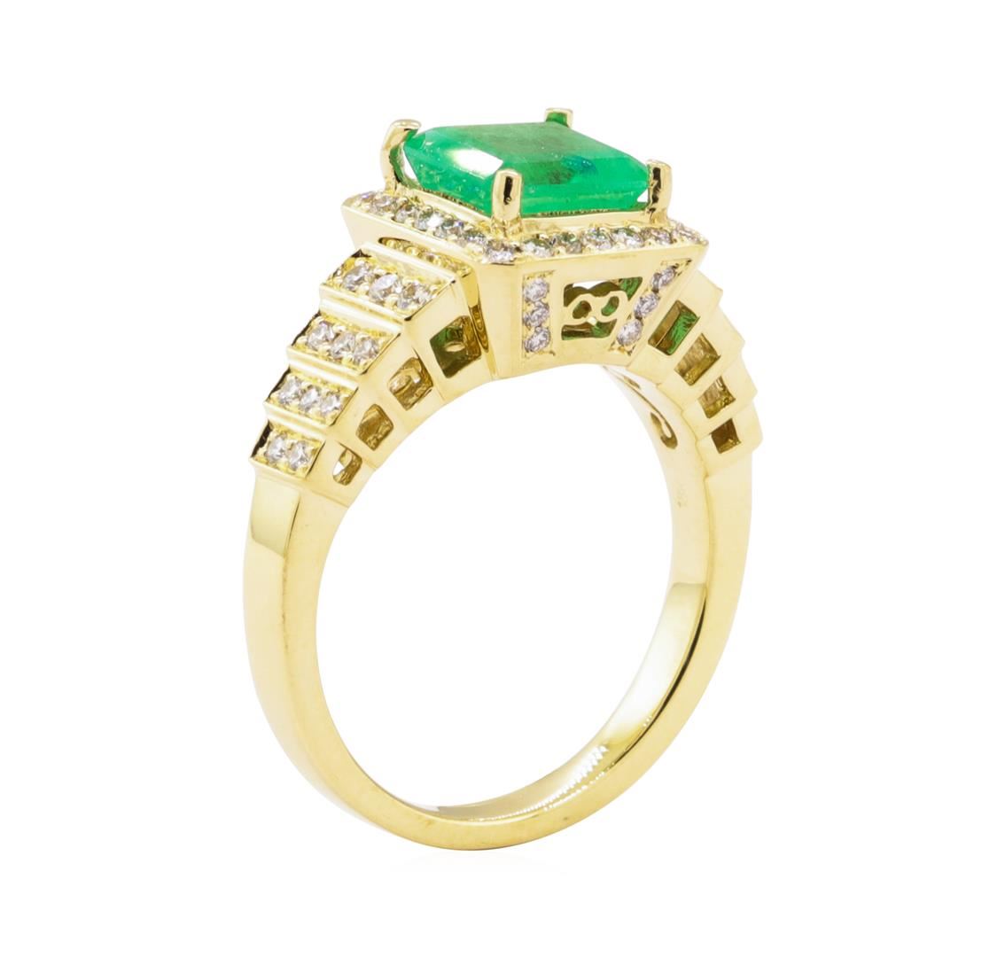 One electronically tested 18KT yellow gold ladys cast fashion ring with a tapered shank with a bright polish finish. Condition is new, good workmanship. The featured lady's ring has a shank measuring 2.35 millimeters wide. Identified with markings of "18K". Containing: One prong set emerald standard step cut naatural emerald, measuring 7.73x7.04x5.10mm, (depth est.) approximate weight of 2.04ct., clarity is heavily included, meduim, moderatly strong, green color, (GIA G 5/4), cut us good. Transmitting light somewhat diffusely, semi-transparent to translucent. Naturally occuring internal & extenal charachteristics are present. Indications of oil residue. Colored gemstones are presumed to have been subjected to commonly used enhancement processes. Graded in the setting. Six prong set round brilliand cut diamonds, measuring 1.60-1.55x0.98mm (depth est.) approximate total weight of 6 stones = 0.09ct. Graded in the setting. Color F-G. Clarity VS-1 to VS-2. Cut Very good. Forty prong set round brilliant cut diamonds, measuring 1.50-1.30x0.87mm (depth est.) approximate total weight of 40 stones = 0.43ct. Graded in the setting. Color F-G. Clarity VS-1 to VS-2. Cut Very good. Total weight of colored stones 2.04ct. Total weight of diamonds 0.52ct. Ttotal weight of ring 7.30gm. Total estimated retail value $4595.00 GAS Appraised.