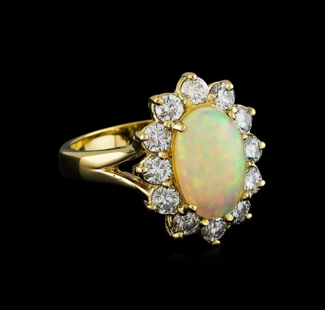 One electronically tested 14KT yellow gold ladies cast opal and diamond ring with a bright polish finish. The featured opal is set within a diamond floret, completed by a two and one-half millimeter wide band. Identified with markings of "14K". Condition is new, good workmanship. Containing: One semi crystal opal that is cut in a oval shaped cabochon and is prong set, measuring 11.90 mm long x 8.10 mm wide, and 4.10 mm thick and the approximate weight is 2.56 carats. The opal has a bright, multicolor play of color (fire) in a flashfire pattern; a medium dome; a good cut; no inclusions; consistent in its brightness and pattern; and is not directional. Graded in the setting. Twelve prong set round brilliant cut diamonds, measuring 3.00 - 3.00 x 1.80mm (depth est.) approximate. Total Weight of 12 Stones = 1.28ct. Graded in the setting. Clarity: SI-2 to I-1. Color: G - I. Total Weight of Diamonds 1.28ct. Total Weight of Opals 2.56ct. Total Weight of Ring 6.89gm. AIG Appraised.