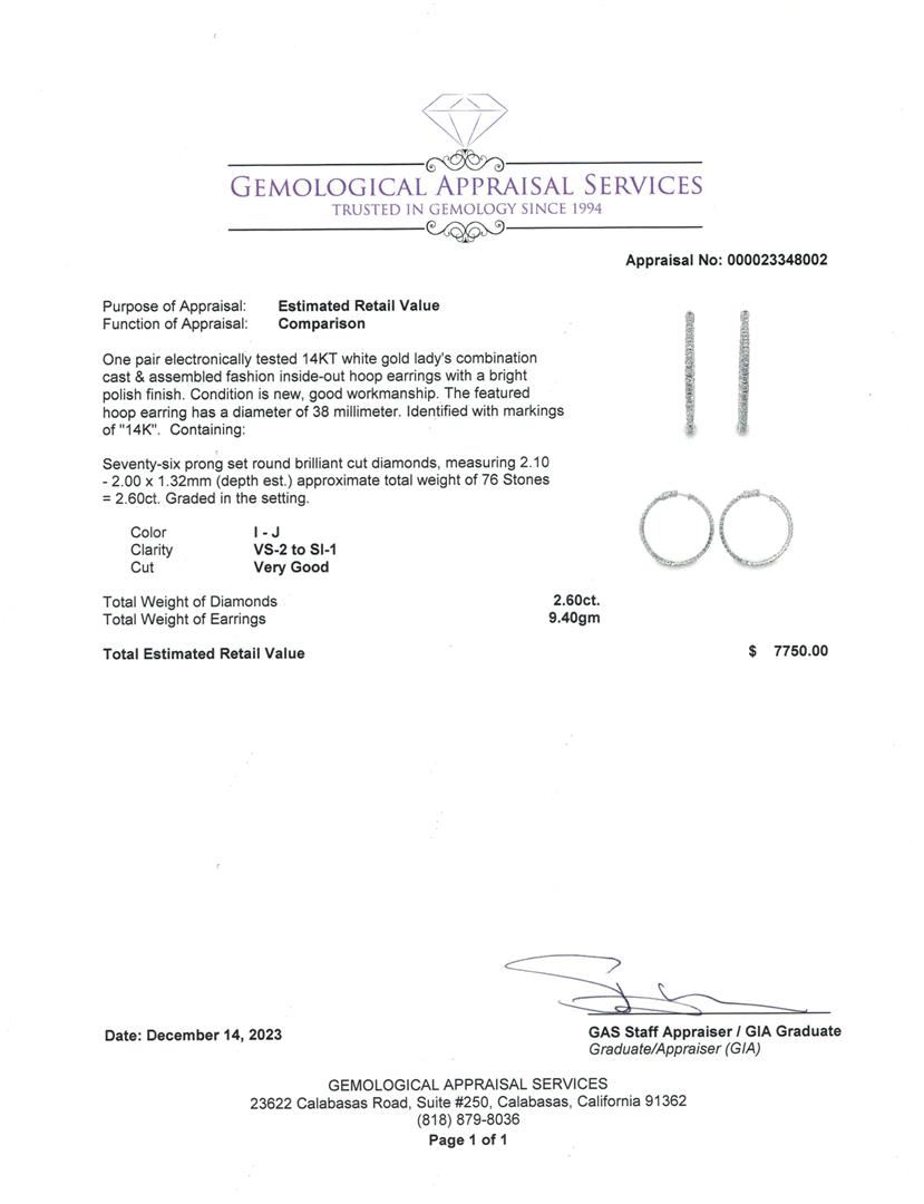 One pair electronically tested 14KT white gold lady's combination cast & assembled fashion inside-out hoop earrings with a bright polish finish. The featured hoop earring has a diameter of 38 millimeter. Identified with markings of "14K". Condition is new, good workmanship. Containing: Seventy-Six prong set round brilliant cut diamonds, measuring 2.10 - 2.00 x 1.32mm (depth est.) approximate total weight of 76 Stones = 2.60ct. Graded in the setting. Color I - J Clarity VS-2 to SI-1 Cut Very Good Total Weight of Diamonds 2.60ct. Total Weight of Earrings 9.40gm Estimated Retail Value $ 7750.00