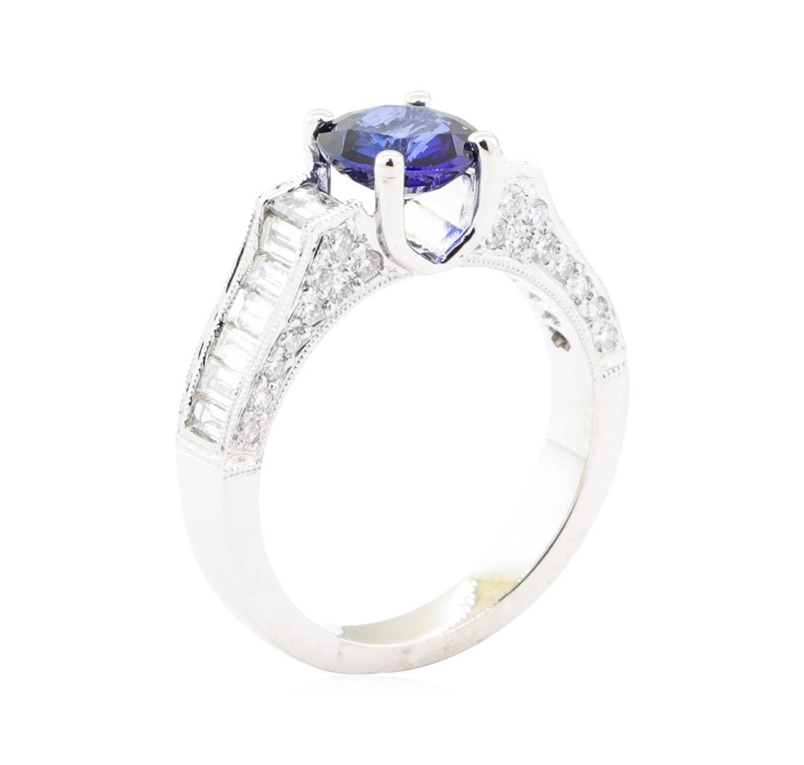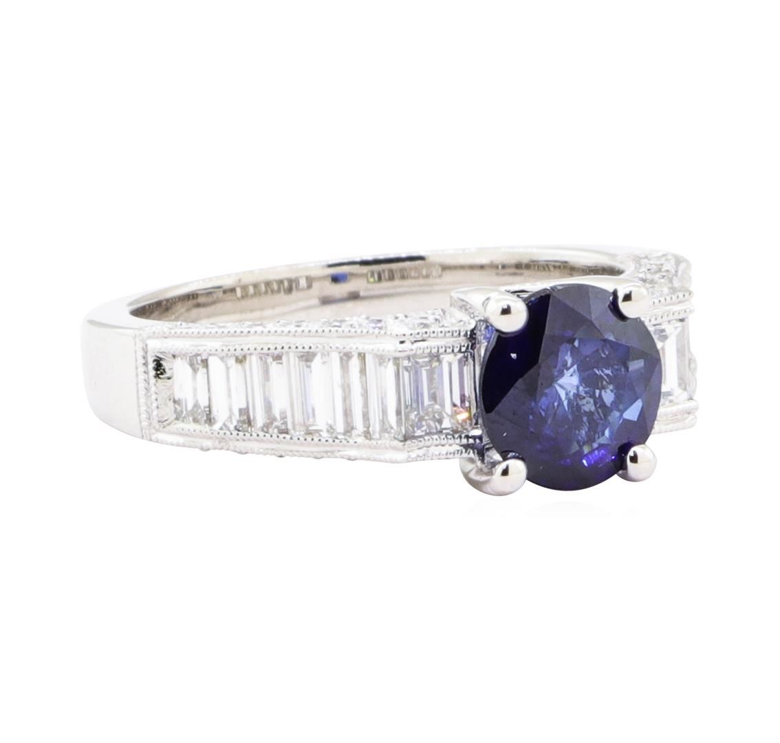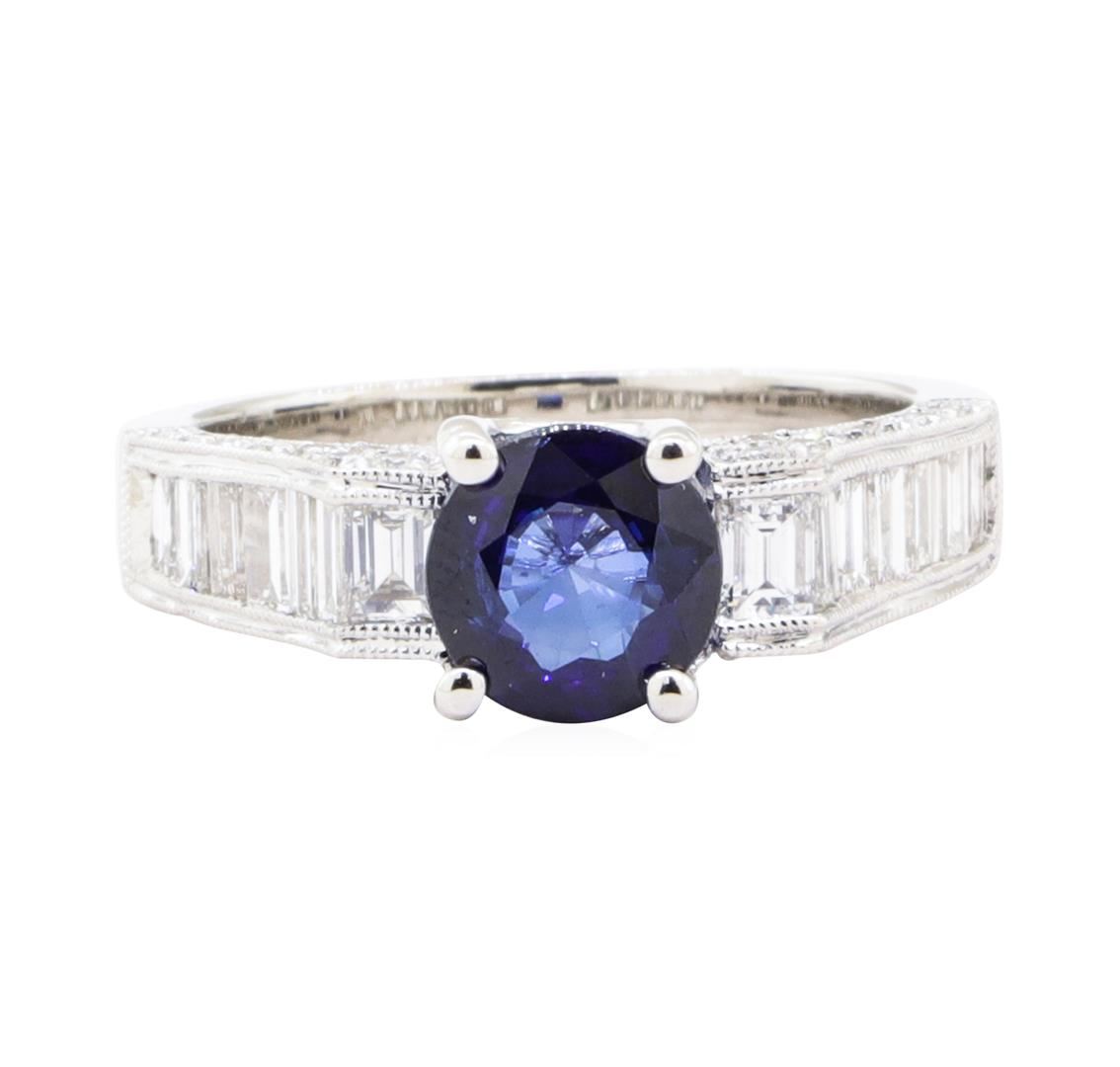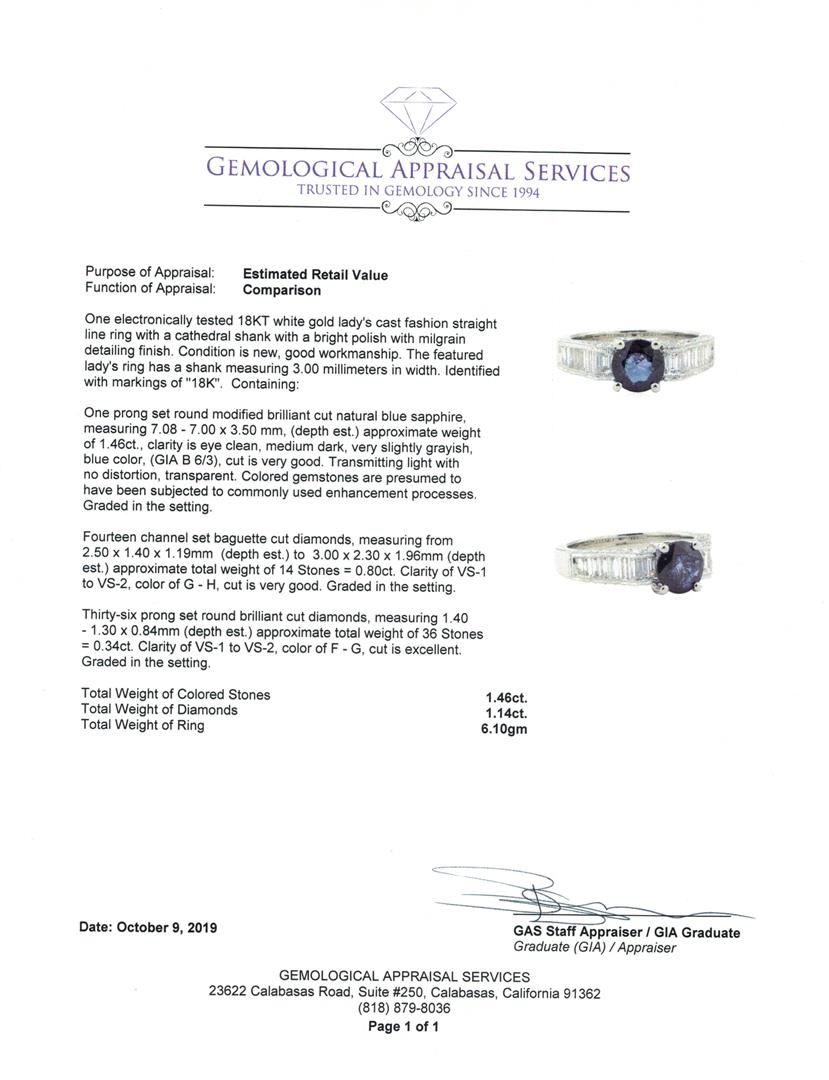 One electronically tested 18KT white gold lady's cast fashion straight line ring with a cathedral shank with a bright polish with milgrain detailing finish. The featured lady's ring has a shank measuring 3.00 millimeters in width. Identified with markings of '18K'. Condition is new, good workmanship. Containing: One prong set round modified brilliant cut natural blue sapphire, measuring 7.08 - 7.00 x 3.50 mm, (depth est.) approximate weight of 1.46ct., clarity is eye clean, medium dark, very slightly grayish, blue color, (GIA B 6/3), cut is very good. Transmitting light with no distortion, transparent. Colored gemstones are presumed to have been subjected to commonly used enhancement processes. Graded in the setting. Fourteen channel set baguette cut diamonds, measuring from 2.50 x 1.40 x 1.19mm (depth est.) to 3.00 x 2.30 x 1.96mm (depth est.) approximate total weight of 14 Stones = 0.80ct. Graded in the setting. Color G - H Clarity VS-1 to VS-2 Cut Very Good Thirty-Six prong set round brilliant cut diamonds, measuring 1.40 - 1.30 x 0.84mm (depth est.) approximate total weight of 36 Stones = 0.34ct. Graded in the setting. Color F - G Clarity VS-1 to VS-2 Cut Excellent. Total Weight of Colored Stones 1.46ct.. Total Weight of Diamonds 1.14ct.. Total Weight of Ring 6.10gm GAS Appraised at $6480.00. GAS Appraised.