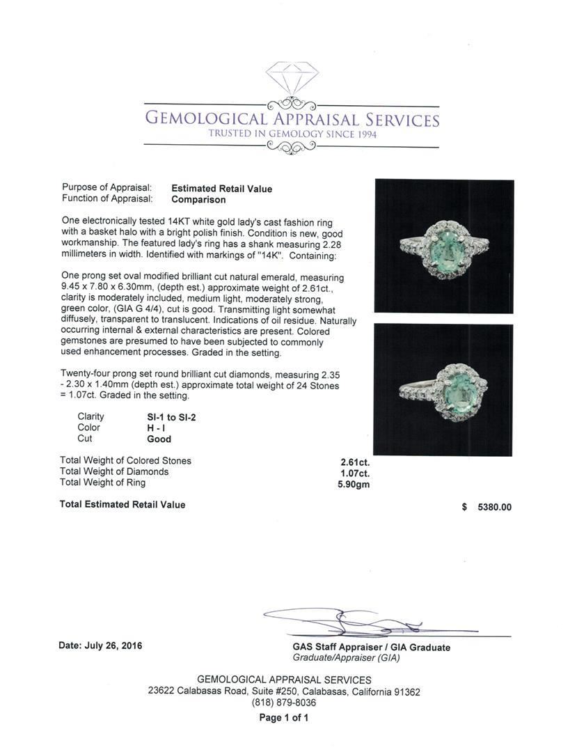 One electronically tested 14KT white gold lady's cast fashion ring with a basket halo with a bright polish finish. The featured lady's ring has a shank measuring 2.28 millimeters in width. Identified with markings of '14K'. Condition is new, good workmanship. Containing: One prong set oval modified brilliant cut natural emerald, measuring 9.45 x 7.80 x 6.30mm, (depth est.) approximate weight of 2.61ct., clarity is moderately included, medium light, moderately strong, green color, (GIA G 4/4), cut is good. Transmitting light somewhat diffusely, transparent to translucent. Indications of oil residue. Naturally occurring internal & external characteristics are present. Colored gemstones are presumed to have been subjected to commonly used enhancement processes. Graded in the setting. Twenty-Four prong set round brilliant cut diamonds, measuring 2.35 - 2.30 x 1.40mm (depth est.) approximate total weight of 24 Stones = 1.07ct. Graded in the setting. Clarity SI-1 to SI-2. Color: H - I Cut Good. Total Weight of Colored Stones 2.61ct.. Total Weight of Diamonds 1.07ct.. Total Weight of Ring 5.90gm. GAS Appraised.