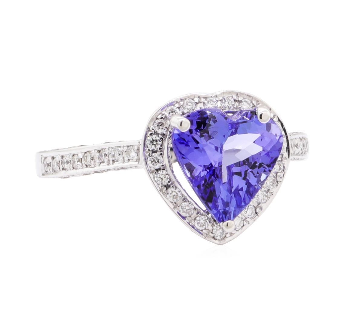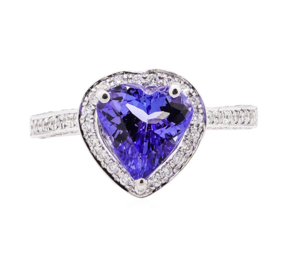 One electronically tested 14KT white gold lady's cast fashion ring with a basket halo with cathedral shank with a bright polish finish. The featured lady's ring has a shank measuring 1.70 millimeters wide. Identified with markings of '14K'. Condition is new, good workmanship. Containing: One prong set heart modified mixed cut natural tanzanite, measuring 8.50 x 8.14 x 4.96mm, (depth est.) approximate weight of 2.11ct., clarity is eye clean, medium, moderately strong, bluish violet color, (GIA bV 5/4), cut is very good. Transmitting light with no distortion, transparent. Colored gemstones are presumed to have been subjected to commonly used enhancement processes. Graded in the setting. One Hundred One prong set round brilliant cut diamonds, measuring 1.10 - 1.05 x 0.67mm (depth est.) approximate total weight of 101 Stones = 0.50ct. Graded in the setting. Color H - I Clarity SI-1 to SI-2 Cut Good. Total Weight of Colored Stones 2.11ct.. Total Weight of Diamonds 0.50ct.. Total Weight of Ring 3.10gm GAS Appraised at $4550.00. GAS Appraised.