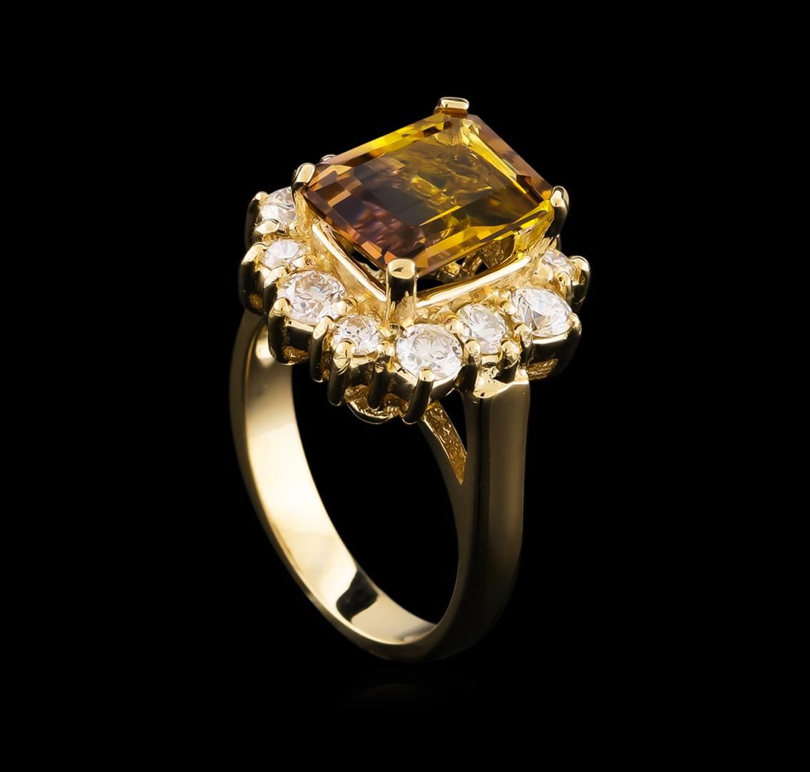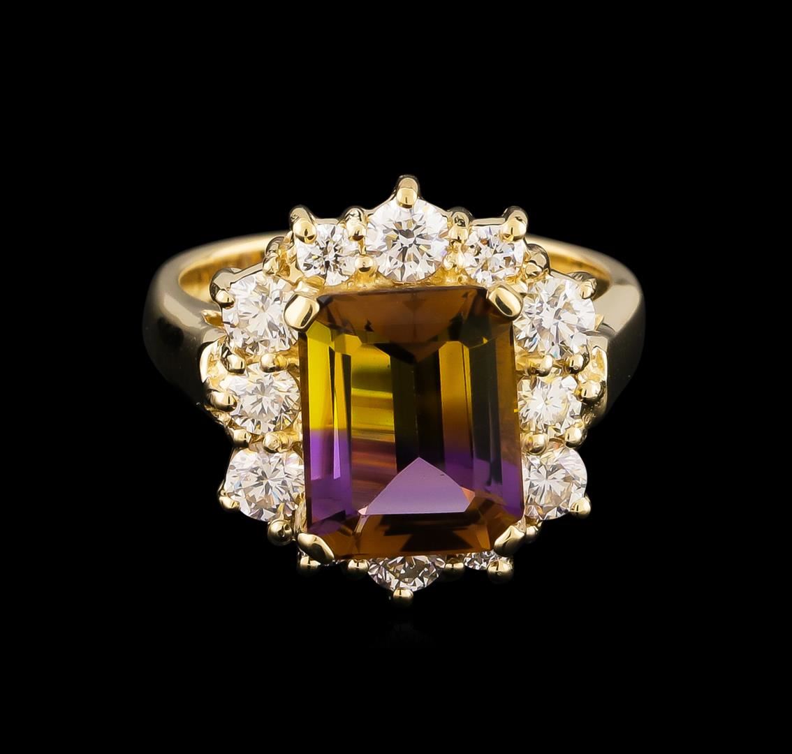 One electronically tested 14KT yellow gold lady's cast fashion ring with a basket halo with a bright polish finish. The featured lady's ring has a shank measuring 3.07 millimeters wide. Identified with markings of "14K". Condition is new, good workmanship. Containing: One prong set emerald step cut natural ametrine quartz, measuring 9.95 x 7.91 x 4.81mm, approximate weight of 2.65ct., clarity is eye clean, medium light, moderately strong, purple color, (GIA P 4/4) to medium, moderately strong, yellowish orange, (GIA yO 5/4), cut is very good. Transmitting light with no distortion, transparent. Colored gemstones are presumed to have been subjected to commonly used enhancement processes. Graded in the setting. Six prong set round brilliant cut diamonds, measuring 3.20 - 3.10 x 1.95mm (depth est.) approximate total weight of 6 Stones = 0.70ct. Graded in the setting. Clarity: VS-2 to SI-1. Color: G - Very Good Four prong set round brilliant cut diamonds, measuring 2.35 - 2.25 x 1.40mm (depth est.) approximate total weight of 4 Stones = 0.18ct. Graded in the setting. Clarity: SI-1 to SI-2. Color: H - I. Cut Good Two prong set round brilliant cut diamonds, measuring 2.80 - 2.70 x 1.65mm (depth est.) approximate total weight of 2 Stones = 0.15ct. Graded in the setting. Clarity: VS-2. Color: Very Good. Total Weight of Colored Stones 2.65ct. Total Weight of Diamonds 1.03ct. Total Weight of Ring 7.00gm. GAS Appraised.