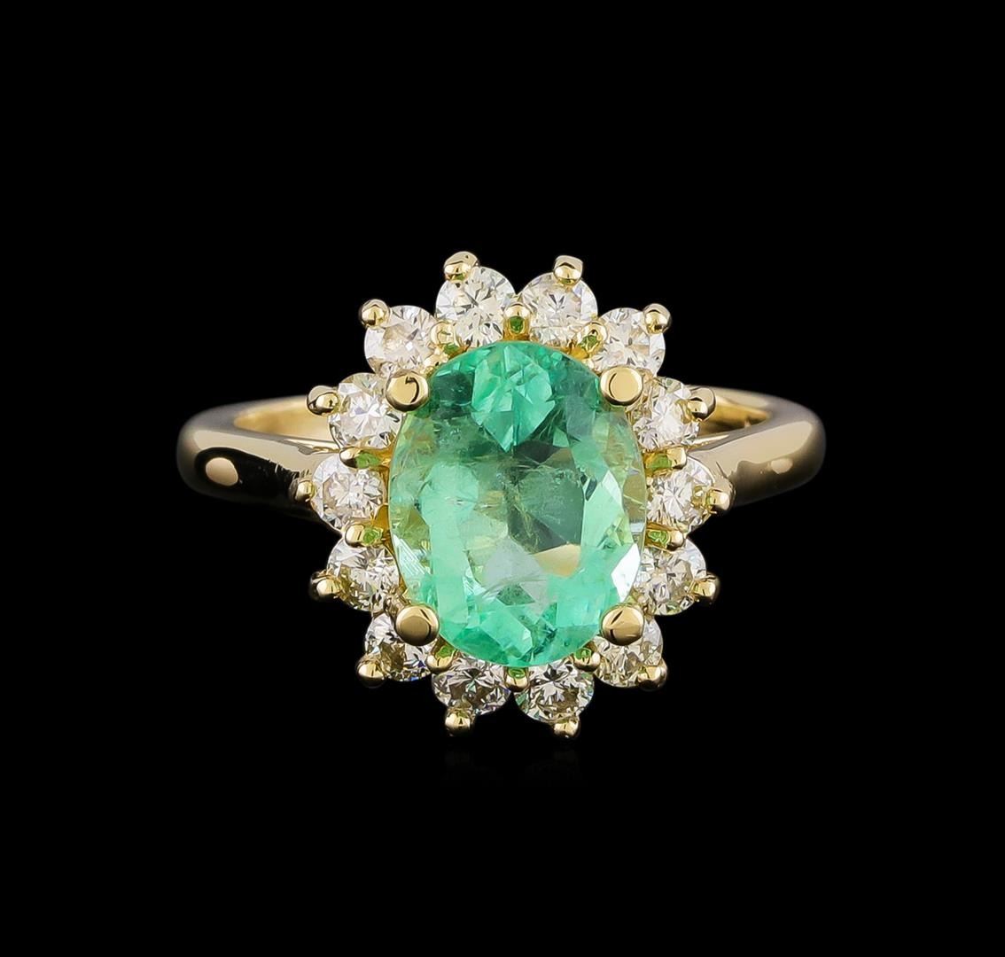 One electronically tested 14KT yellow gold lady's cast fashion ring with a cathedral basket halo with a bright polish finish. The featured lady's has a shank measuring 2.14 millimeters in width. Identified with markings of "14K". Condition is new, good workmanship. Containing: One prong set oval modified brilliant cut natural emerald, measuring 10.27 x 8.09 x 5.45mm, (depth est.) approximate weight of 2.65ct., clarity is moderately included, medium light, moderately strong, green color, (GIA G 4/4), cut is good. Transmitting light with a minimum of distortion, transparent. Indications of oil residue. Naturally occurring internal & external characteristics are present. Colored gemstones are presumed to have been subjected to commonly used enhancement processes. Graded in the setting. Fourteen prong set round brilliant cut diamonds, measuring 2.55 - 2.50 x 1.56mm (depth est.) approximate total weight of 14 Stones = 0.88ct. Graded in the setting. Clarity: SI-1 to SI-2. Color: H - Good. Total Weight of Colored Stones 2.65ct. Total Weight of Diamonds 0.88ct. Total Weight of Ring 5.40gm. GAS Appraised.