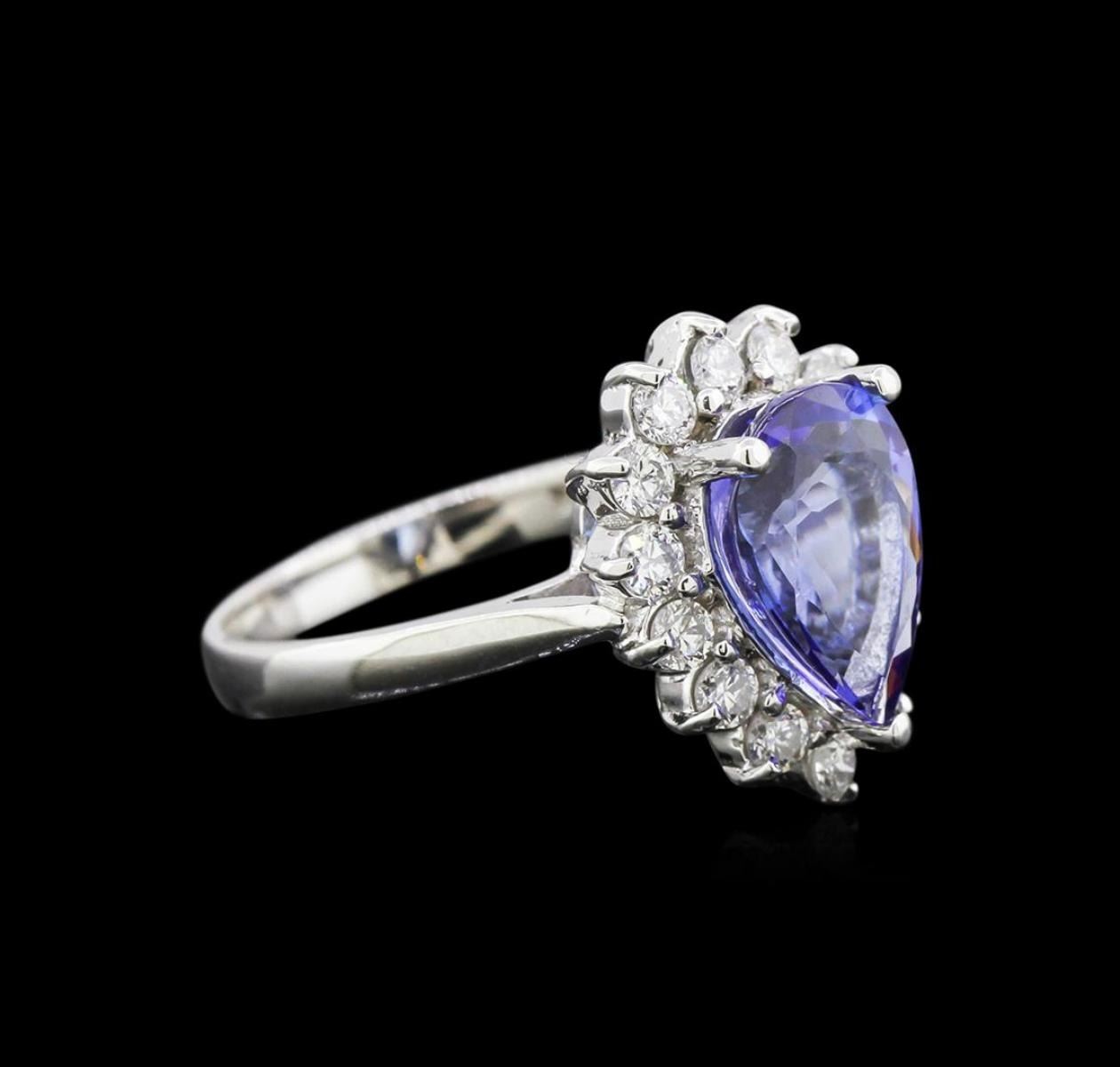 One stamped & tested 14KT white gold lady's cast cocktail ring with a half round shank with a bright polish finish. Condition is new. Containing: Fourteen prong set round brilliant cut diamonds, measuring 2.40 - 2.30 x 1.41mm (depth est.) approximate total weight of 14 Stones = 0.65ct. Clarity: SI-1 to SI-2. Color: H - I. Cut: Very Good. One prong set pear standard brilliant cut natural tanzanite, measuring 11.30 x 7.70 x 4.62mm, approximate weight of 2.70ct., clarity is eye clean, type I, medium dark, slightly grayish, bluish violet color, (GIA bV 6/2), cut is good. Total Weight of Colored Stones: 2.70ct. Total Weight of Diamonds: 0.65ct. Total Weight of Ring: 5.10 gm. GAS Appraised at $5,645.00.