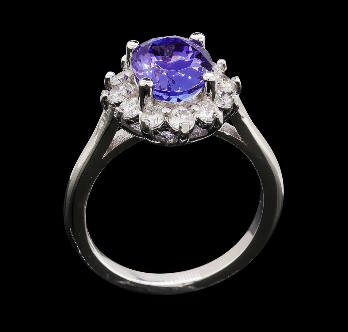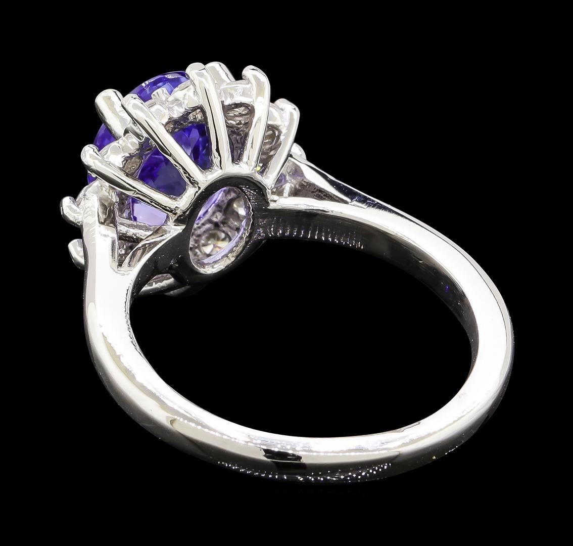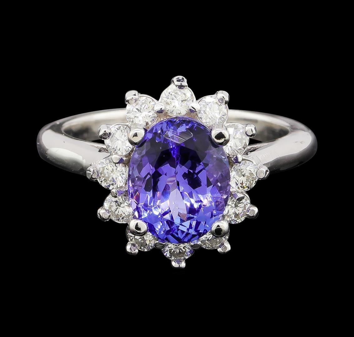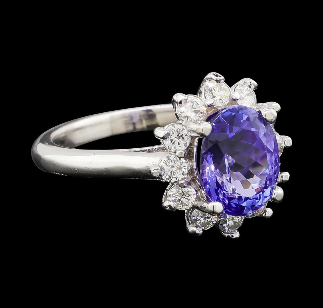 One electronically tested 14KT white gold lady's cast fashion ring with a basket halo with a bright polish finish. The featured lady's ring has a shank measuring 2.14 millimeters wide. Identified with markings of '14K'. Condition is new, good workmanship. Containing: One prong set oval modified brilliant cut natural tanzanite, measuring 9.40 x 7.50 x 5.51mm, (depth est.) approximate weight of 2.70ct., clarity is eye clean, medium, moderately strong, bluish violet color, (GIA bV 5/4), cut is very good. Transmitting light with no distortion, transparent. Colored gemstones are presumed to have been subjected to commonly used enhancement processes. Graded in the setting. Twelve prong set round brilliant cut diamonds, measuring 2.40 - 2.30 x 1.43mm (depth est.) approximate total weight of 12 Stones = 0.58ct. Graded in the setting. Clarity SI-1 to SI-2. Color: H - I Cut Good. Total Weight of Colored Stones 2.70ct.. Total Weight of Diamonds 0.58ct.. Total Weight of Ring 5.30gm.