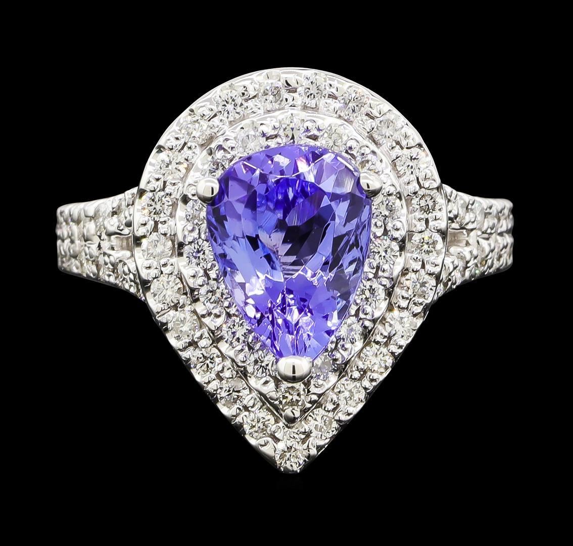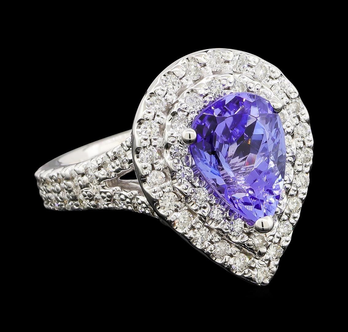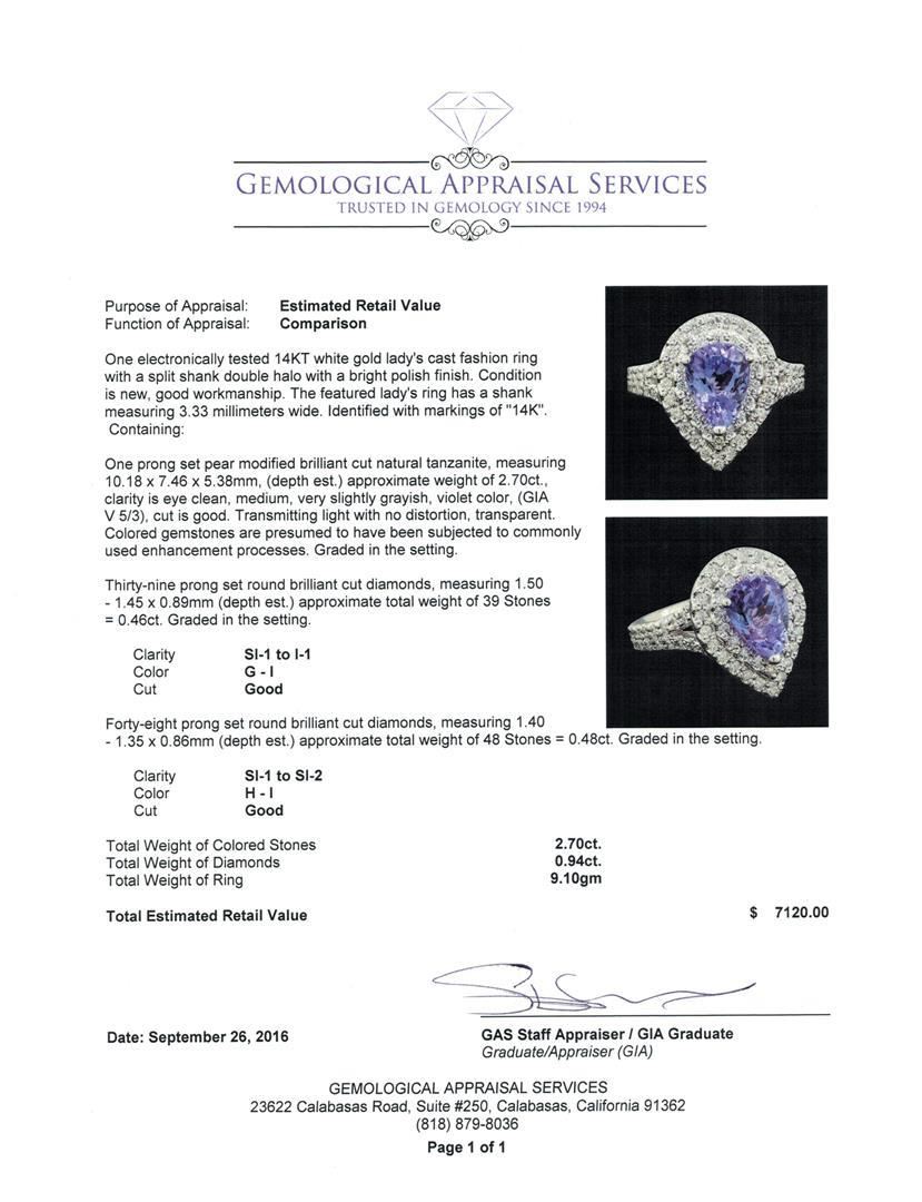 One electronically tested 14KT white gold lady's cast fashion ring with a split shank double halo with a bright polish finish. The featured lady's ring has a shank measuring 3.33 millimeters wide. Identified with markings of '14K'. Condition is new, good workmanship. Containing: One prong set pear modified brilliant cut natural tanzanite, measuring 10.18 x 7.46 x 5.38mm, (depth est.) approximate weight of 2.70ct., clarity is eye clean, medium, very slightly grayish, violet color, (GIA V 5/3), cut is good. Transmitting light with no distortion, transparent. Colored gemstones are presumed to have been subjected to commonly used enhancement processes. Graded in the setting. Thirty-Nine prong set round brilliant cut diamonds, measuring 1.50 - 1.45 x 0.89mm (depth est.) approximate total weight of 39 Stones = 0.46ct. Graded in the setting. Clarity SI-1 to I-1. Color: G - I Cut Good Forty-Eight prong set round brilliant cut diamonds, measuring 1.40 - 1.35 x 0.86mm (depth est.) approximate total weight of 48 Stones = 0.48ct. Graded in the setting. Clarity SI-1 to SI-2. Color: H - I Cut Good. Total Weight of Colored Stones 2.70ct.. Total Weight of Diamonds 0.94ct.. Total Weight of Ring 9.10gm.