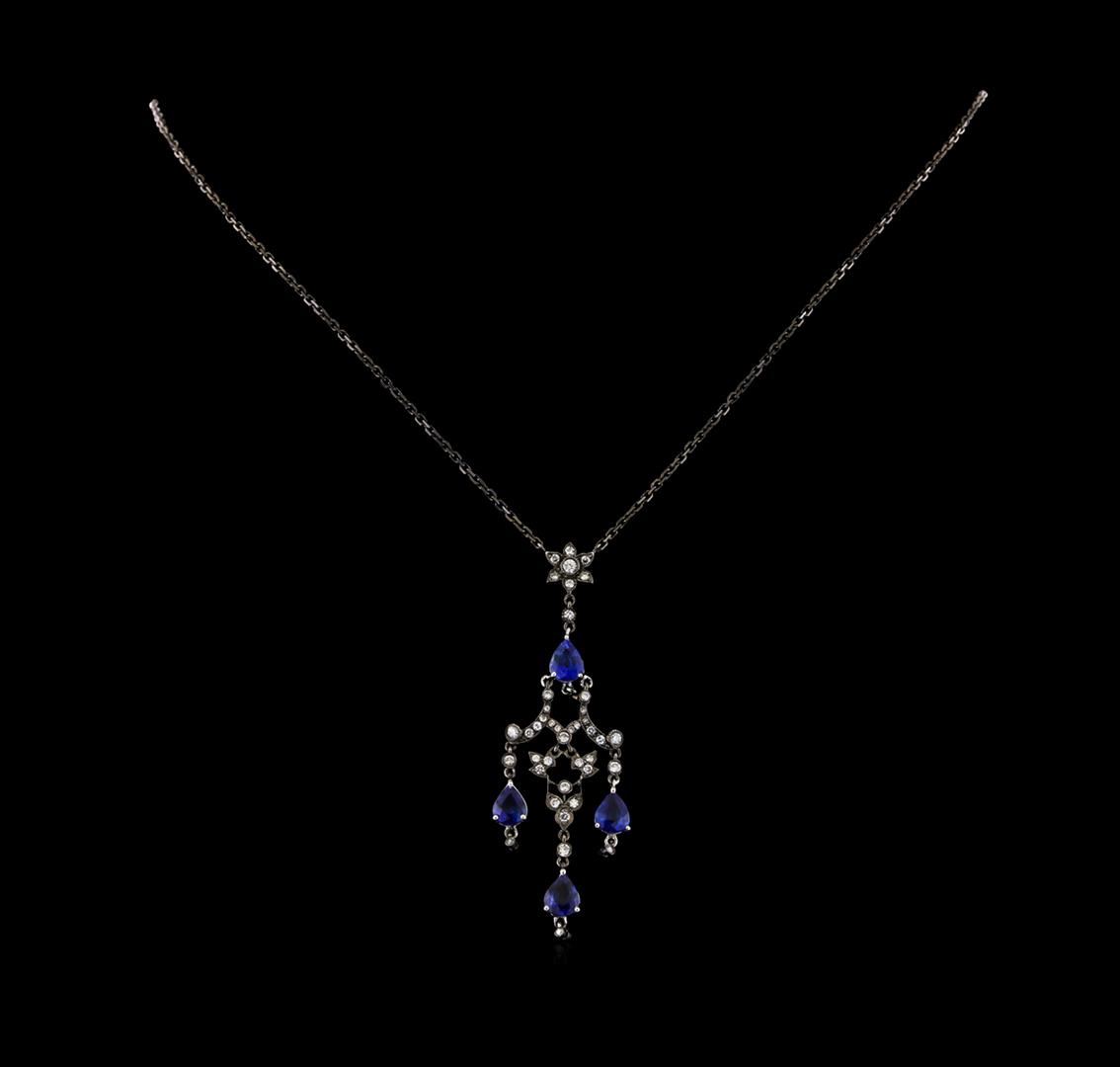 One electronically tested 18KT rose and white gold lady's combination cast & assembled fashion necklace with a spring ring clasp with a art deco with a antiqued finish. The featured necklace has a 1mm attached diamond cut cable link at 16 inches. The necklace is antiqued with black rhodium. Identified with markings of "750". Condition is new, good workmanship. Containing: Four prong set pear modified brilliant cut natural blue sapphires, measuring 5.90 x 4.74 x 2.90mm, (depth est.) approximate total weight of 2.71ct., clarity is slightly included, medium, very slightly grayish, violetish blue color, (GIA vB 5/3), cut is very good. Transmitting light with a minimum of distortion, transparent. Colored gemstones are presumed to have been subjected to commonly used enhancement processes. Graded in the setting. Forty-Two prong set round brilliant cut diamonds, measuring 1.60 - 1.10 x 0.84mm (depth est.) approximate total weight of 42 Stones = 0.44ct. The featured necklace has a mix of round brilliant and round single cut diamonds. Graded in the setting. Clarity: SI-1 to SI-2. Color: H - I. Cut Good. Total Weight of Colored Stones 2.71ct. Total Weight of Diamonds 0.44ct. Total Weight of Necklace 7.10gm. GAS Appraised.
