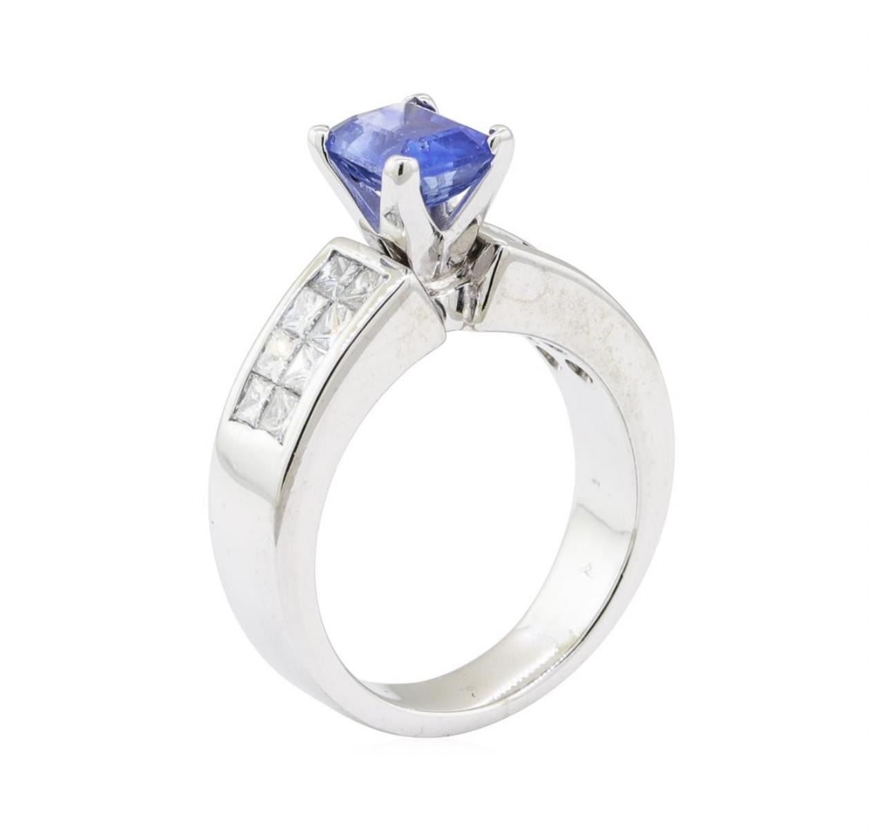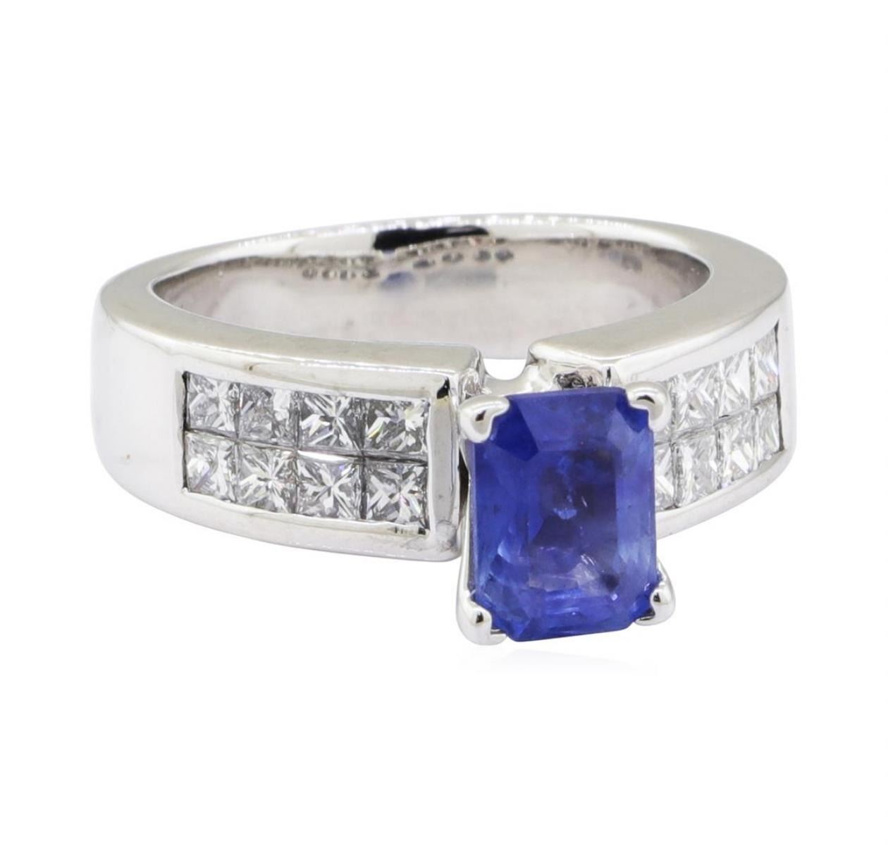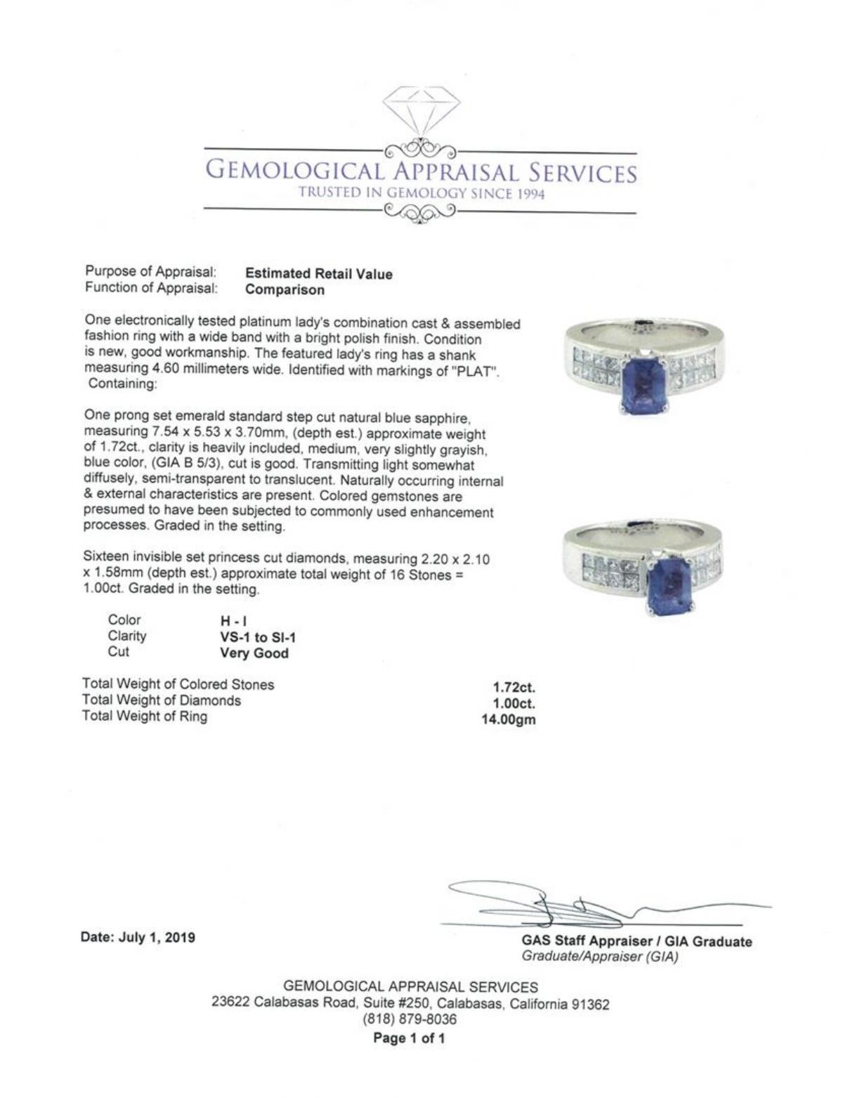 One electronically tested platinum lady's combination cast & assembled fashion ring with a wide band with a bright polish finish. The featured lady's ring has a shank measuring 4.60 millimeters wide. Identified with markings of 'PLAT'. Condition is new, good workmanship. Containing: One prong set emerald standard step cut natural blue sapphire, measuring 7.54 x 5.53 x 3.70mm, (depth est.) approximate weight of 1.72ct., clarity is heavily included, medium, very slightly grayish, blue color, (GIA B 5/3), cut is good. Transmitting light somewhat diffusely, semi-transparent to translucent. Naturally occurring internal & external characteristics are present. Colored gemstones are presumed to have been subjected to commonly used enhancement processes. Graded in the setting. Sixteen invisible set princess cut diamonds, measuring 2.20 x 2.10 x 1.58mm (depth est.) approximate total weight of 16 Stones = 1.00 ct. Graded in the setting. Color H - I Clarity VS-1 to SI-1 Cut Very Good. Total Weight of Colored Stones 1.72ct.. Total Weight of Diamonds 1.00 ct.. Total Weight of Ring 14.00gm GAS Appraised at $5505.00. GAS Appraised.