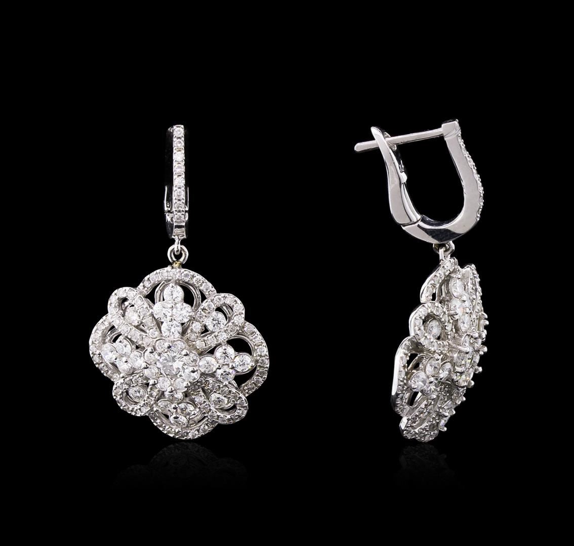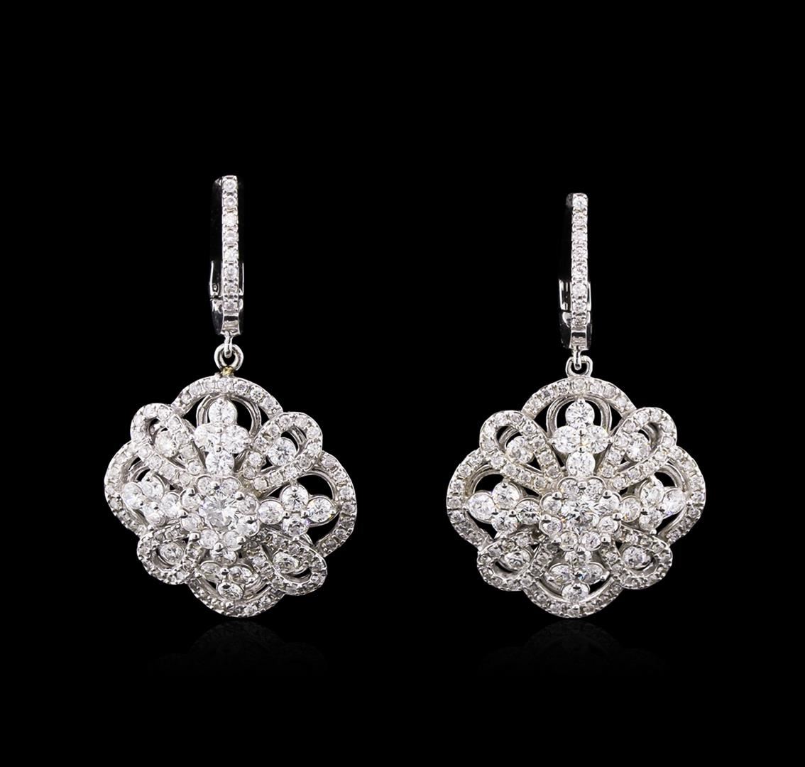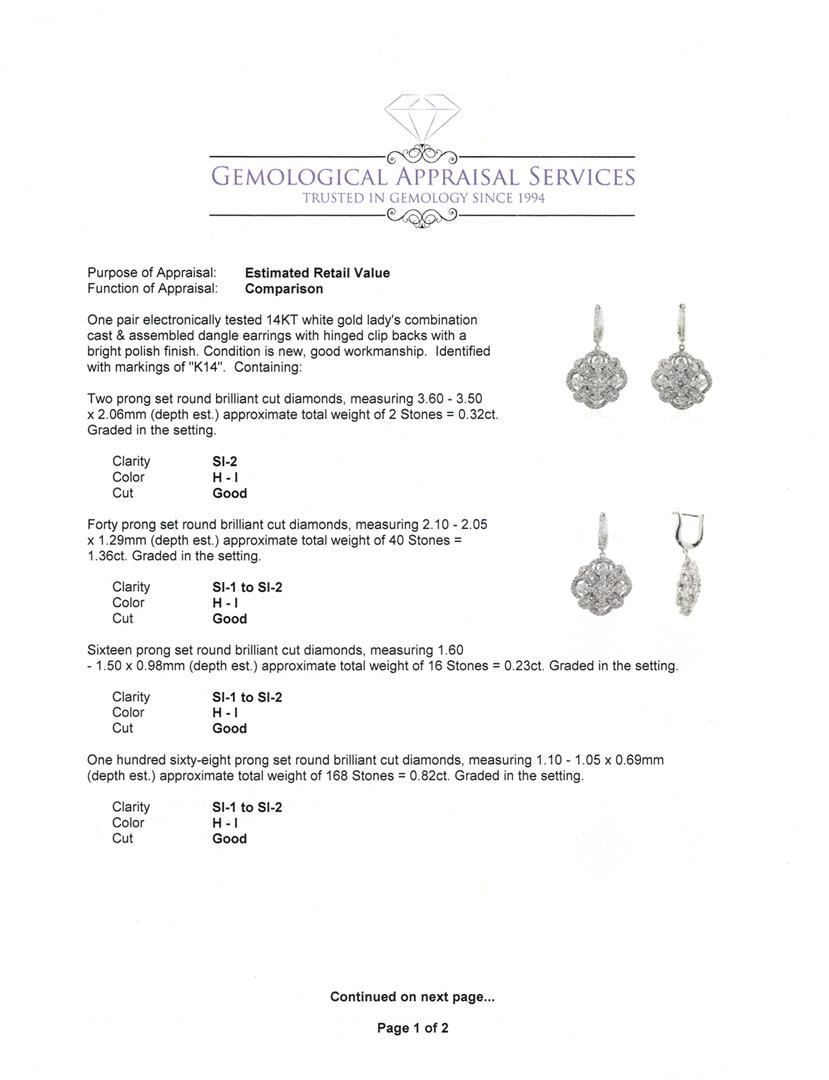 One pair electronically tested 14KT white gold lady's combination cast & assembled dangle earrings with hinged clip backs with a bright polish finish. Identified with markings of "K14". Condition is new, good workmanship. Containing: Two prong set round brilliant cut diamonds, measuring 3.60 - 3.50 x 2.06mm (depth est.) approximate total weight of 2 Stones = 0.32ct. Graded in the setting. Clarity: SI-2 . Color: H - I. Cut Good Forty prong set round brilliant cut diamonds, measuring 2.10 - 2.05 x 1.29mm (depth est.) approximate total weight of 40 Stones = 1.36ct. Graded in the setting. Clarity: SI-1 to SI-2 . Color: H - I. Cut Good Sixteen prong set round brilliant cut diamonds, measuring 1.60 - 1.50 x 0.98mm (depth est.) approximate total weight of 16 Stones = 0.23ct. Graded in the setting. Clarity: SI-1 to SI-2 . Color: H - I. Cut Good One Hundred Sixty-Eight prong set round brilliant cut diamonds, measuring 1.10 - 1.05 x 0.69mm (depth est.) approximate total weight of 168 Stones = 0.82ct. Graded in the setting. Clarity: SI-1 to SI-2 . Color: H - I. Cut Good. Total Weight of Diamonds 2.73ct.. Total Weight of Earrings 9.20gm at $ 9115.00 GAS Appraised.