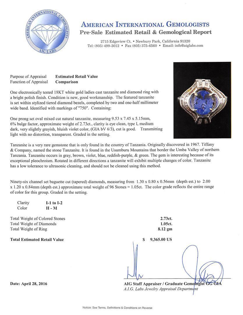 One electronically tested 18KT white gold ladies cast tanzanite and diamond ring with a bright polish finish. The featured tanzanite is set within stylized tiered diamond bezels, completed by two and one-half millimeter wide band. Identified with markings of "750". Condition is new, good workmanship. Containing: One prong set oval mixed cut natural tanzanite, measuring 9.53 x 7.45 x 5.15mm, 6%. bulge factor, approximate weight of 2.73ct., clarity is eye clean, type I, medium dark, very slightly grayish, bluish violet color, (GIA bV 6/3), cut is good. Transmitting light with no distortion, transparent. Graded in the setting. Tanzanite is a very rare gemstone that is only found in the country of Tanzania. Originally discovered in 1967. Tiffany & Company, named the stone Tanzanite. It is found in the Usumburu Mountains that border the Umba Valley of northern Tanzania. Tanzanite occurs in gray, brown, violet, blue, reddish-purple, & green. The gem is interesting because of its exceptional pleochroism. Rotated in different directions a tanzanite will exhibit multiple changes of color. Tanzanite has a low tolerance to ultrasonic cleaning, and should not be cleaned using this method. Ninety-Six channel set baguette cut (tapered) diamonds, measuring from 1.30 x 0.80 x 0.56mm (depth est.) to 2.00 x 1.20 x 0.84mm (depth est.) approximate total weight of 96 Stones = 1.05ct. The color grade reflects the entire range of color for this group. Graded in the setting. Clarity: I-1 to I-2. Color: H - M. Total Weight of Colored Stones 2.73ct. Total Weight of Diamonds 1.05ct. Total Weight of Ring 8.12gm.