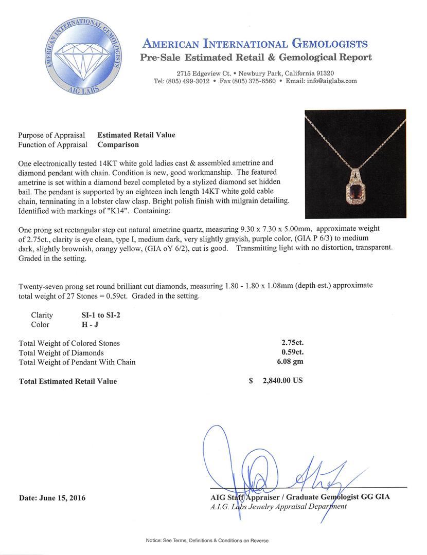 One electronically tested 14KT white gold ladies cast & assembled ametrine and diamond pendant with chain. The featured ametrine is set within a diamond bezel completed by a stylized diamond set hidden bail. The pendant is supported by an eighteen inch length 14KT white gold cable chain, terminating in a lobster claw clasp. Bright polish finish with milgrain detailing. Identified with markings of "K14". Condition is new, good workmanship. Containing: One prong set rectangular step cut natural ametrine quartz, measuring 9.30 x 7.30 x 5.00mm, approximate weight of 2.75ct., clarity is eye clean, type I, medium dark, very slightly grayish, purple color, (GIA P 6/3) to medium dark, slightly brownish, orangy yellow, (GIA oY 6/2), cut is good. Transmitting light with no distortion, transparent. Graded in the setting. Twenty-Seven prong set round brilliant cut diamonds, measuring 1.80 - 1.80 x 1.08mm (depth est.) approximate total weight of 27 Stones = 0.59ct. Graded in the setting. Clarity: SI-1 to SI-2. Color: H - J. Total Weight of Colored Stones 2.75ct. Total Weight of Diamonds 0.59ct. Total Weight of Pendant With Chain 6.08gm. AIG Appraised at $2,840.00.