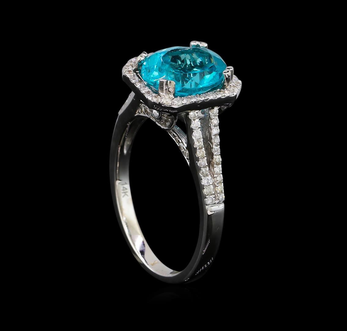 One electronically tested 14KT white gold lady's cast split shank halo ring with a bright polish finish. The featured ladies ring has a shank measuring 2.50 millimeters in width. Trademark is Orianne. Identified with markings of "14K". Condition is new, good workmanship. Containing: One prong set oval modified brilliant cut natural apatite, measuring 9.82 x 7.98 x 5.23mm, approximate weight of 2.75ct., clarity is slightly included, medium, moderately strong, green blue color, (GIA GB 5/4), cut is good. Transmitting light somewhat diffusely, semi-transparent to translucent. Colored gemstones are presumed to have been subjected to commonly used enhancement processes. Graded in the setting. One Hundred Ten prong set round brilliant cut diamonds, measuring 1.10 - 1.00 x 0.66mm (depth est.) approximate total weight of 110 Stones = 0.45ct. Graded in the setting. Clarity: SI-2 to I-1. Color: G - I. Cut Good. Total Weight of Colored Stones 2.75ct. Total Weight of Diamonds 0.45ct. Total Weight of Ring 4.70gm. GAS Appraised.