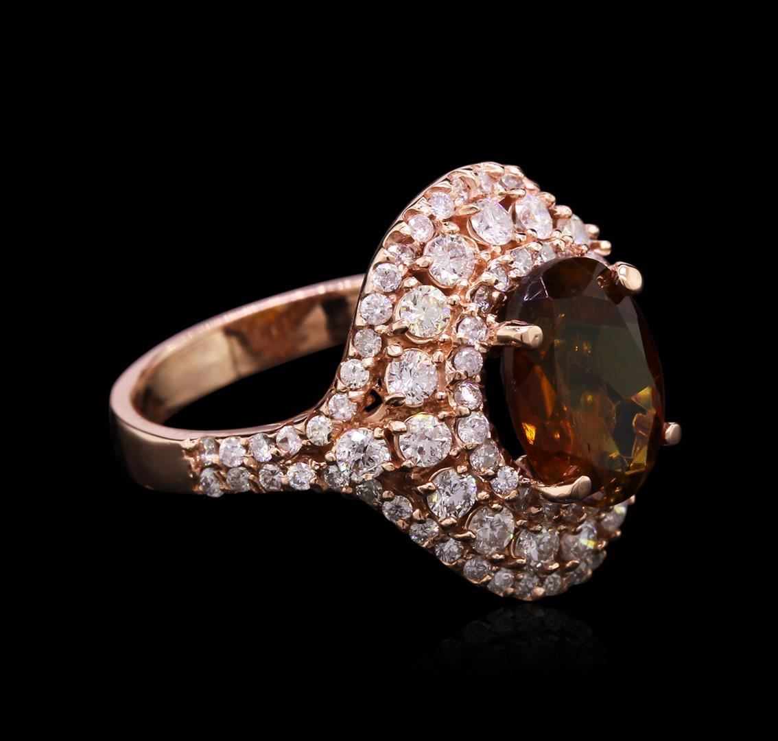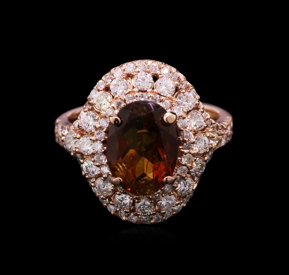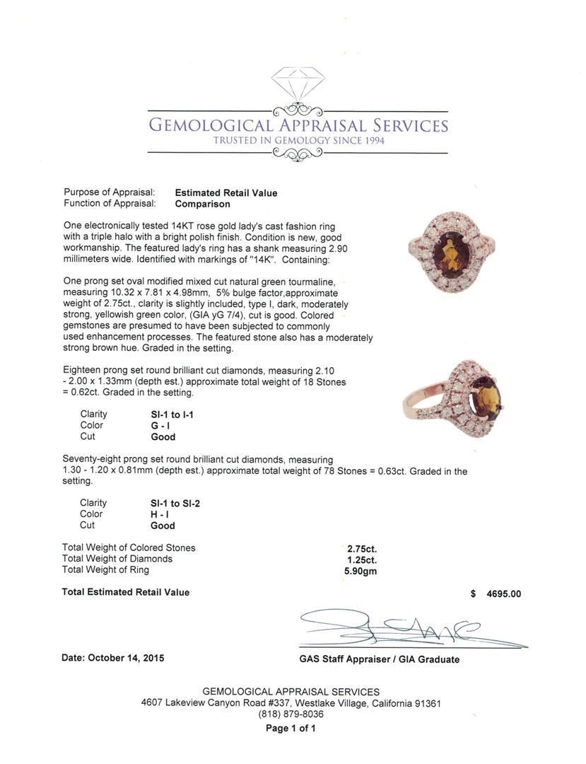 One electronically tested 14KT rose gold lady's cast fashion ring with a triple halo with a bright polish finish. The featured lady's ring has a shank measuring 2.90 millimeters wide. Identified with markings of "14K". Condition is new, good workmanship. Containing: One prong set oval modified mixed cut natural green tourmaline, measuring 10.32 x 7.81 x 4.98mm, 5% bulge factor, approximate weight of 2.75ct., clarity is slightly included, type I, dark, moderately strong, yellowish green color, (GIA yG 7/4), cut is good. Colored gemstones are presumed to have been subjected to commonly used enhancement processes. The featured stone also has a moderately strong brown hue. Graded in the setting. Eighteen prong set round brilliant cut diamonds, measuring 2.10 - 2.00 x 1.33mm (depth est.) approximate total weight of 18 Stones = 0.62ct. Graded in the setting. Clarity: SI-1 to I-1. Color: G - I. Cut Good Seventy-Eight prong set round brilliant cut diamonds, measuring 1.30 - 1.20 x 0.81mm (depth est.) approximate total weight of 78 Stones = 0.63ct. Graded in the setting. Clarity: SI-1 to SI-2. Color: H - I. Cut Good. Total Weight of Colored Stones 2.75ct. Total Weight of Diamonds 1.25ct. Total Weight of Ring 5.90gm. GAS Appraised.