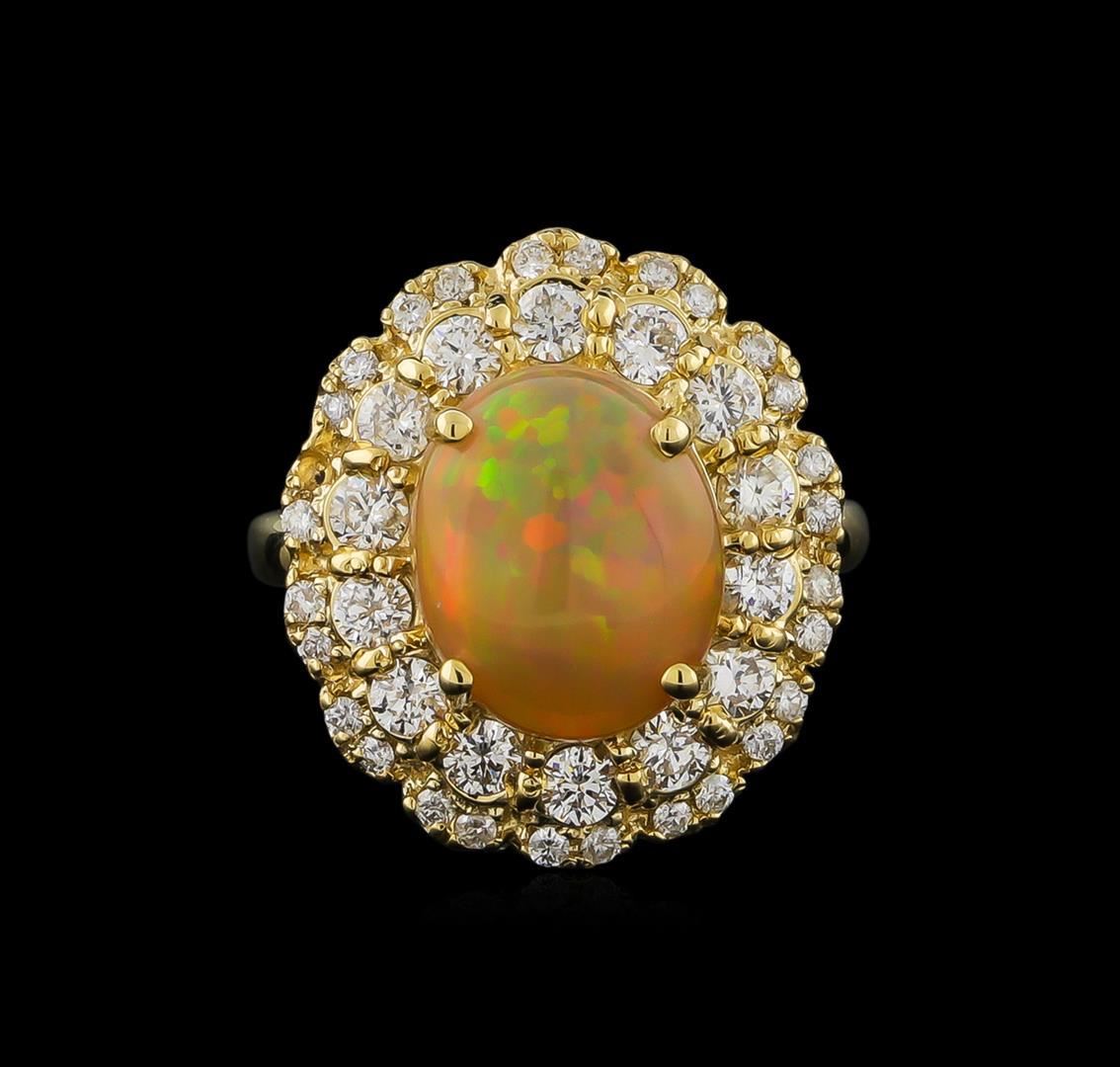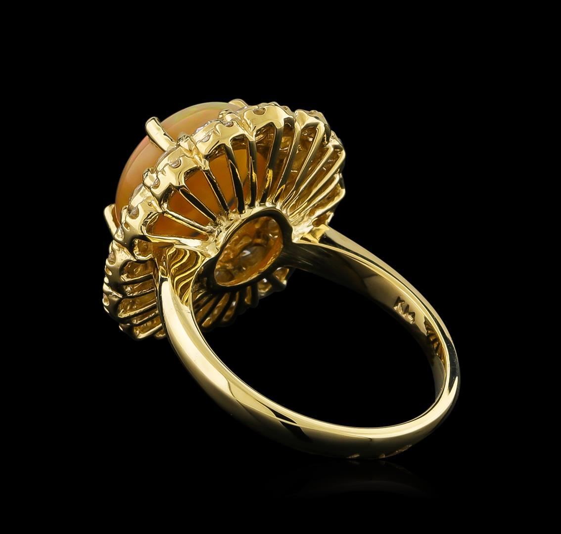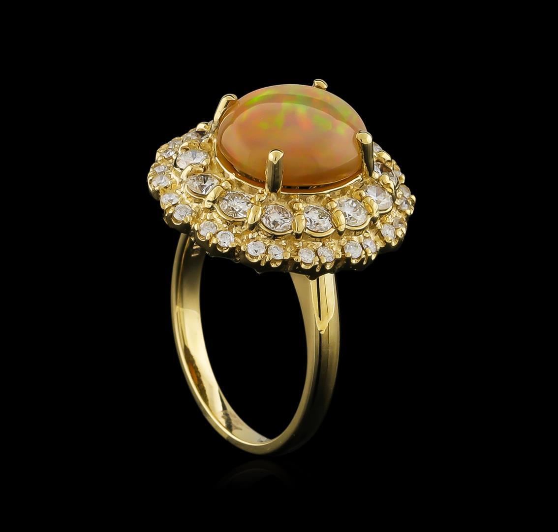 One electronically tested 14KT yellow gold lady's cast fashion ring with a scalloped double basket halo with a bright polish finish. The featured lady's ring has a shank measuring 2.17 millimeters wide. Identified with markings of "14K". Condition is new, good workmanship. Containing: One orange opal that is cut in a oval shaped cabochon and is prong set, measuring 11.99 mm long x 9.90 mm wide, and 4.70 mm thick and the approximate weight is 2.75 carats. The opal has a bright, orange-red play of color (fire) in a rolling flashfire pattern; a medium dome; a good cut; no inclusions; consistent in its brightness and pattern; and is not directional. Graded in the setting. Fourteen prong set round brilliant cut diamonds, measuring 2.75 - 2.65 x 1.67mm (depth est.) approximate total weight of 14 Stones = 1.05ct. Graded in the setting. Clarity: SI-1 to SI-2. Color: H - I. Cut Very Good Twenty-Eight prong set round brilliant cut diamonds, measuring 1.40 - 1.30 x 0.84mm (depth est.) approximate total weight of 28 Stones = 0.26ct. Graded in the setting. Clarity: SI-1 to I-1. Color: H - I. Cut Good. Total Weight of Diamonds 1.31ct. Total Weight of Opals 2.75ct. Total Weight of Ring 7.70gm. GAS Appraised.