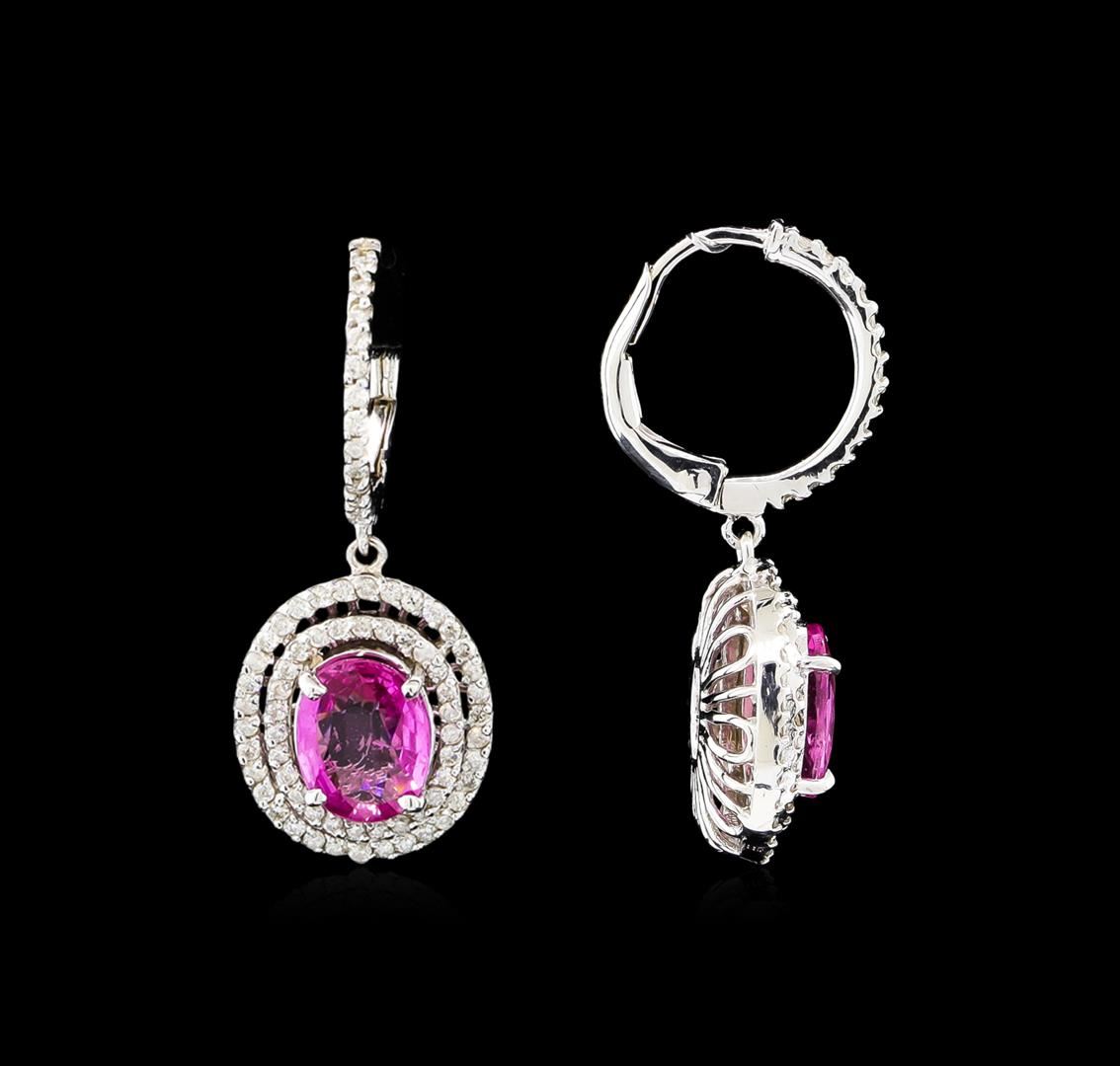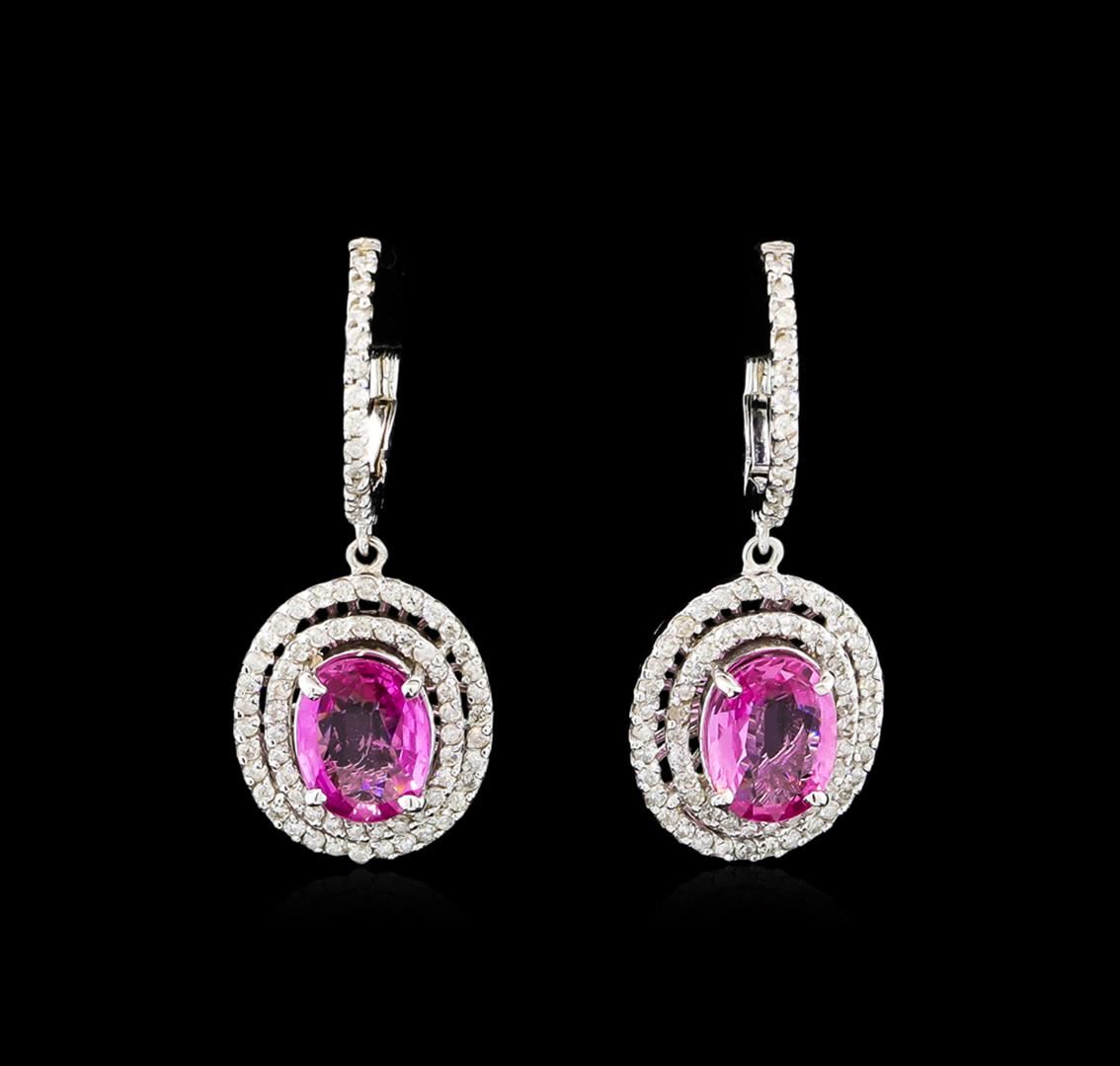One pair electronically tested 14KT white gold lady's combination cast & assembled fashion earrings with hinged clip backs with a double basket halo with a bright polish finish. Identified with markings of "K14". Condition is new, good workmanship. Containing: Two prong set oval modified brilliant cut natural pink sapphires, measuring 8.25 x 6.10 x 2.80mm, 15%. bulge factor, approximate total weight of 2.75ct., clarity is slightly included, type II, medium, moderately strong, slightly purplish red color, (GIA slpR 5/4), cut is very good. Colored gemstones are presumed to have been subjected to commonly used enhancement processes. Graded in the setting. One Hundred Forty-Eight prong set round brilliant cut diamonds, measuring 1.15 - 1.05 x 0.68mm (depth est.) approximate total weight of 148 Stones = 0.75ct. Graded in the setting. Clarity: SI-1 to I-1. Color: H - I. Cut Good. Total Weight of Colored Stones 2.75ct. Total Weight of Diamonds 0.75ct. Total Weight of Earrings 5.30gm. GAS Appraised at $9,650.00.