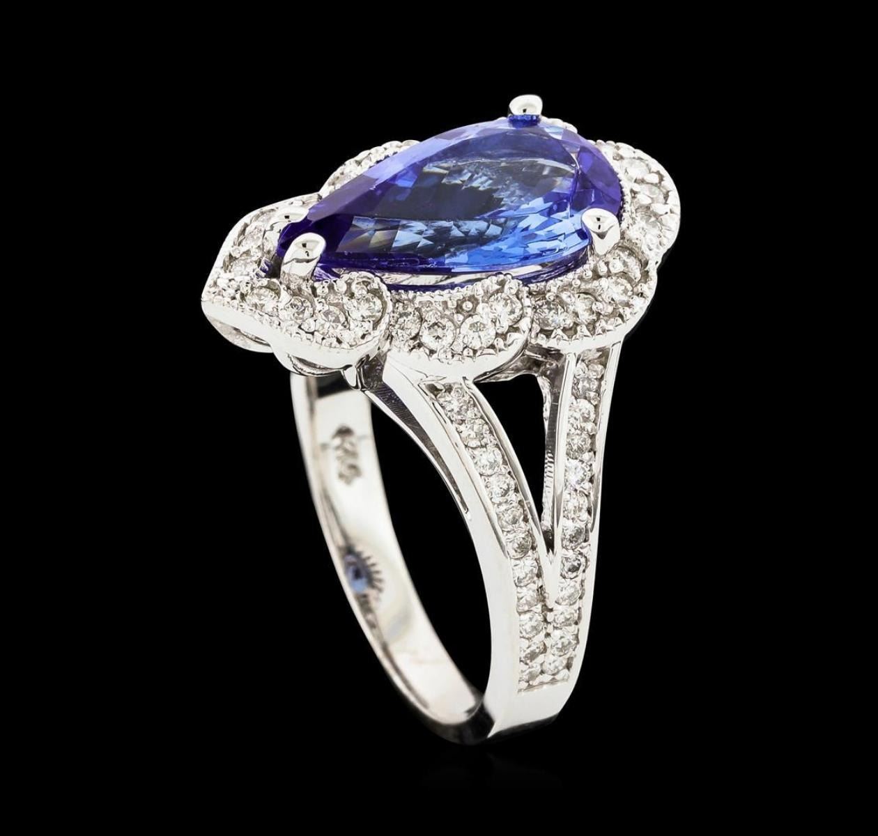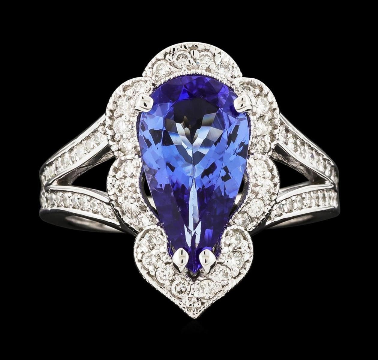 One electronically tested 14KT white gold lady's cast fashion ring with a split shank scalloped basket halo with a bright polish with milgrain detailing finish. The featured lady's ring has a shank measuring 2.60 millimeters wide. Identified with markings of 'K14'. Condition is new, good workmanship. Containing: One prong set pear modified brilliant cut natural tanzanite, measuring 13.65 x 7.60 x 4.38mm, (depth est.) approximate weight of 2.75ct., clarity is eye clean, medium, very slightly grayish, violet color, (GIA V 5/3), cut is good. Transmitting light with no distortion, transparent. Colored gemstones are presumed to have been subjected to commonly used enhancement processes. Graded in the setting. Twenty-Eight prong set round brilliant cut diamonds, measuring 1.40 - 1.35 x 0.86mm (depth est.) approximate total weight of 28 Stones = 0.28ct. Graded in the setting. Clarity SI-1 to SI-2. Color: H - I Cut Good Forty-Four prong set round brilliant cut diamonds, measuring 1.20 - 1.15 x 0.73mm (depth est.) approximate total weight of 44 Stones = 0.27ct. Graded in the setting. Clarity SI-1 to I-1. Color: H - I Cut Good. Total Weight of Colored Stones 2.75ct.. Total Weight of Diamonds 0.55ct.. Total Weight of Ring 7.00gm. GAS Appraised.