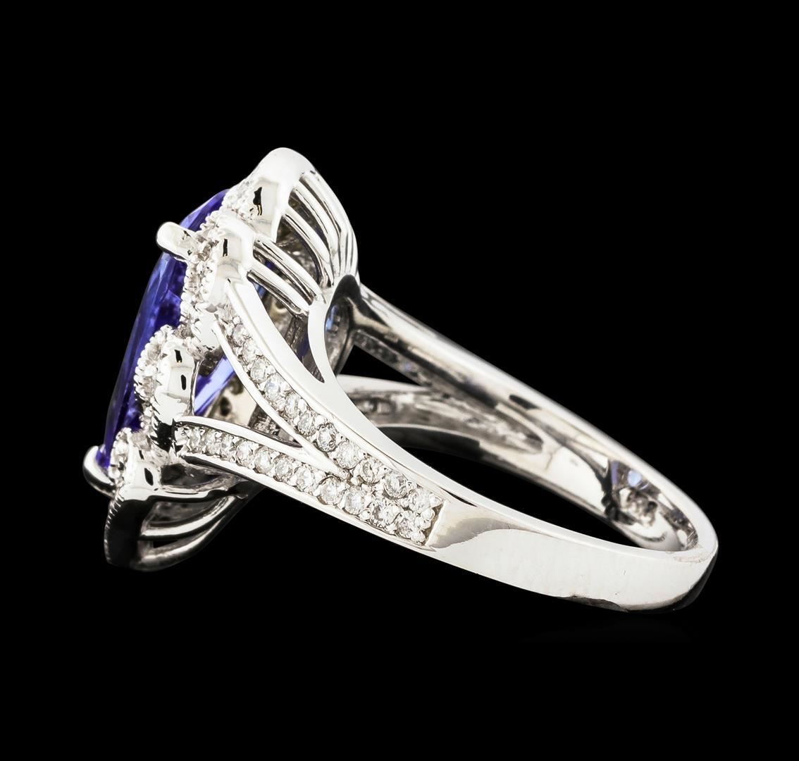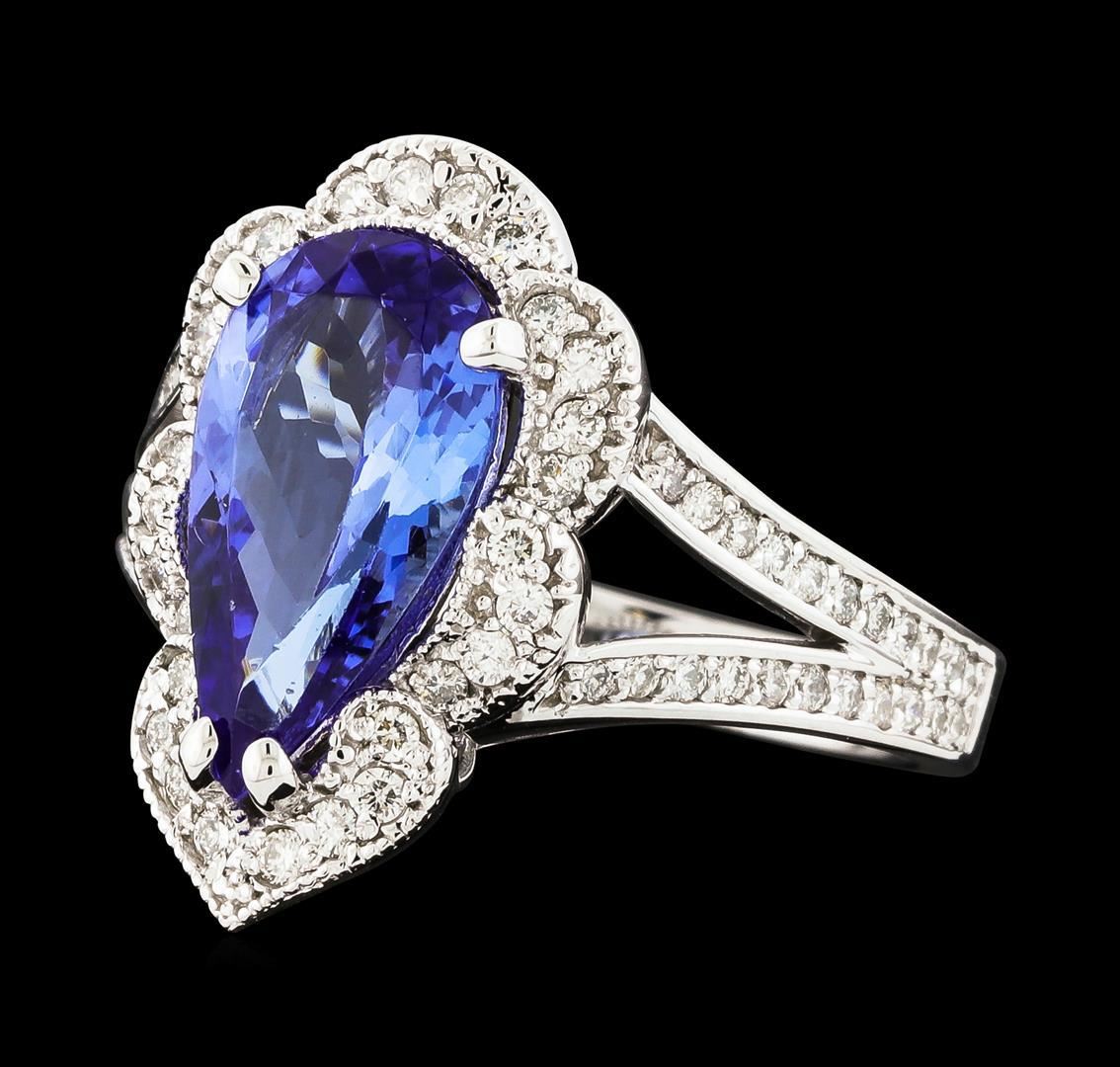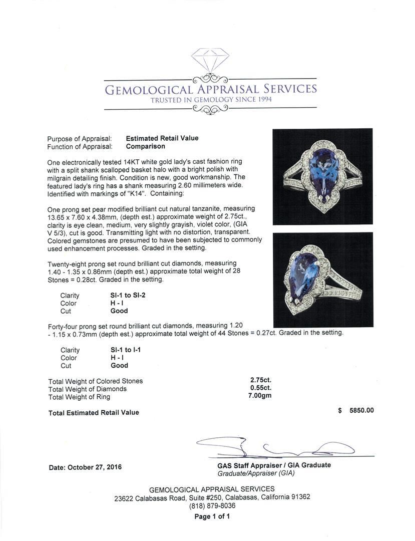 One electronically tested 14KT white gold lady's cast fashion ring with a split shank scalloped basket halo with a bright polish with milgrain detailing finish. The featured lady's ring has a shank measuring 2.60 millimeters wide. Identified with markings of 'K14'. Condition is new, good workmanship. Containing: One prong set pear modified brilliant cut natural tanzanite, measuring 13.65 x 7.60 x 4.38mm, (depth est.) approximate weight of 2.75ct., clarity is eye clean, medium, very slightly grayish, violet color, (GIA V 5/3), cut is good. Transmitting light with no distortion, transparent. Colored gemstones are presumed to have been subjected to commonly used enhancement processes. Graded in the setting. Twenty-Eight prong set round brilliant cut diamonds, measuring 1.40 - 1.35 x 0.86mm (depth est.) approximate total weight of 28 Stones = 0.28ct. Graded in the setting. Clarity SI-1 to SI-2. Color: H - I Cut Good Forty-Four prong set round brilliant cut diamonds, measuring 1.20 - 1.15 x 0.73mm (depth est.) approximate total weight of 44 Stones = 0.27ct. Graded in the setting. Clarity SI-1 to I-1. Color: H - I Cut Good. Total Weight of Colored Stones 2.75ct.. Total Weight of Diamonds 0.55ct.. Total Weight of Ring 7.00gm. GAS Appraised.