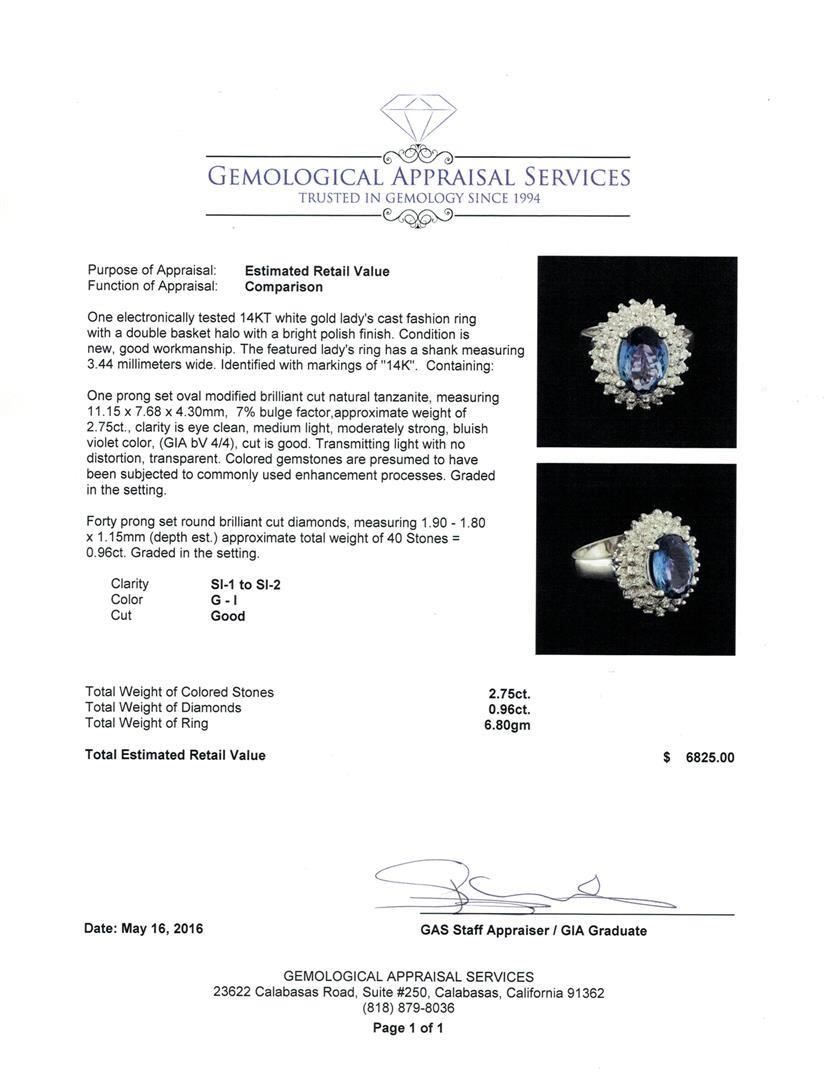 One electronically tested 14KT white gold lady's cast fashion ring with a double basket halo with a bright polish finish. The featured lady's ring has a shank measuring 3.44 millimeters wide. Identified with markings of "14K". Condition is new, good workmanship. Containing: One prong set oval modified brilliant cut natural tanzanite, measuring 11.15 x 7.68 x 4.30mm, 7%. bulge factor, approximate weight of 2.75ct., clarity is eye clean, medium light, moderately strong, bluish violet color, (GIA bV 4/4), cut is good. Transmitting light with no distortion, transparent. Colored gemstones are presumed to have been subjected to commonly used enhancement processes. Graded in the setting. Forty prong set round brilliant cut diamonds, measuring 1.90 - 1.80 x 1.15mm (depth est.) approximate total weight of 40 Stones = 0.96ct. Graded in the setting. Clarity: SI-1 to SI-2. Color: G - I. Cut Good. Total Weight of Colored Stones 2.75ct. Total Weight of Diamonds 0.96ct. Total Weight of Ring 6.80gm.