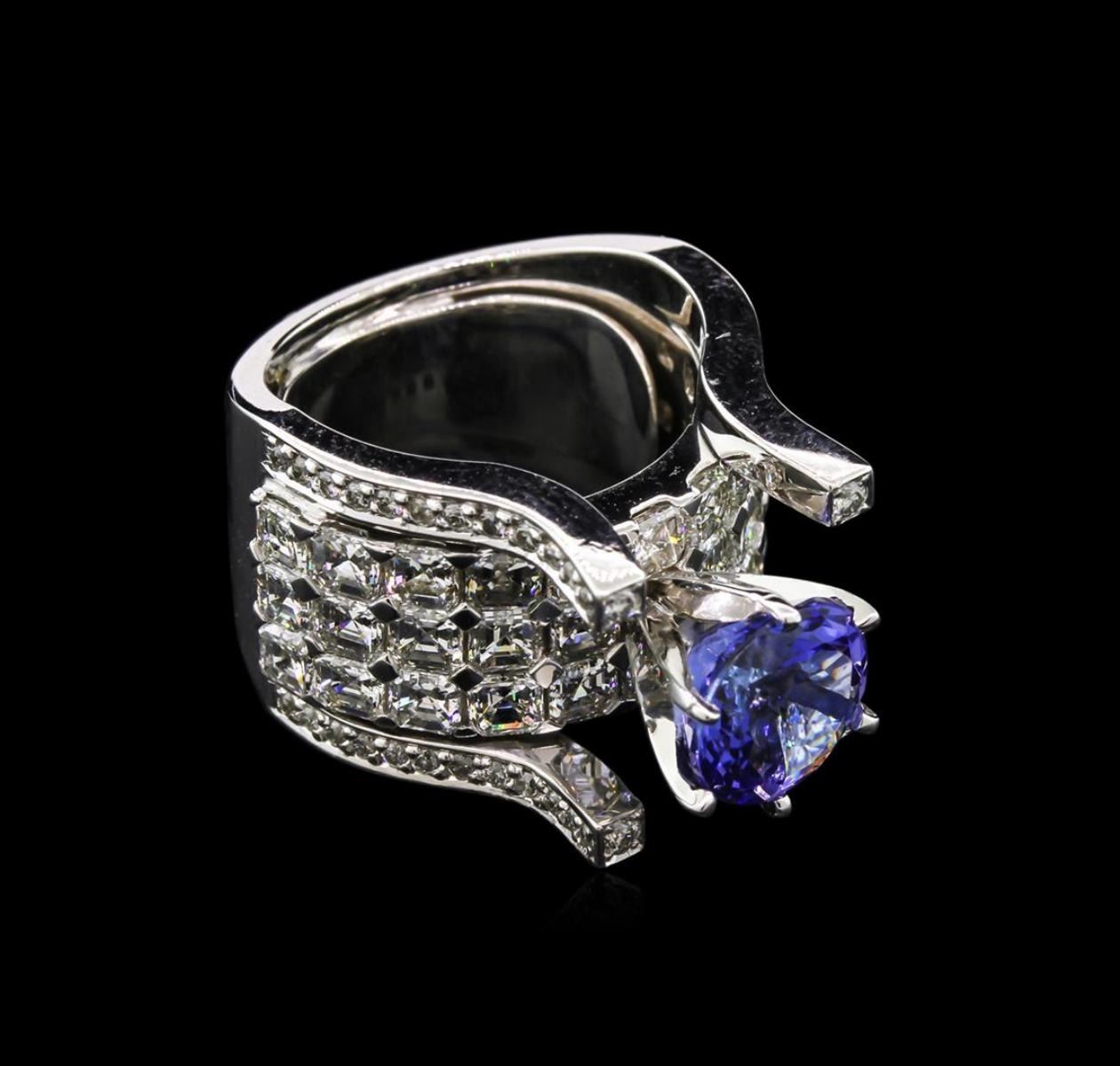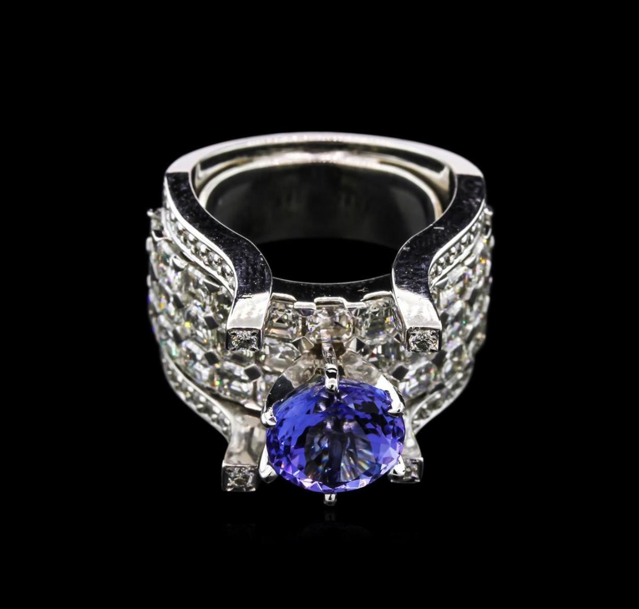 One electronically tested 14KT white gold lady's combination cast & assembled fashion ring with a bright polish finish. The featured lady's ring has a five diamond row wide band motif measuring 14 millimeters wide with a shank measuring 8.65 millimeters in width. The featured lady's ring also has a wing-guard soldered to the inside shank for adjustable sizing. Condition is new, good workmanship. Containing: One prong set round modified brilliant cut natural tanzanite, measuring 8.60 - 8.57 x 5.58 mm, approximate weight of 2.75ct., clarity is eye clean, type I, medium, very slightly grayish, bluish violet color, (GIA bV 5/3), cut is very good. Transmitting light with no distortion, transparent. Colored gemstones are presumed to have been subjected to commonly used enhancement processes. Graded in the setting. Thirty-Two prong set square emerald cut diamonds, measuring 3.00 x 2.90 x 1.80mm (depth est.) approximate total weight of 32 Stones = 4.00 ct. Graded in the setting. Clarity: VS-1 to VS-2. Color: G - I. Cut Very Good Forty-Eight bead set round brilliant cut diamonds, measuring 1.30 - 1.20 x 0.81mm (depth est.) approximate total weight of 48 Stones = 0.37ct. Graded in the setting. Clarity: SI-1 to SI-2. Color: G - Good Four prong set round brilliant cut diamonds, measuring 1.60 - 1.50 x 0.93mm (depth est.) approximate total weight of 4 Stones = 0.05ct. Graded in the setting. Clarity: VS-2 to SI-1. Color: G - Good. Total Weight of Colored Stones 2.75ct. Total Weight of Diamonds 4.42ct. Total Weight of Ring 19.80gm. GAS Appraised.