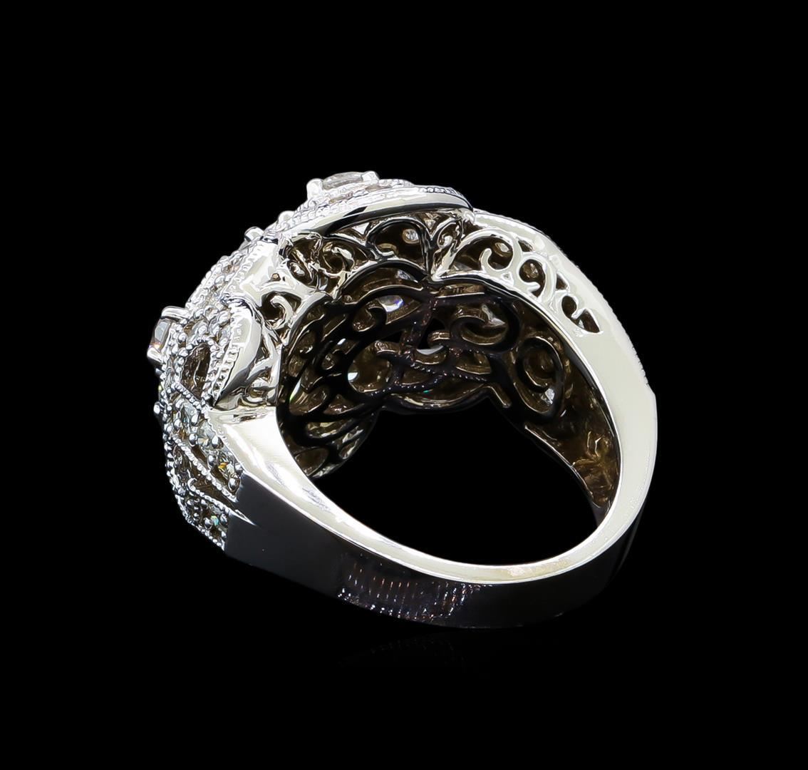 One electronically tested 14KT white gold lady's cast fashion ring with a swirl wide dome with a bright polish with milgrain detailing finish. The featured lady's ring has a shank measuring 3.60 millimeters in width. Identified with markings of "14K". Condition is new, good workmanship. Containing: One prong set round brilliant cut diamond, measuring 3.60 - 3.50 x 2.20mm (depth est.) approximate weight of 0.18ct. Graded in the setting. Clarity: I-1. Color: Good Seven prong set round brilliant cut diamonds, measuring 3.30 - 3.00 x 1.96mm (depth est.) approximate total weight of 7 Stones = 0.81ct. Graded in the setting. Clarity: VS-2 to SI-2. Color: H - I. Cut Good Fifty prong set round brilliant cut diamonds, measuring 2.10 - 2.00 x 1.27mm (depth est.) approximate total weight of 50 Stones = 1.60ct. Graded in the setting. Clarity: SI-1 to SI-2. Color: H - I. Cut Good Eleven prong set round brilliant cut diamonds, measuring 1.60 - 1.50 x 0.96mm (depth est.) approximate total weight of 11 Stones = 0.18ct. Graded in the setting. Clarity: SI-1 to SI-2. Color: H - I. Cut Good. Total Weight of Diamonds 2.77ct. Total Weight of Ring 11.20gm. GAS Appraised.