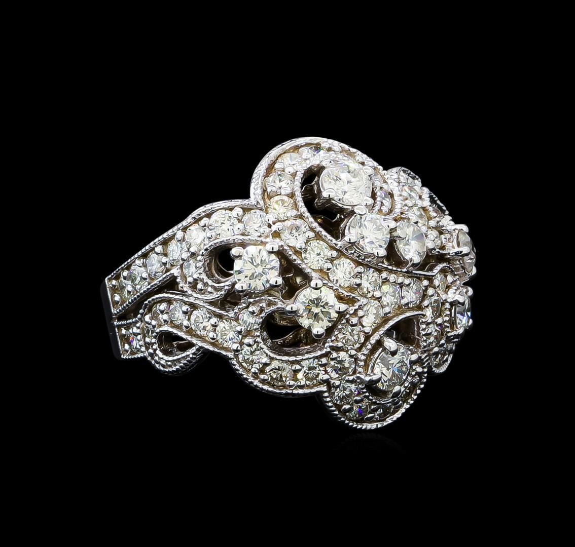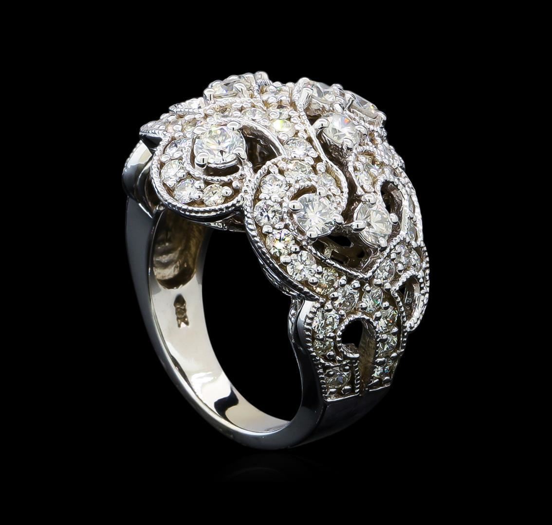 One electronically tested 14KT white gold lady's cast fashion ring with a swirl wide dome with a bright polish with milgrain detailing finish. The featured lady's ring has a shank measuring 3.60 millimeters in width. Identified with markings of "14K". Condition is new, good workmanship. Containing: One prong set round brilliant cut diamond, measuring 3.60 - 3.50 x 2.20mm (depth est.) approximate weight of 0.18ct. Graded in the setting. Clarity: I-1. Color: Good Seven prong set round brilliant cut diamonds, measuring 3.30 - 3.00 x 1.96mm (depth est.) approximate total weight of 7 Stones = 0.81ct. Graded in the setting. Clarity: VS-2 to SI-2. Color: H - I. Cut Good Fifty prong set round brilliant cut diamonds, measuring 2.10 - 2.00 x 1.27mm (depth est.) approximate total weight of 50 Stones = 1.60ct. Graded in the setting. Clarity: SI-1 to SI-2. Color: H - I. Cut Good Eleven prong set round brilliant cut diamonds, measuring 1.60 - 1.50 x 0.96mm (depth est.) approximate total weight of 11 Stones = 0.18ct. Graded in the setting. Clarity: SI-1 to SI-2. Color: H - I. Cut Good. Total Weight of Diamonds 2.77ct. Total Weight of Ring 11.20gm. GAS Appraised.